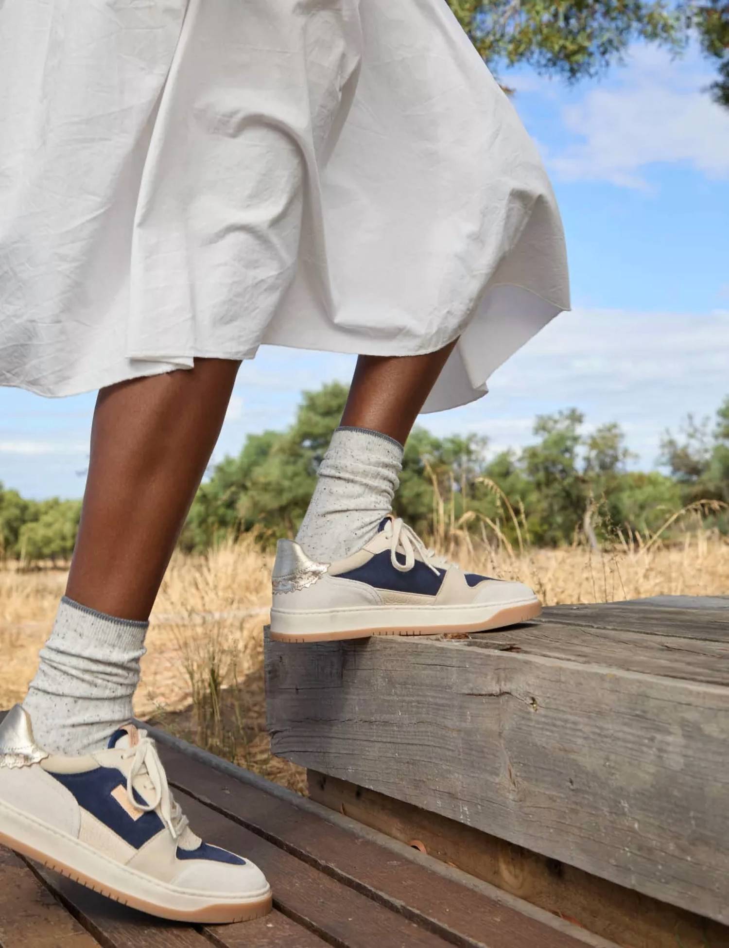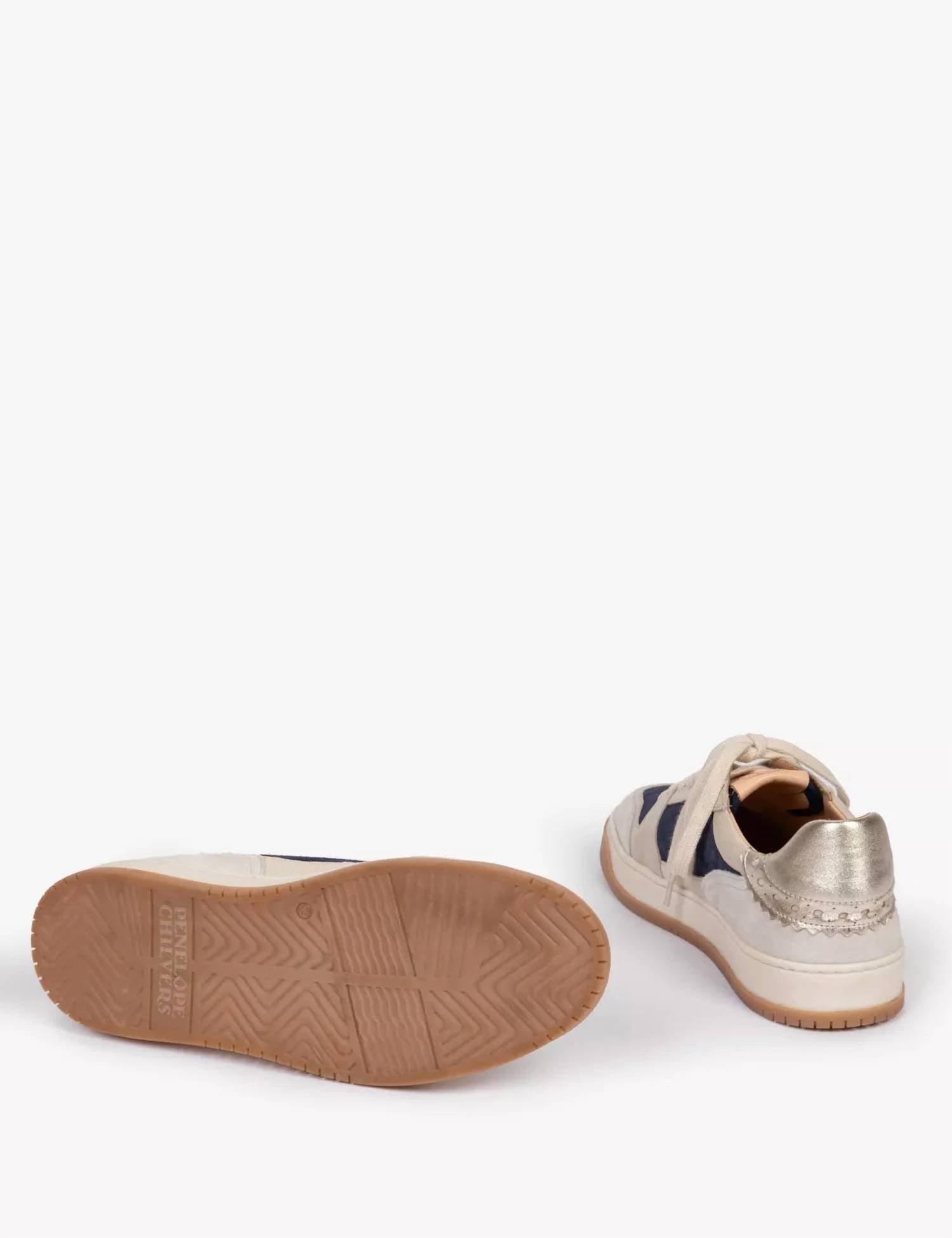 Stylish, comfortable and supportive. These athletic sneakers check all of the boxes. Introducing the Women's Pintado Leather Trainer by PENELOPE CHILVERS, a perfect blend of chic and comfort, ideal for both day-long wear and evening outings. Crafted from premium leather, these trainers feature a sophisticated round toe design. With the signature scallop leather detailing on the heel, they bring a unique touch of elegance to any fall outfit. Available in a stylish navy color, they are your go-to choice for travel or Thanksgiving gatherings.