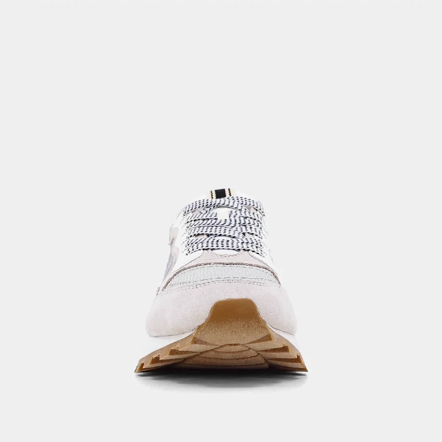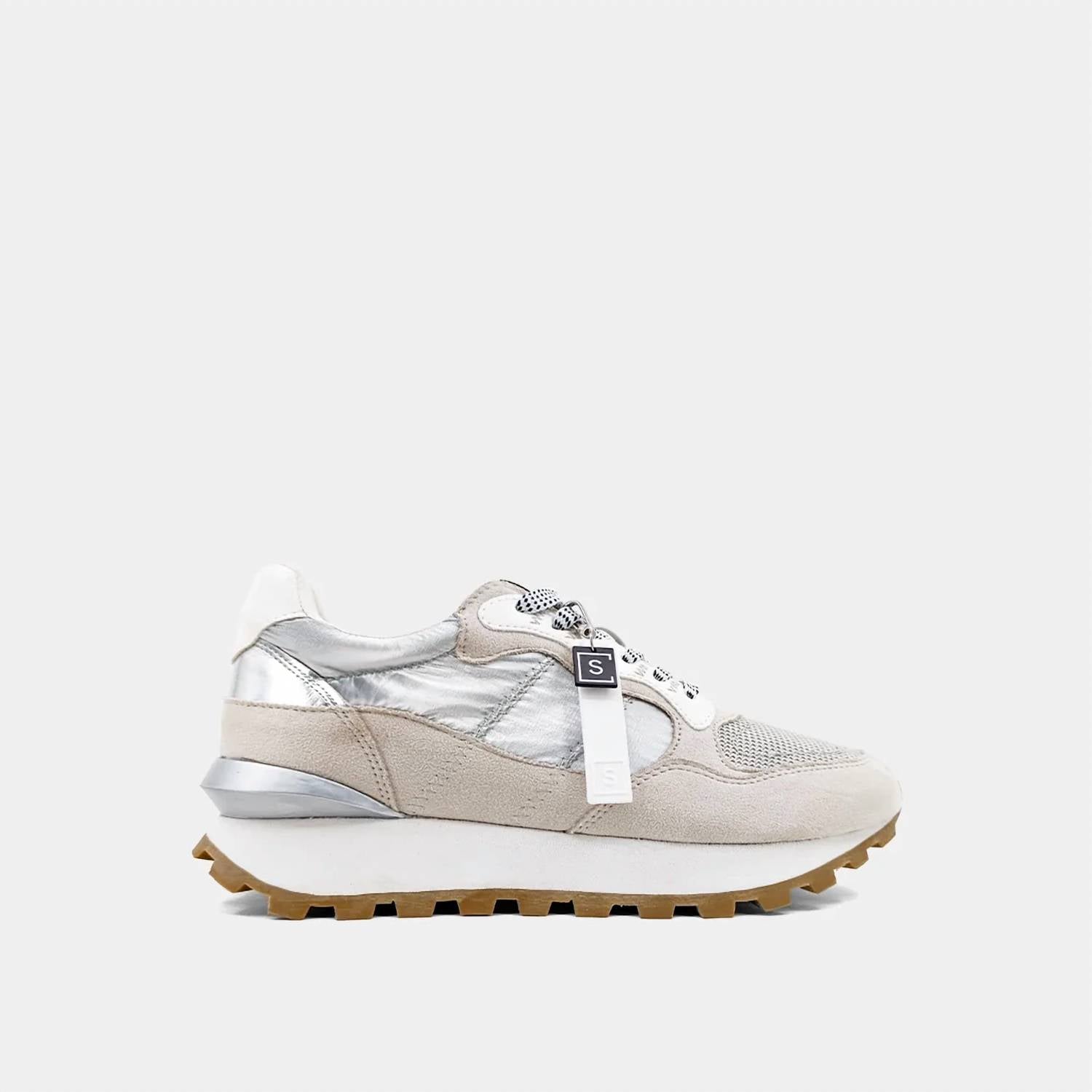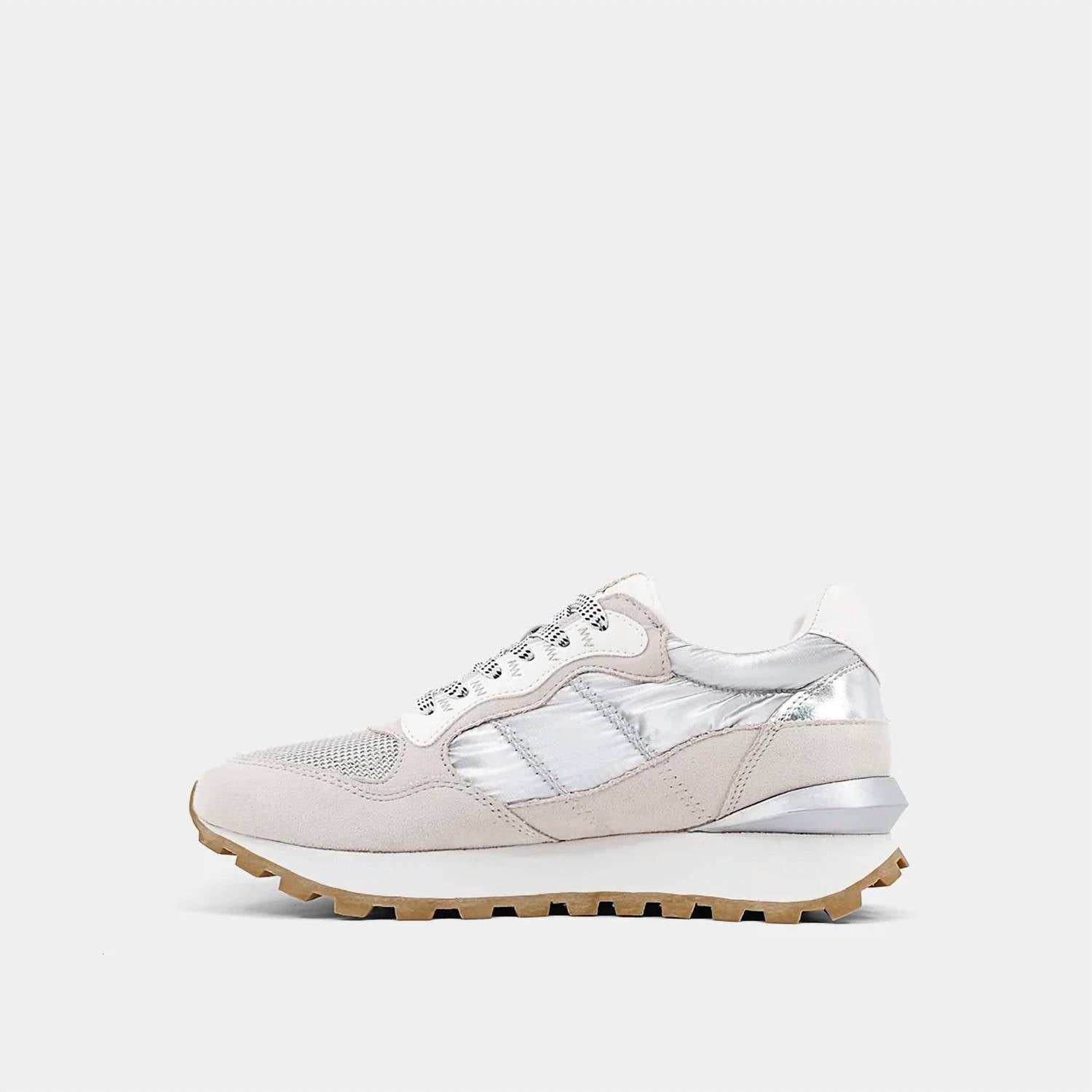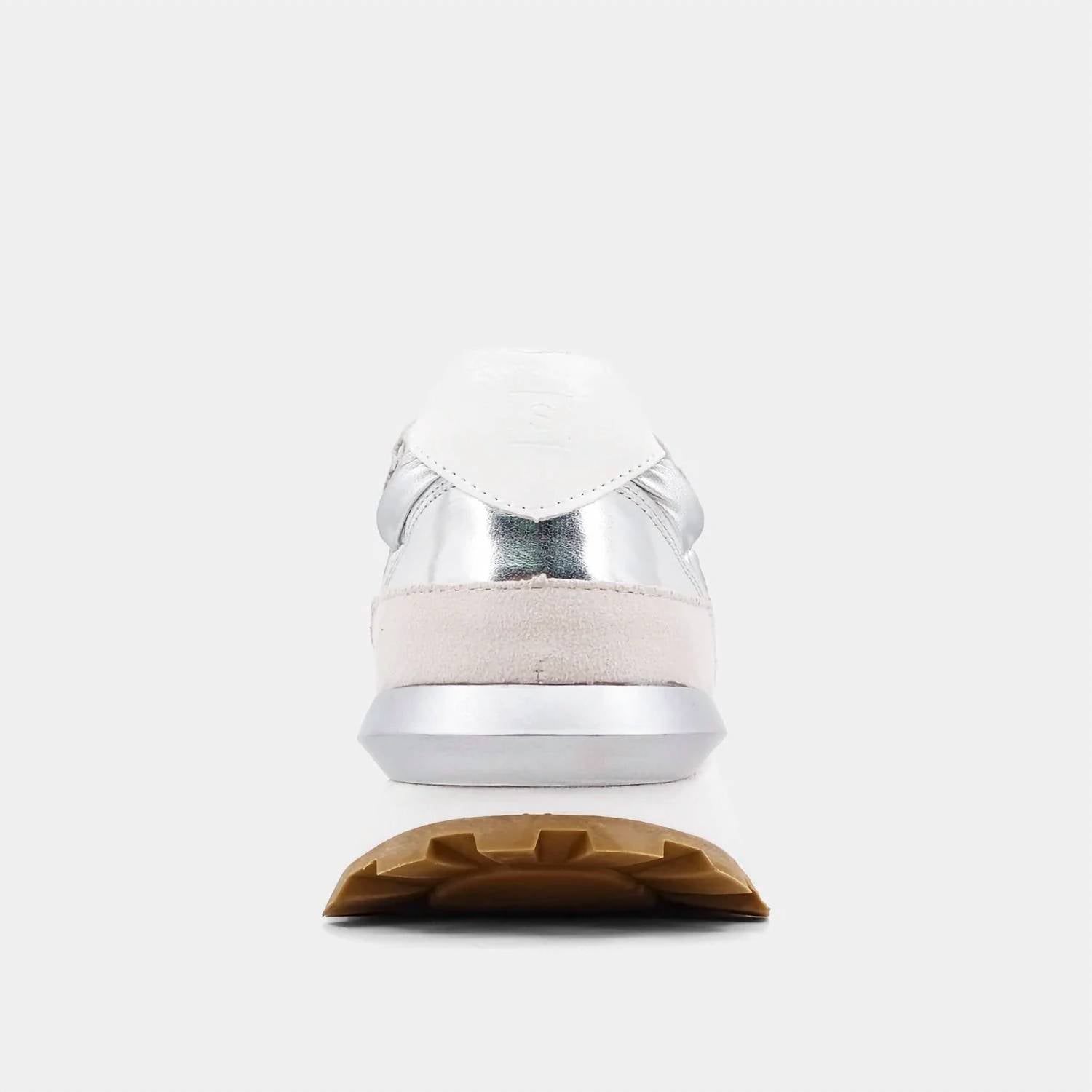 Stylish, comfortable and supportive. These athletic sneakers check all of the boxes. Elevate your fitness wardrobe with the Women's Phoebe Running Shoes by SHU SHOP, designed for those who appreciate a nod to 90s sneaker style. Crafted from a blend of faux leather, fabric, and rubber, these athletic shoes feature a unique silver colorway. The platform heel and round toe shape offer retro-inspired athleisure vibes, perfect for fitness and workout occasions. Ideal for the spring season, they provide great support and comfort with a serrated outsole for a steady stride.