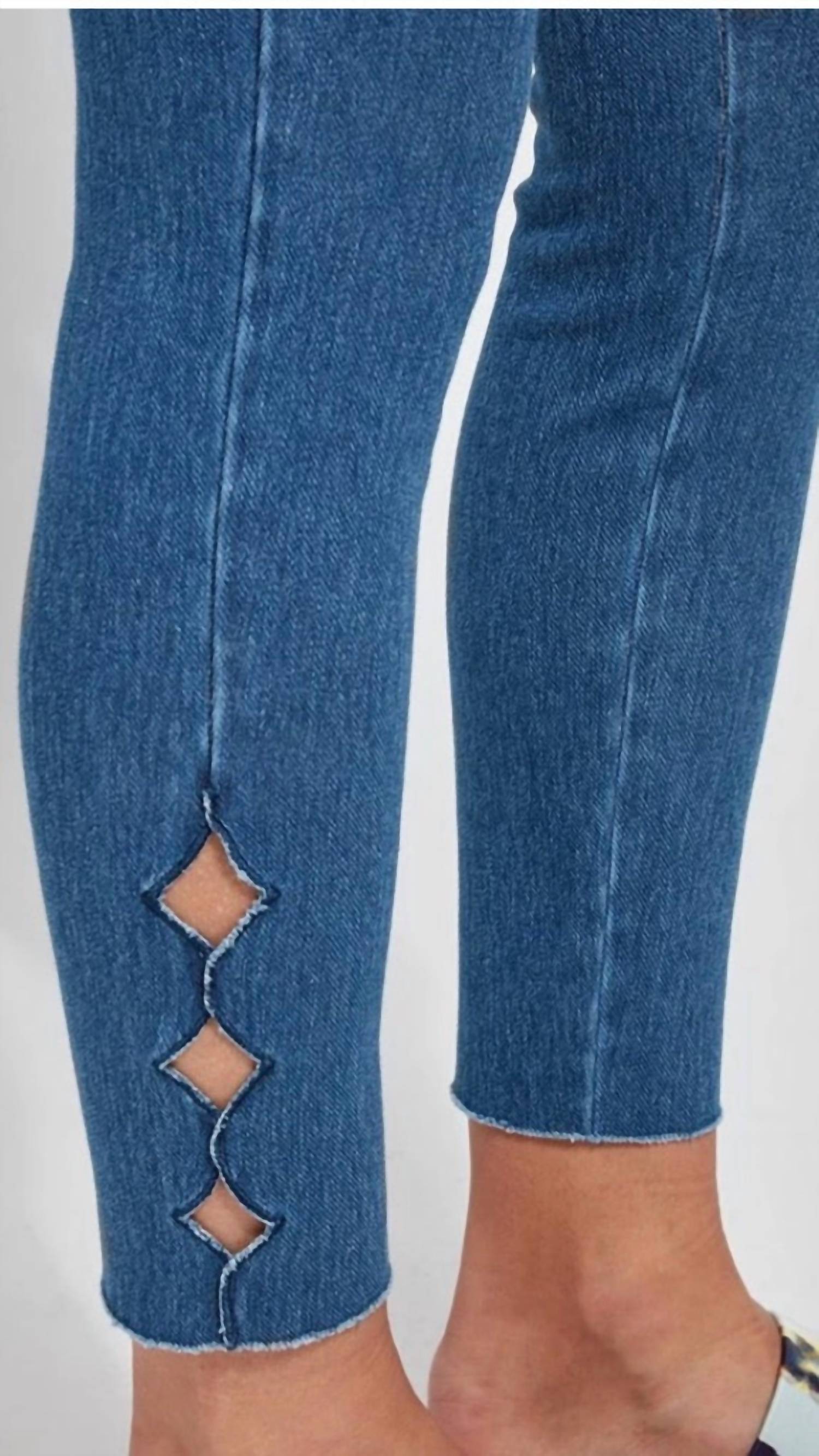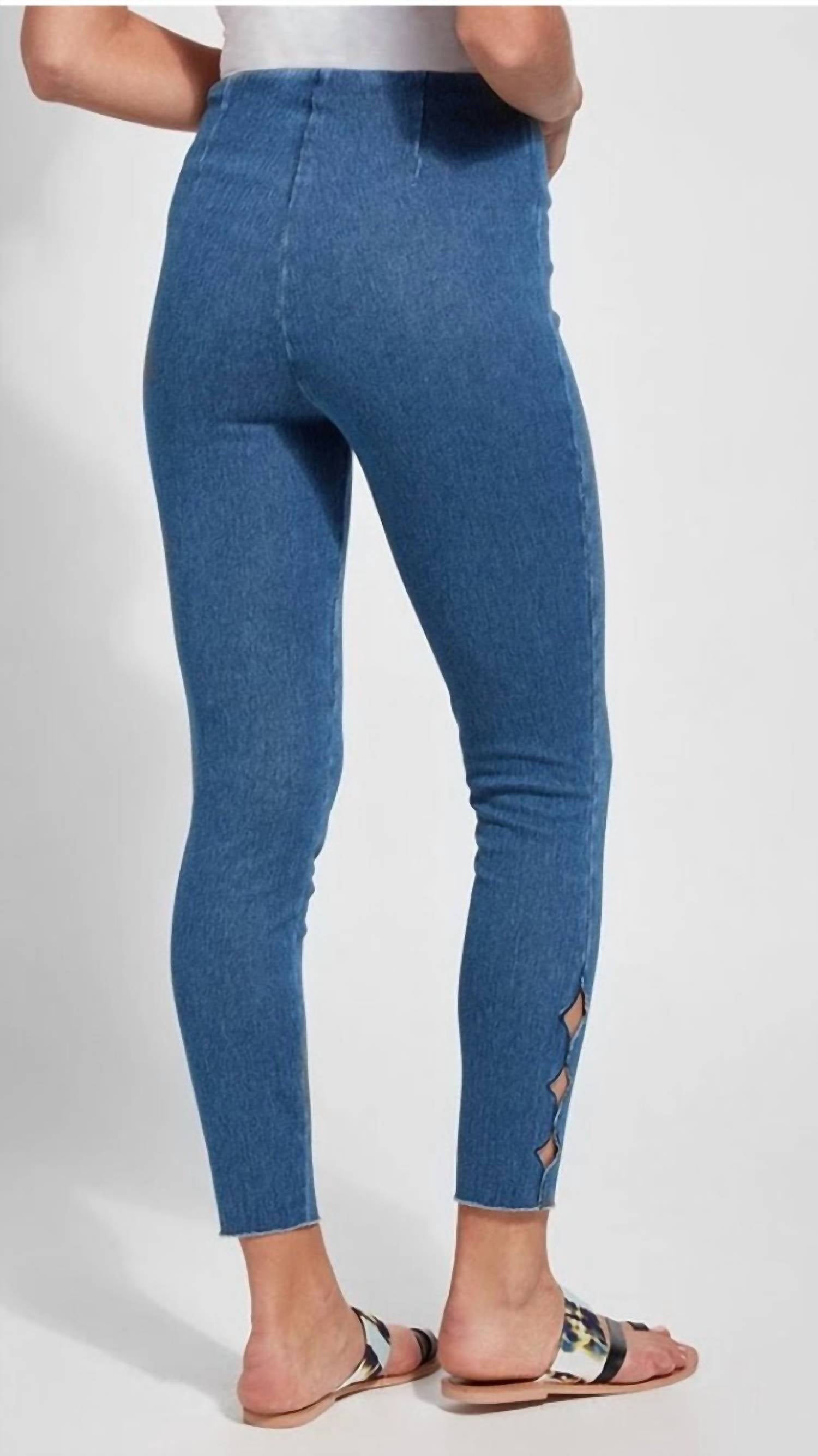 You'll be reaching for this best-selling legging all season long. Discover the Lysse Side Scallop Ankle Crop Leggings in Mid Wash, a chic choice for travel. With a full-length, body-hugging fit and made from a 95% Cotton, 5% Spandex knit denim, these leggings offer Lycra's 4-way stretch for unmatched comfort. Featuring a scallop ankle detail, pull-on closure, and Lyssé's concealed patented waistband, they promise a flattering silhouette. Care for them with ease through machine wash; inseam measures 26.5 inches.