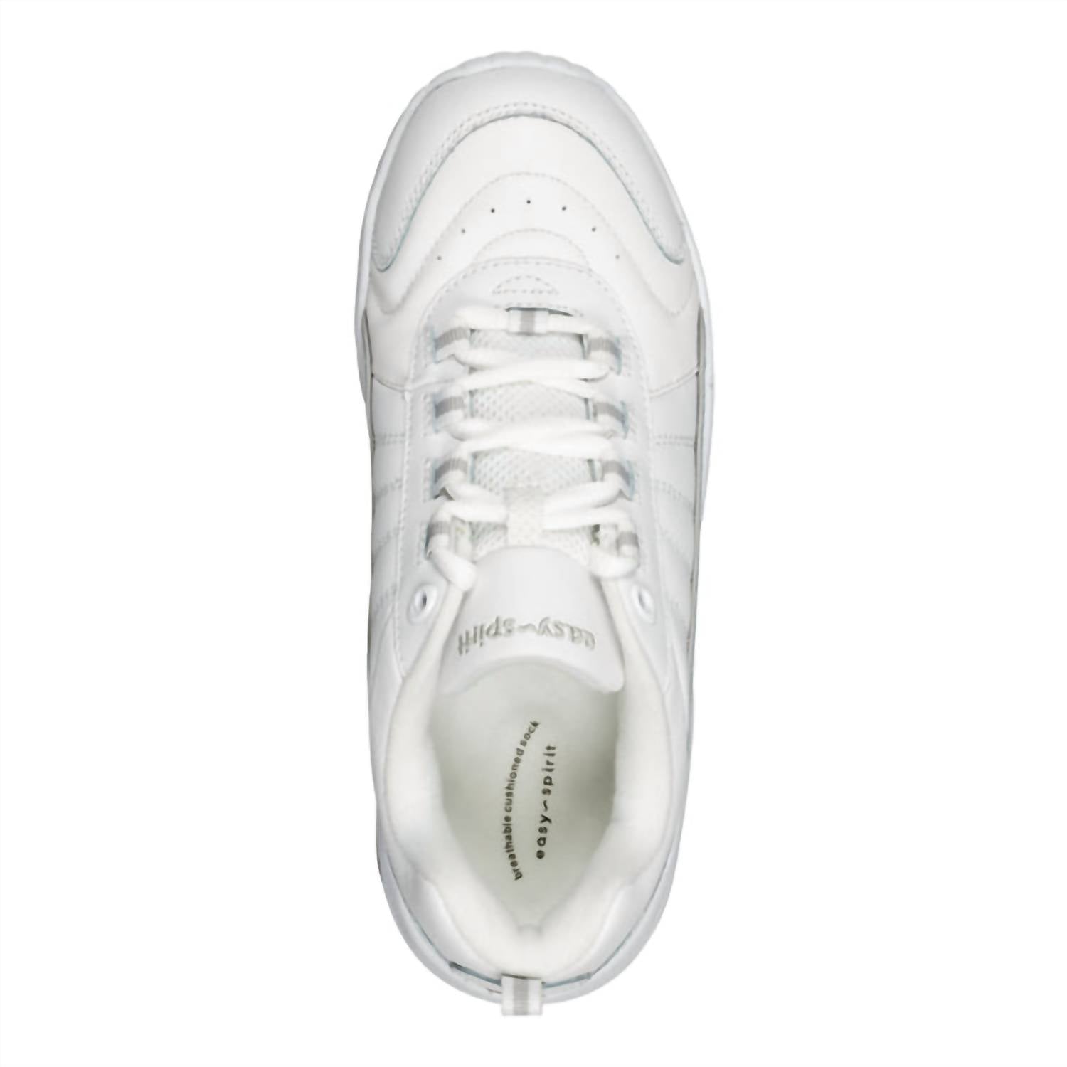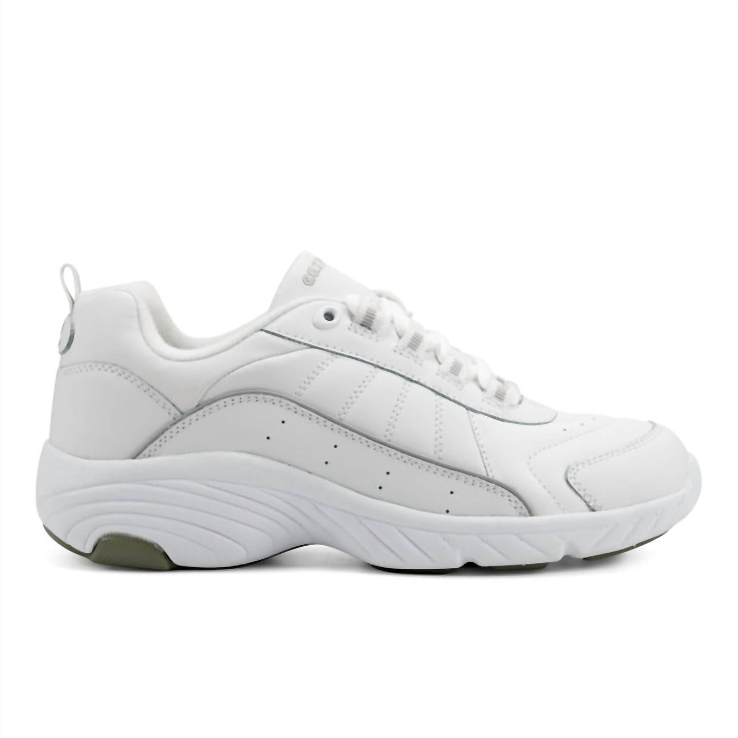 Workout in style with these adorable athletic sneakers. Experience ultimate comfort and style with the Women's Punter Athletic Shoes by Easy Spirit, available in White/Light Grey. These shoes feature a leather upper with perforated details for breathability and a super padded collar for support. Designed with a 1.77" heel and a round toe, they boast a foam-padded shock-absorbing midsole and ultra-soft fabric linings. Closure is achieved with a full lace-up style, and the outsole is crafted from durable rubber.