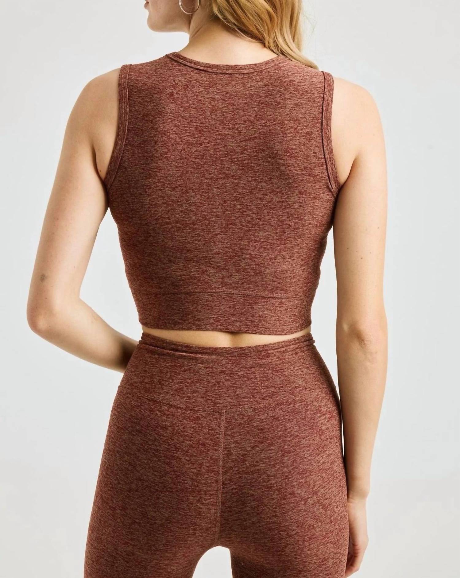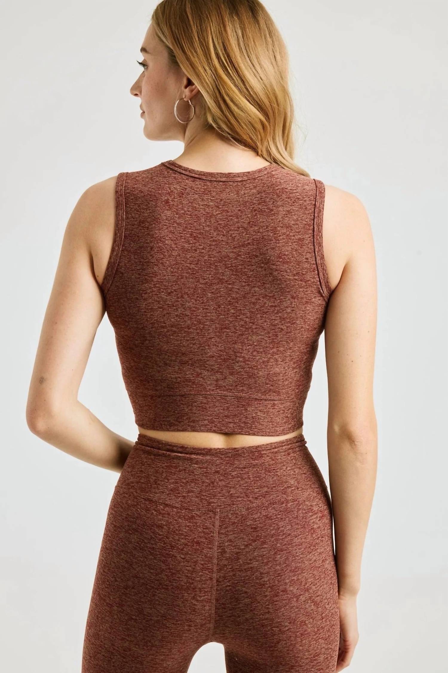 A sports bra that has it all - style, function and support. Discover the Nikki Sports Bra by YEAR OF OURS, an athleisure staple in a vibrant Red Rock hue. Featuring a high crew neck and crop tank cut, this medium-impact bra combines function and style with its cute front opening detail. Made in the USA, it offers moisture-wicking capability, and a compression fit thanks to its stretch active jersey material comprising 87% polyester and 13% spandex. For care, simply machine wash cold and lay flat to dry, ensuring lasting durability and comfort.
