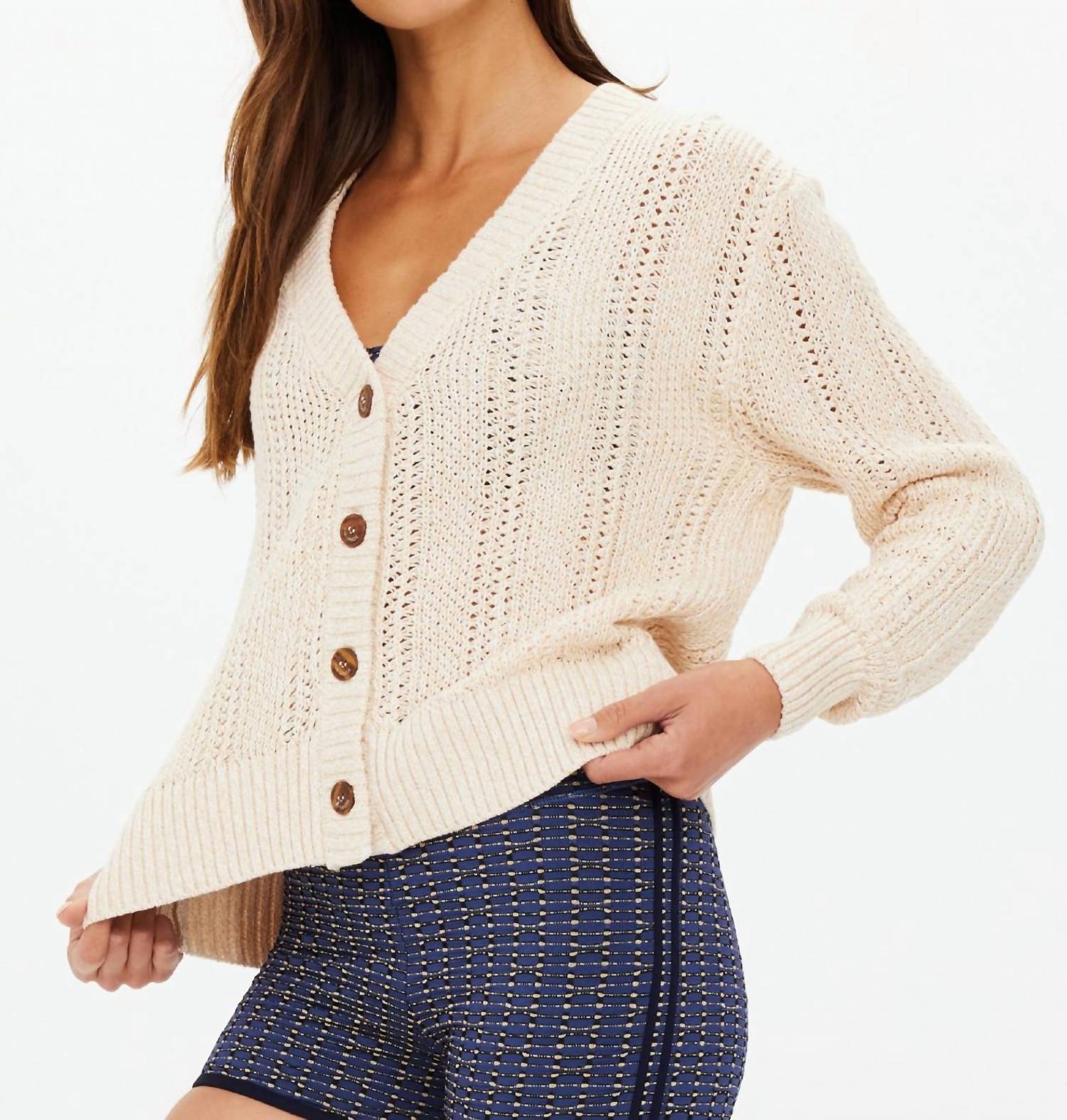 Throw this adorable cardigan over any cami or tank top. Embrace comfort and style with THE UPSIDE Drew Cotton Knit Cardigan, perfect in a two-tone natural shade. This women's cardigan showcases a relaxed shape with long sleeves in a lightweight semi open knit, crafted entirely from 100% organic cotton. The textured design features branded tortoiseshell buttons and a subtle arrow logo pip on the sleeve cuff, adding to its minimalist appeal. For care, hand wash with similar colors and dry flat in the shade to maintain its cozy texture.