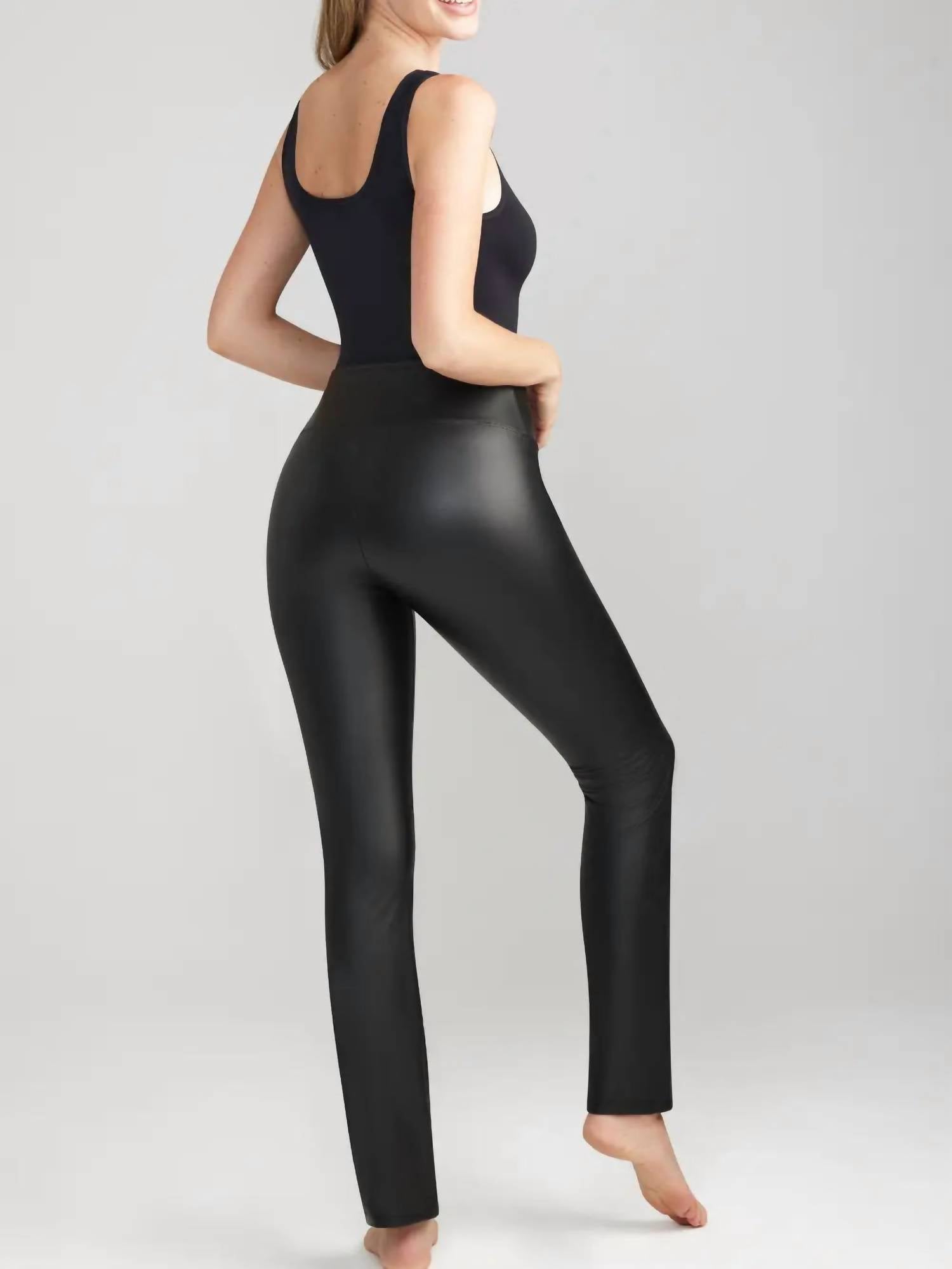 Leggings you can dress up or down for any occasion. Elevate your wardrobe with Yummie's Faux Leather Shaping Bootcut Leggings in sleek black. These leggings feature an hourglass shaped 2-ply signature waistband, offering 360° of shaping from waist to ankle, with a unique design that provides tummy control and a lift in the rear. Crafted from 4-way stretch faux leather for maximum comfort, they are perfect for achieving a polished look. Closure: Pull-on style. Total inseam length is 27 1/2".