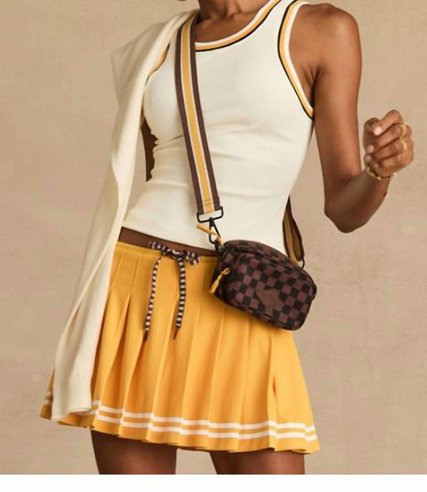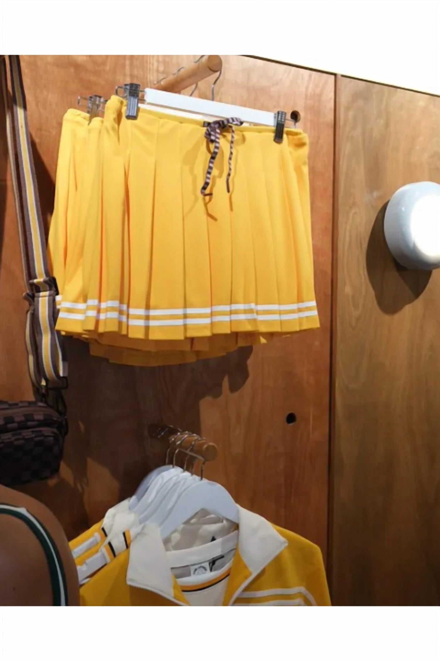 Show just the right amount of leg in this fit flattering mini. Introducing the Prix Quinny Pleated Skirt by THE UPSIDE, a lively piece crafted from 100% recycled polyester in vibrant mimosa yellow. Designed as a playful mini skirt, it features printed cream stripes at the hem and an elasticated stripe drawcord at the waist for a customizable fit. Practical inner spin shorts with pockets make it ideal for active or casual summer days. Care is straightforward with a cold machine wash alongside similar colors.