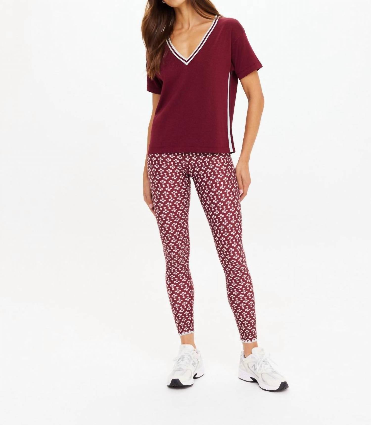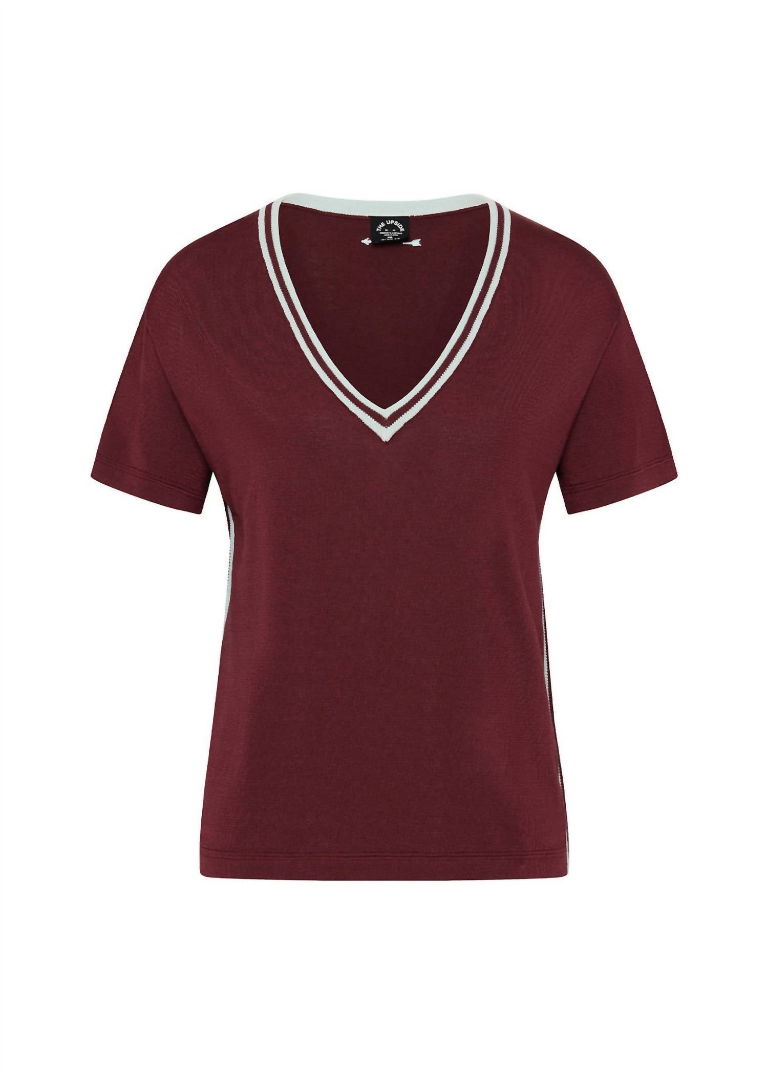 The short sleeve tee you'll want in every color. Elevate your holiday party look with the Sienna V-neck Tee by THE UPSIDE, crafted in a rich Merlot hue. This short sleeve tee combines retro athletic vibes with modern sophistication, featuring a deep V-neckline and a contrast mint and burgundy rib. Made from a cotton blend knit, this lightweight piece ensures comfort and style, while the pull-on closure adds ease. For care, simply machine wash and lay flat to dry.