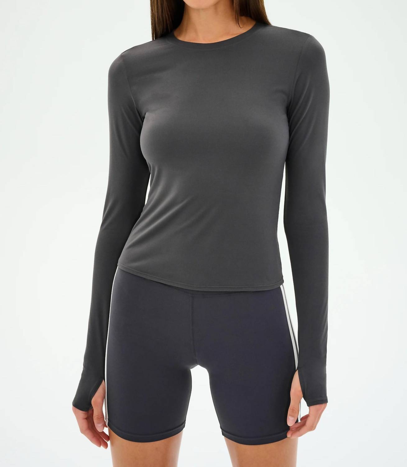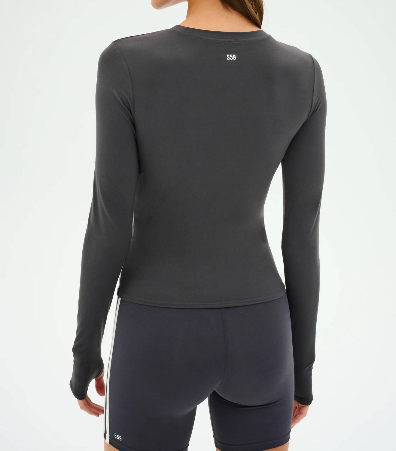 Great fit, cute design, soft fabric. You'll love everything about this long sleeve tee. Introducing the Airweight Lite Long Sleeve Waist Length by SPLITS59, a game-changer in graphite for your active wardrobe. This women's crewneck top features a long sleeve design made from a nylon blend fabric, boasting moisture-wicking and quick-dry properties for optimal performance. Perfect for spring workouts, from running to spin class, this solid, pull-on style redefines athleisure with its lightweight feel. Composition: 81% Nylon, 19% Spandex.