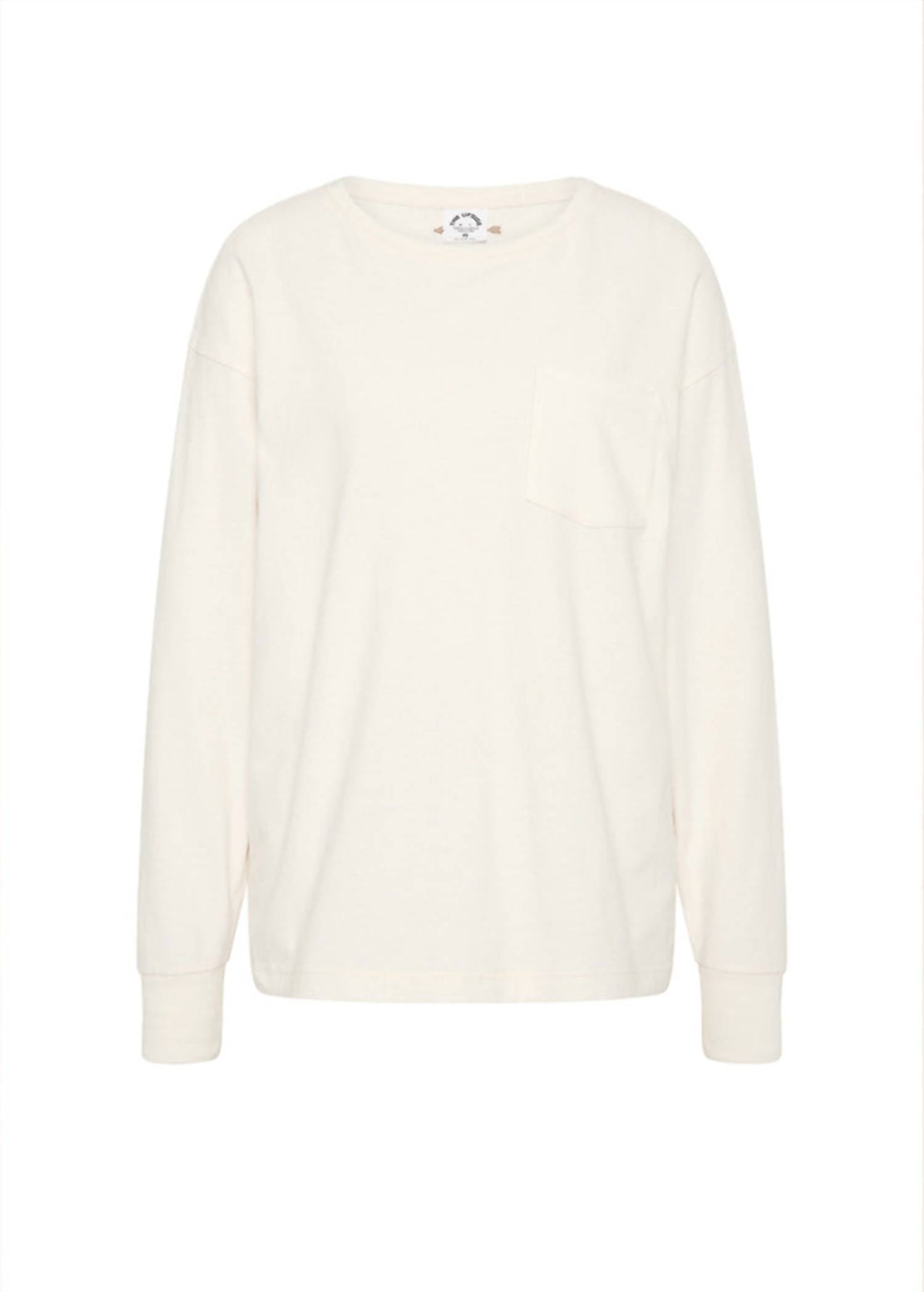 The perfect long sleeve tee that goes with just about anything. Elevate your vacation wardrobe with the Women's Soho Cara Long Sleeve Top by THE UPSIDE, featuring a relaxed silhouette for a laid-back yet stylish look. Crafted from soft brushed recycled cotton, this top in washed cream highlights long sleeves and a ribbed crewneck, complemented by ribbed cuffs. The design includes a patch pocket on the front and an embroidered arrow logo at the back, offering subtle yet distinct detailing. Closure: Pull-on. Perfect for streetwear trends this spring.