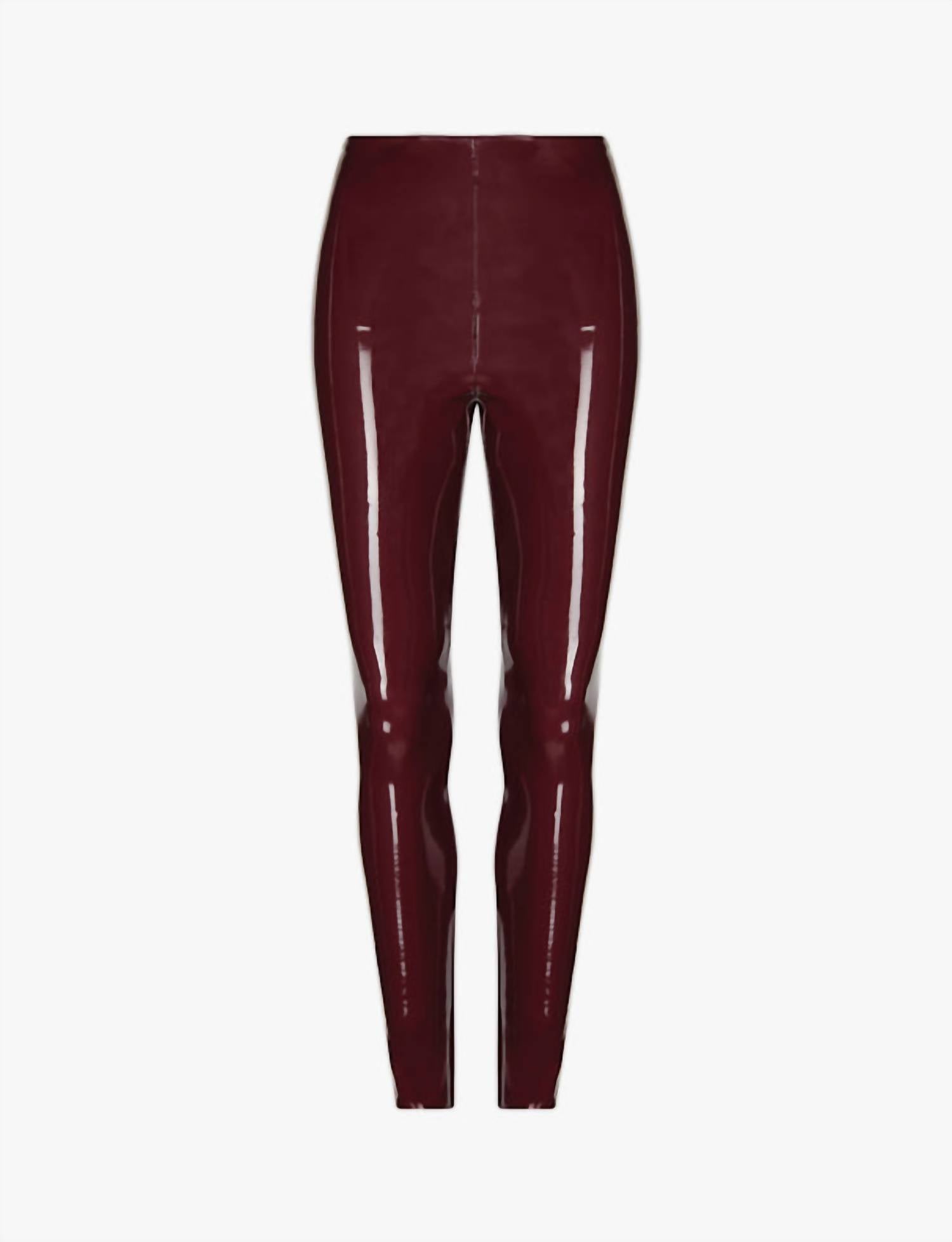 You'll be reaching for this best-selling legging all season long. Discover the sleek comfort of the Burgundy Faux Patent Leather Leggings by Commando, a stylish addition to your wardrobe perfect for a preppy, Holiday Party look. Crafted in the USA with a faux patent leather body (97% viscose, 3% elastane with polyurethane coating) Waistband (72% nylon, 28% elastane), these leggings feature a high rise and a slim fit with a skinny leg design. Closure: Pull on. Care: Machine wash, line dry. Experience all-day confidence with our internal waistband technology and smoothing, firming fabric, sized with a 29.375-inch inseam and an 11.75-inch rise, offering perfect stretch recovery.
