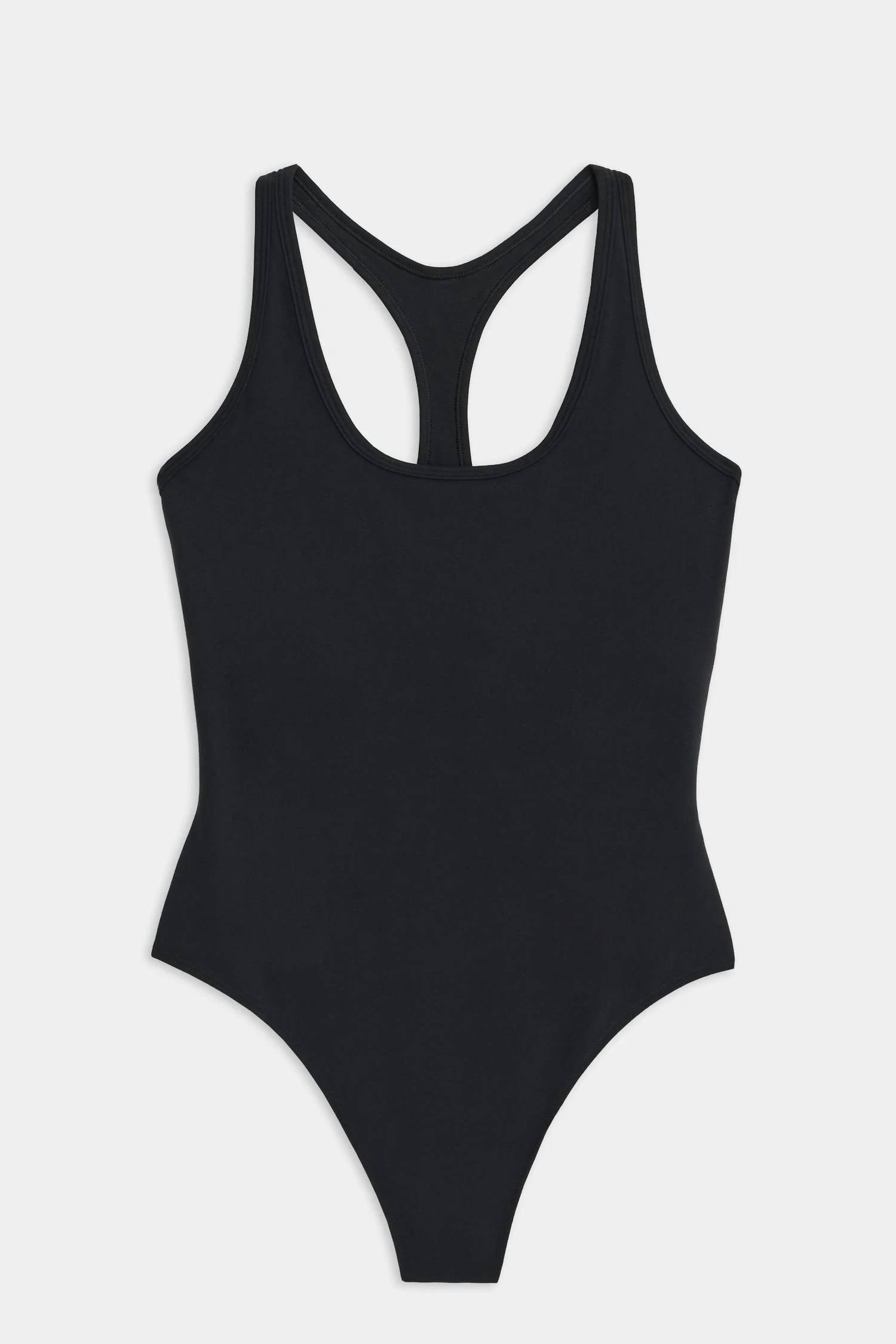 Form fitting and comfortable - this bodysuit check all of the boxes. Introducing the Suki Airweight Bodysuit by SPLITS59, crafted for ultimate comfort in a sleek black. This sleeveless bodysuit features a stylish scoop neckline, racerback, and no-show thong, perfect for layering with your favorite activewear. Made from an 81% nylon and 19% spandex blend, it boasts moisture-wicking and quick-dry technology for increased performance. Designed for those intense session, it slips on easily with a pull-on closure.