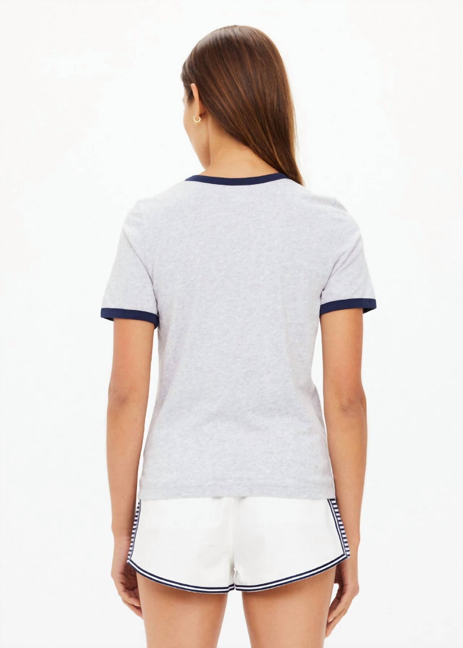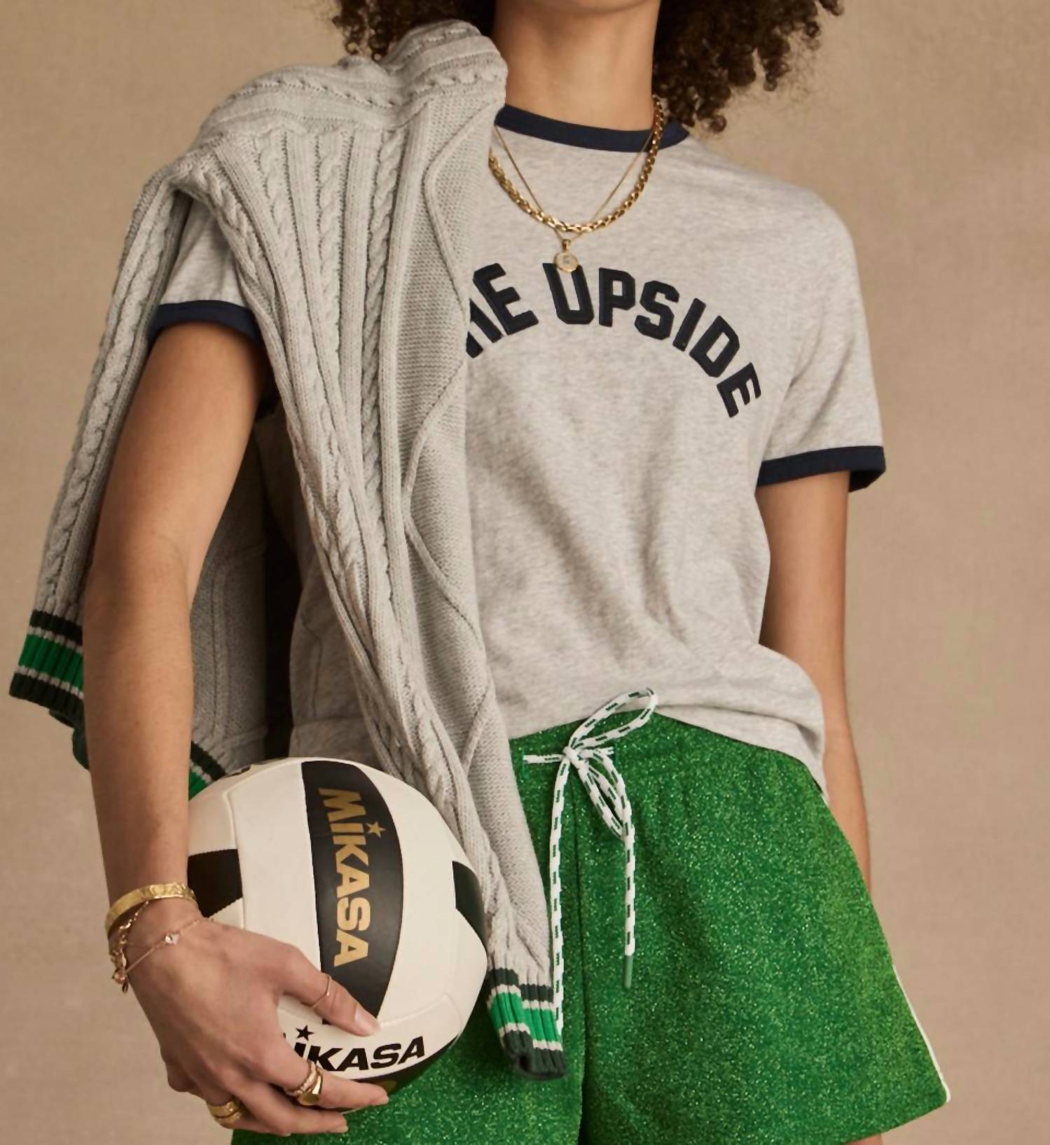 The short sleeve tee you'll want in every color. Introducing the Jarama Joy Tee by THE UPSIDE, a stylish piece for your athleisure collection. With short sleeves and crafted from organic cotton jersey, this grey marle tee features a retro-inspired design with contrast navy binds at the neck and sleeves. Its relaxed pull-on style showcases the brand's applique logo on the front chest, perfect for workouts or casual outings. Easy to care for with machine wash and line dry instructions, this tee brings both comfort and charm to your spring wardrobe.