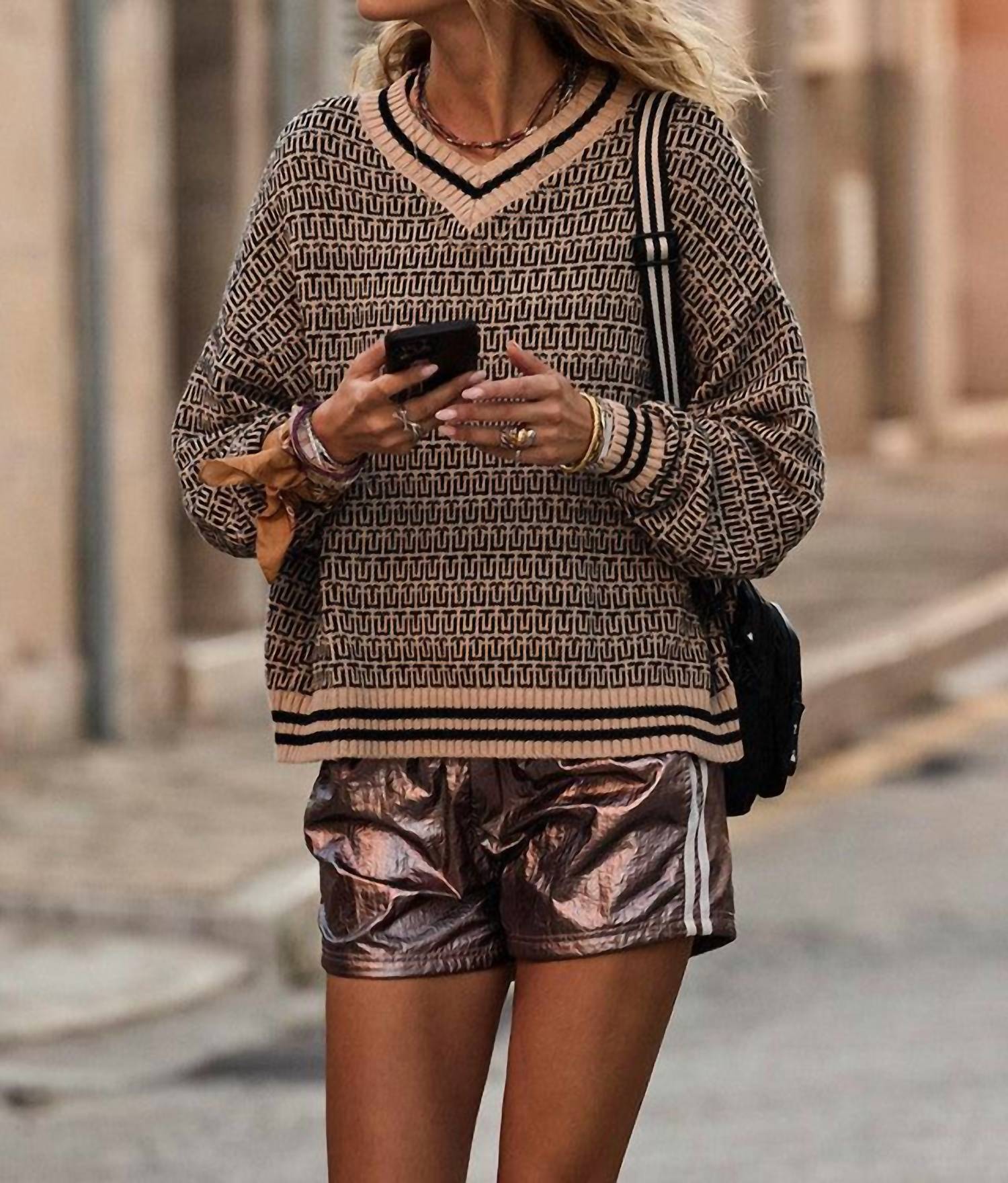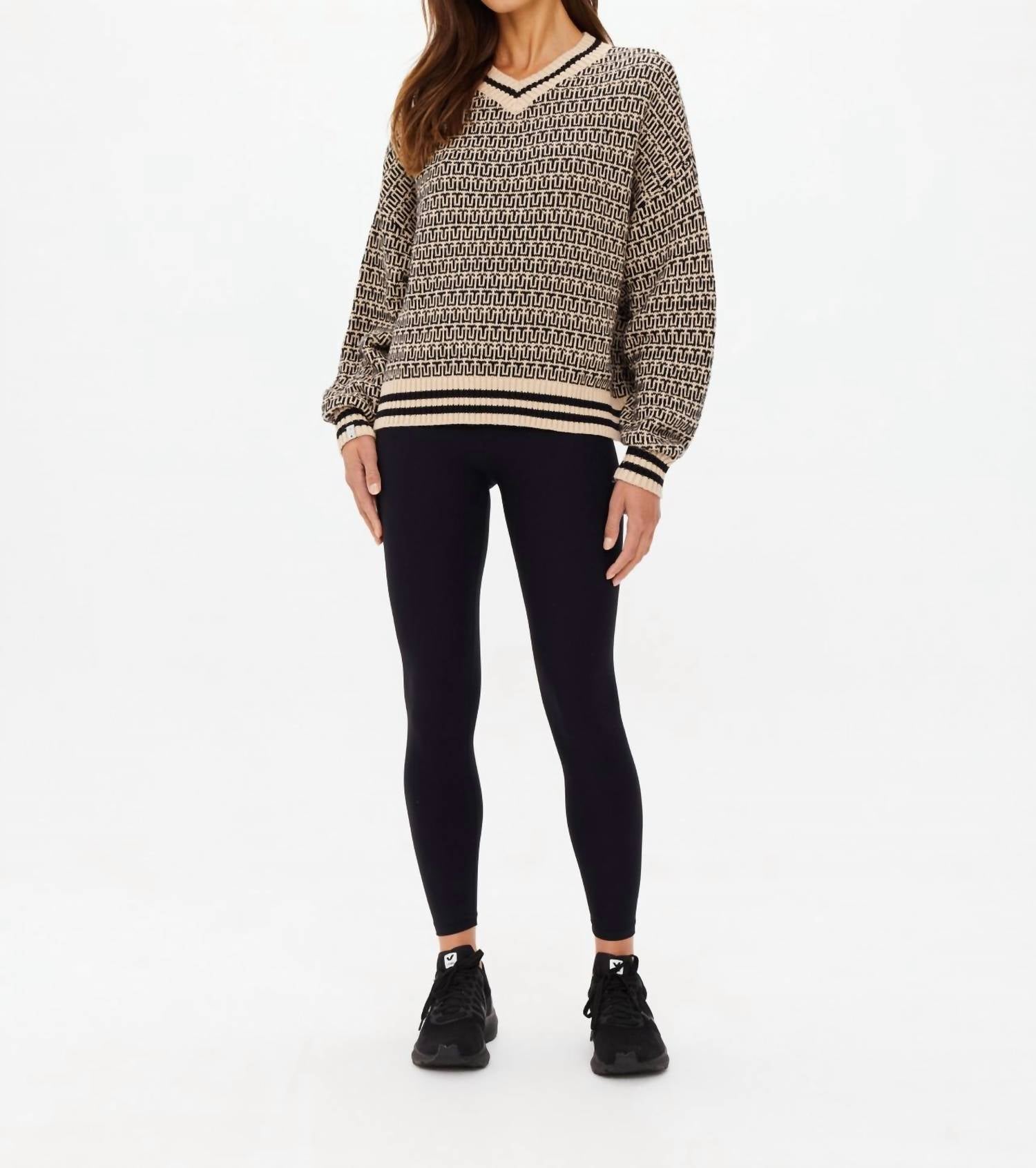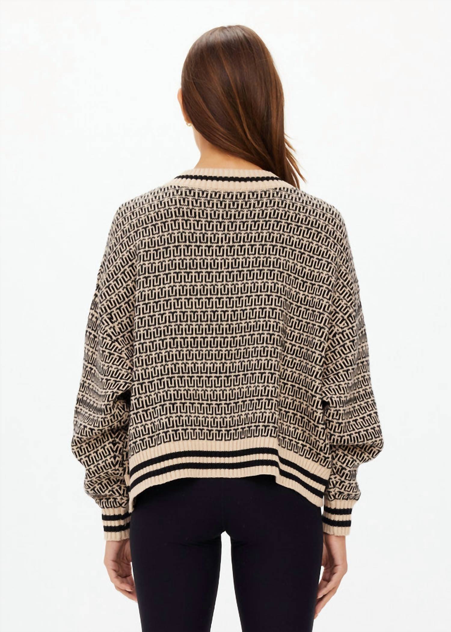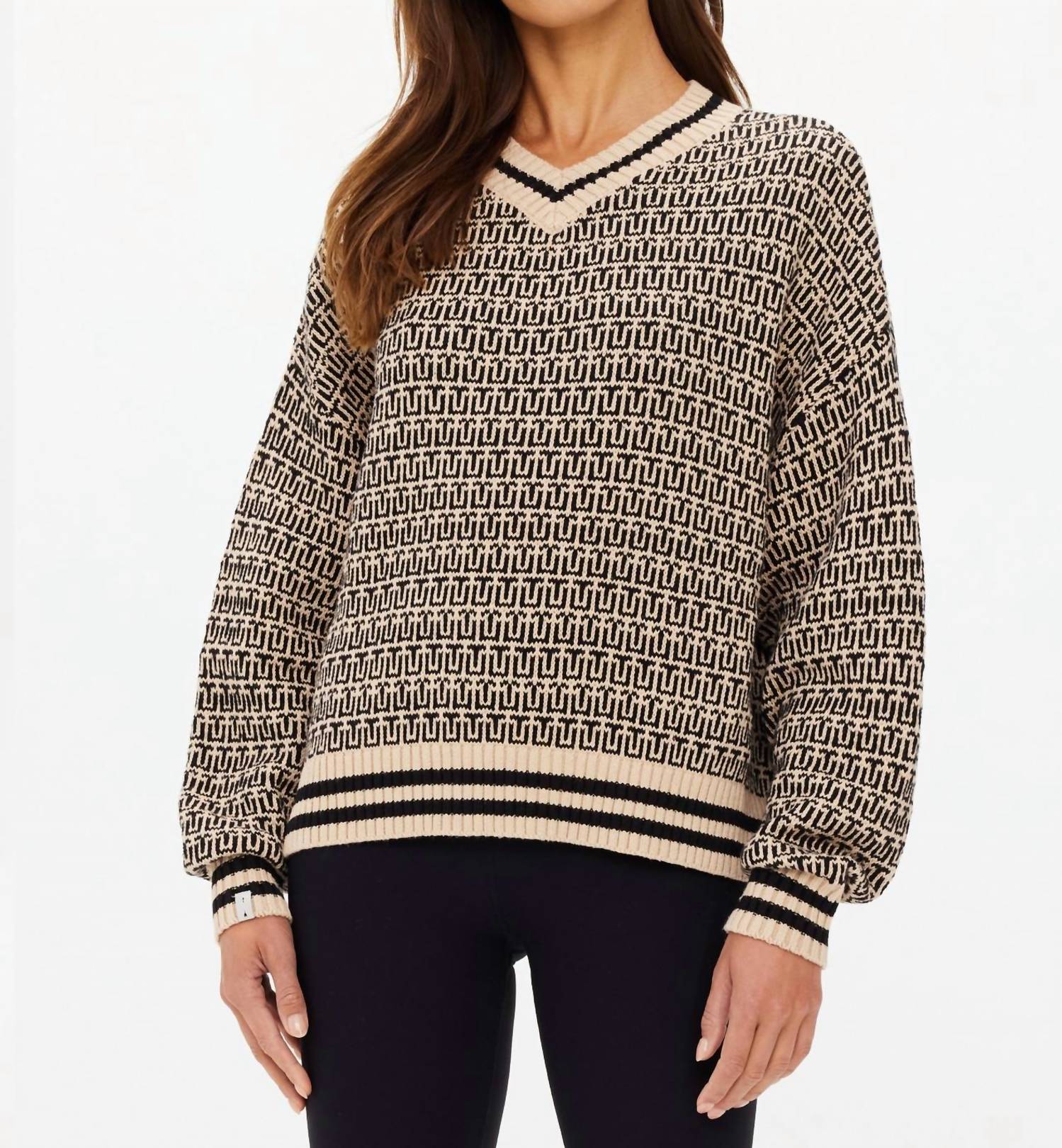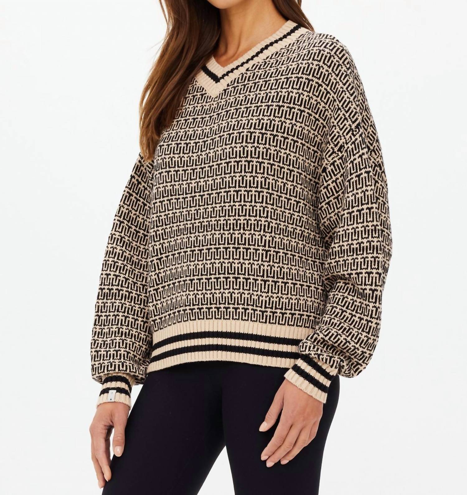 You'll be reaching for this comfy and classic v-neck sweater all season long. Elevate your wardrobe with THE UPSIDE's Castilla Millie Knit Sweater, perfect for a chic, relaxed style. This long sleeve sweater is made from 100% organic cotton, featuring a knit jacquard pattern with the 'TU' monogram design in a pebble hue. It sports a high V-neckline with striped rib and a pull-on closure for easy wear. Care for it with a cold gentle machine wash, avoid soaking or bleaching, and lay flat to dry. The model is wearing a size XS with dimensions: bust 134cm, hem 110cm, and front length 55cm.