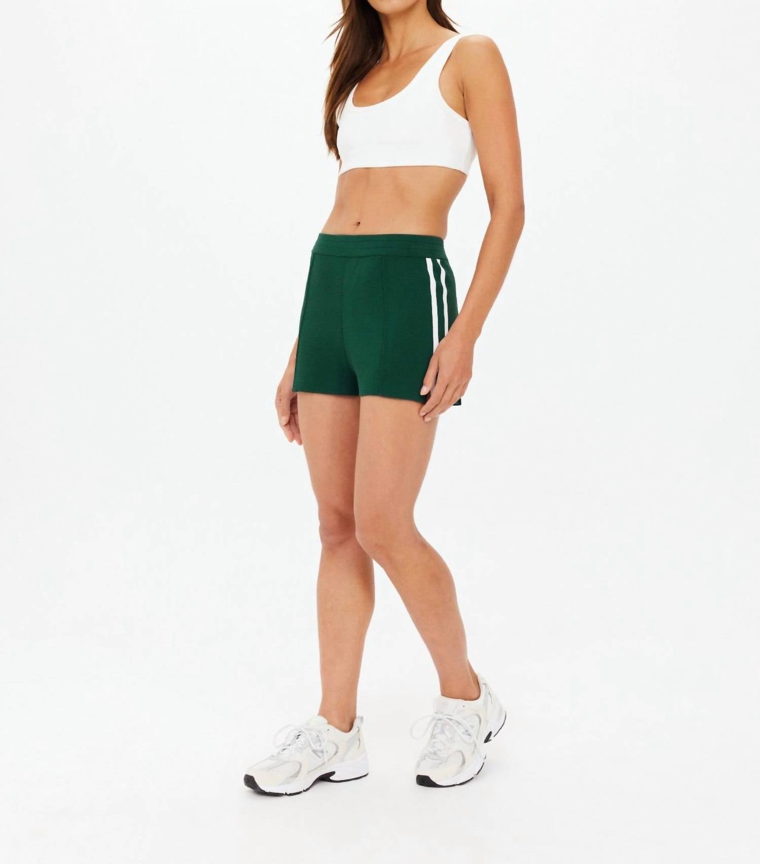 High-waist is here to stay and we especially love this style short. Elevate your athleisure wardrobe with the Les Bordes Bisou Knit Short by THE UPSIDE in a rich deep green hue. These mid-rise knitted shorts feature classic white side stripes and an elasticated waistband for comfort and style. Showcasing an embroidered tonal arrow logo at the back, these shorts are designed for women who appreciate a solid, sophisticated look. Closure: Pull on. Care: Machine wash and tumble dry.