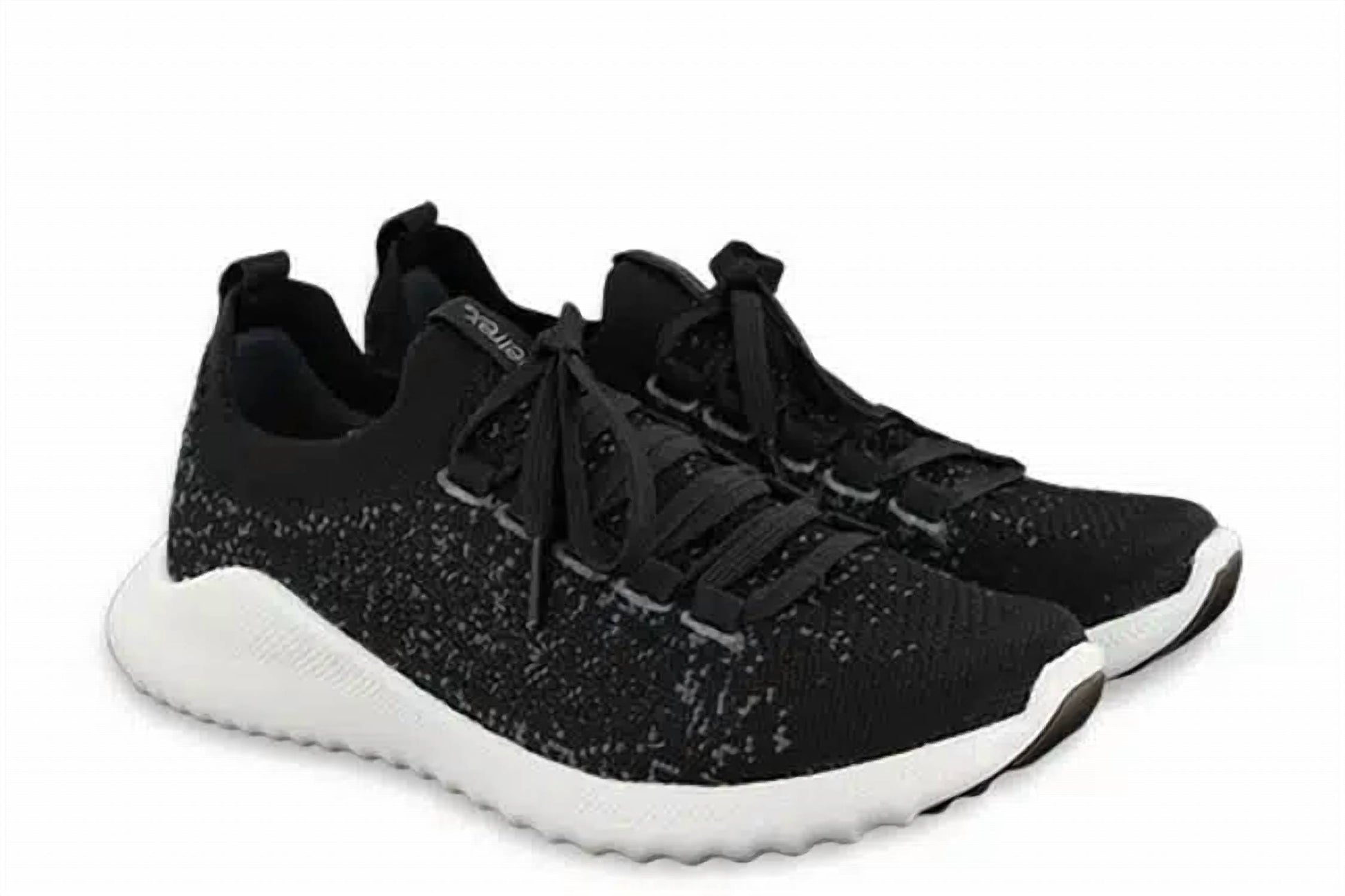 When fashion meets function. The Women's Carly Shoes by Aetrex in a classic black finish are perfect for stylish summer vacations. Designed with a round toe and flat heel, these low (1 1/4"-2") athletic shoes offer both comfort and a sleek, monochrome look. Ideal for women seeking functional fashion for their seasonal getaways. Embrace the effortless elegance and support these shoes provide, making each step a breeze.