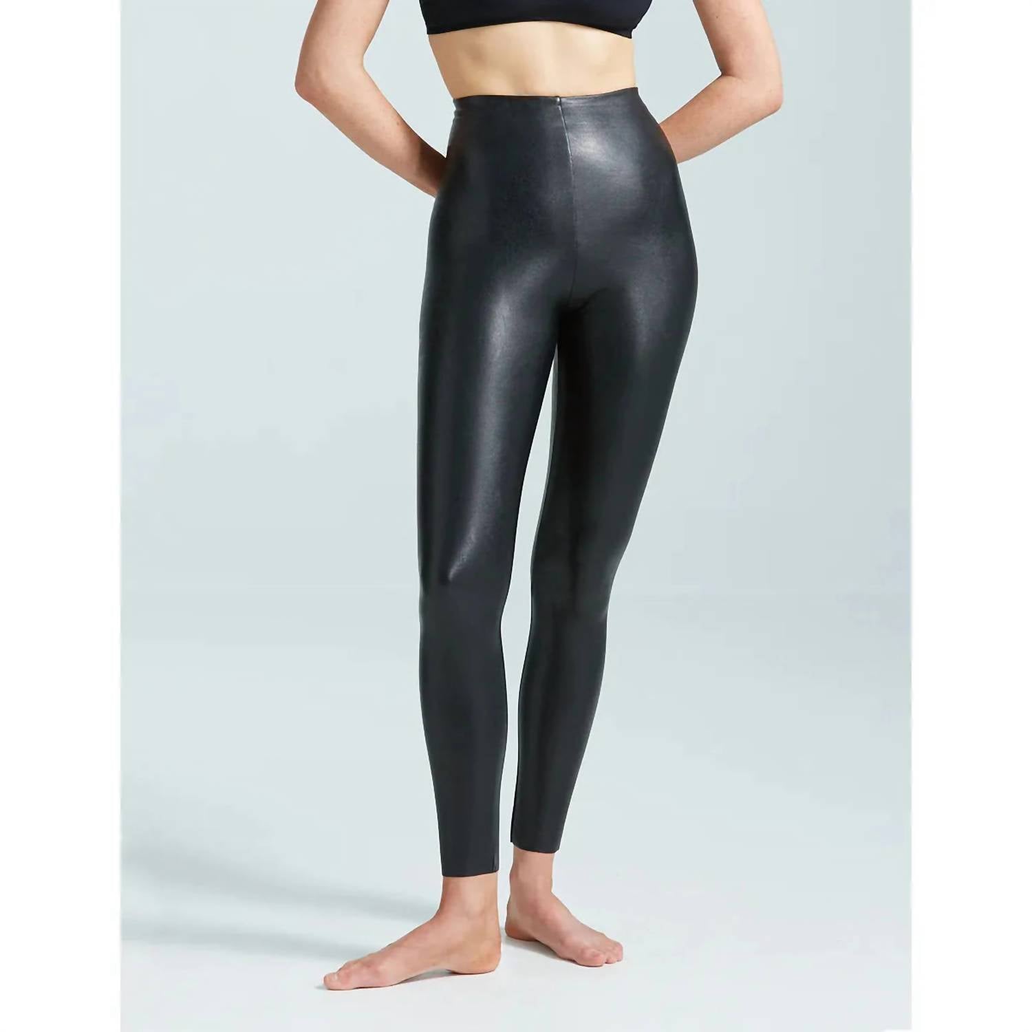 You'll be reaching for this best-selling legging all season long. Commando's Faux Leather Leggings in black bring luxury and comfort to your everyday style. With a composition of 55% polyurethane, 44% viscose, 1% elastane for the leg, and 72% nylon, 28% elastane for the waistband, these leggings offer a sleek and stretchy mid-rise fit. They are pull-on with no side seams in sizes XS-XL for a smooth look, featuring a signature smoothing waistband to enhance shape. Enjoy the functionality of machine wash and versatile wearability, ideal for travel and workwear.