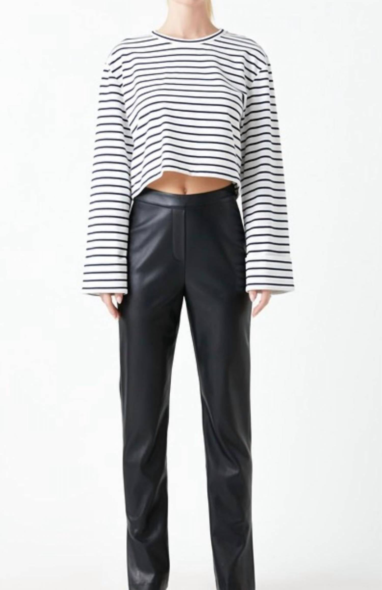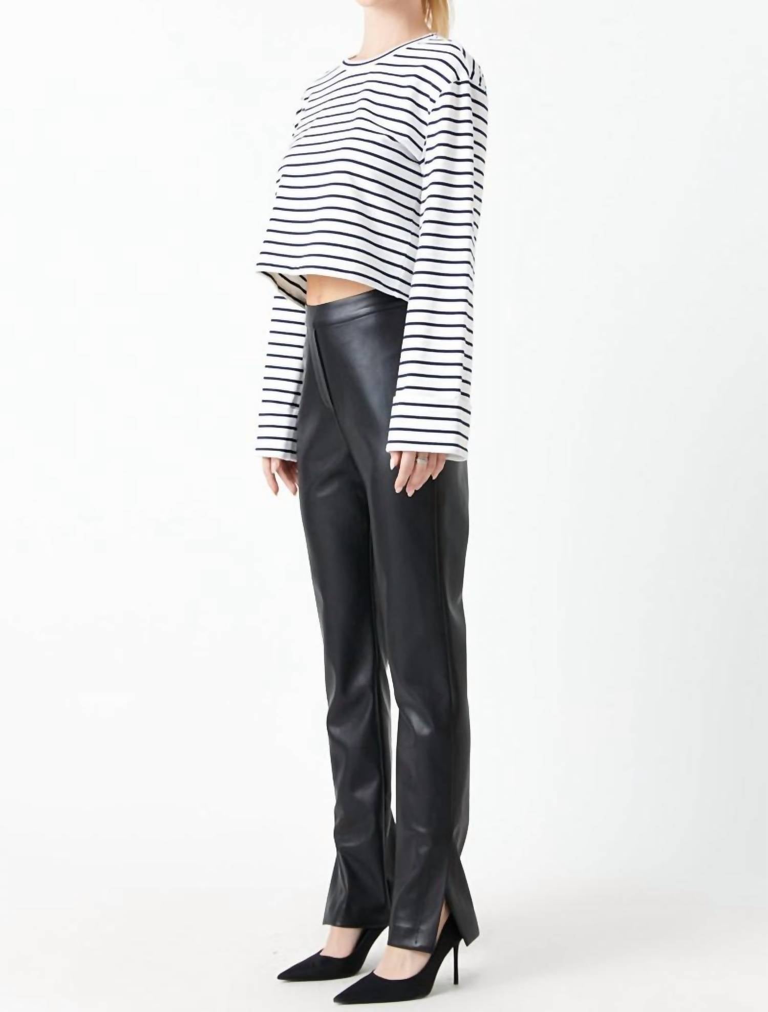 Leggings you can dress up or down for any occasion. Elevate your style with the Pu Slit Leggings by Grey Lab, a chic addition in timeless black. These high-waisted leggings are crafted from a luxurious blend of 50% Polyurethane and 50% Cotton with a sleek long length and unique slit details at the bottom. The front invisible zipper adds a seamless touch, while the leggings are lined with 100% Polyester for added comfort. Perfect for those seeking a blend of modern luxury and classic design.