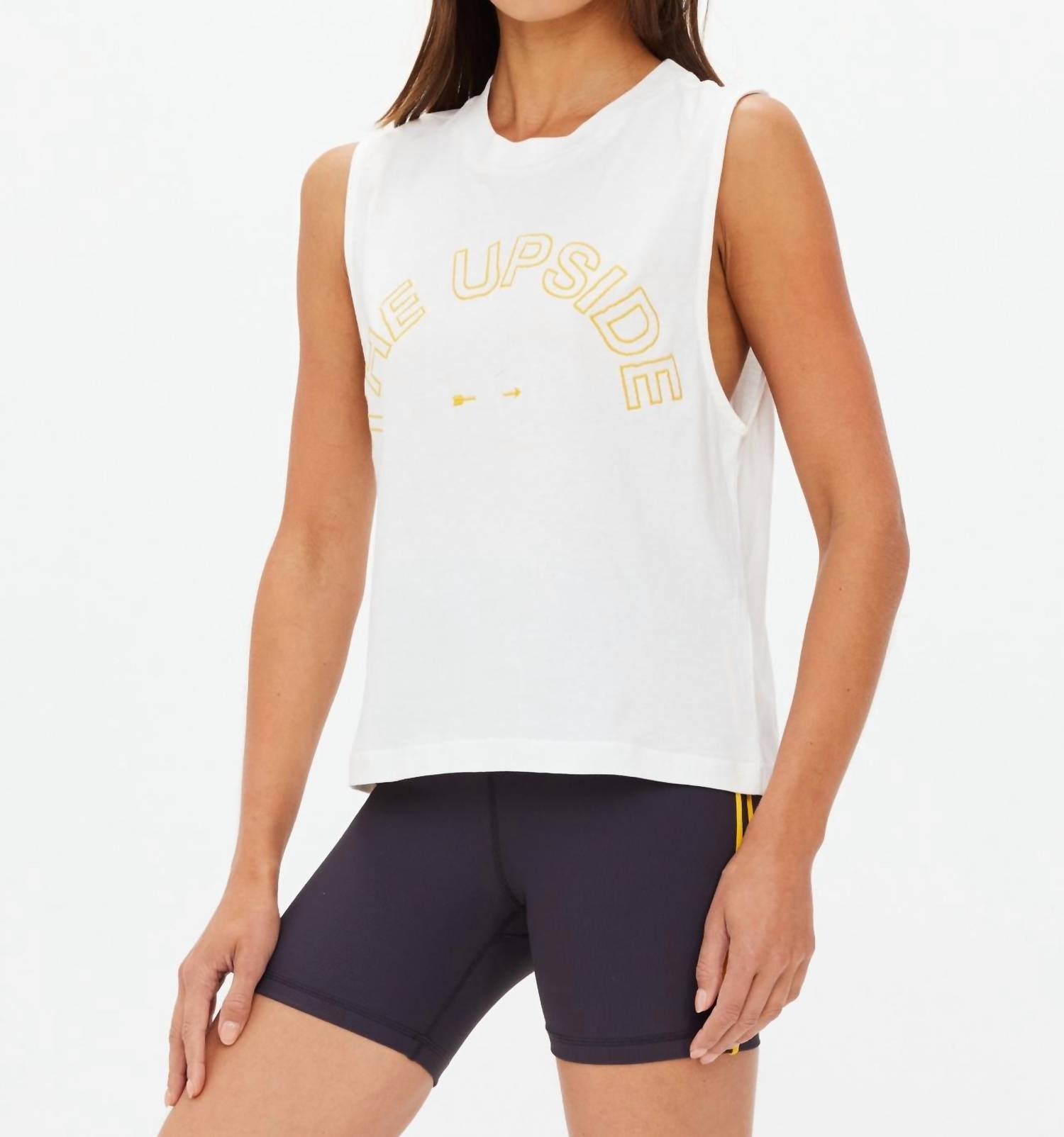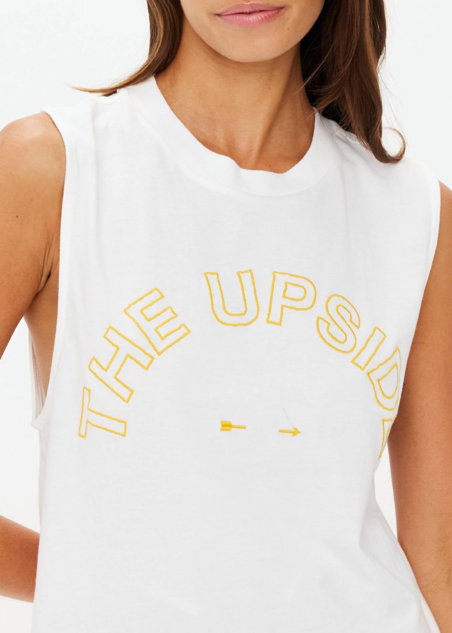 Fit, fabric and functionality. This tank top checks all the boxes. Introducing the Dawson Logo Tank Top by THE UPSIDE, an effortless staple designed for everyday elegance. This sleeveless tank is crafted from 100% organic cotton jersey in crisp white, featuring a mid-length and boxy muscle design for a relaxed fit. It highlights a soft ribbed crew neckline and an embroidered yellow horseshoe logo at the front chest. Closure: Pull on. Care: Cold machine wash with similar colors, wash inside out, hang dry in shade, do not tumble dry, warm iron avoiding prints, embroidery, and accessories.
