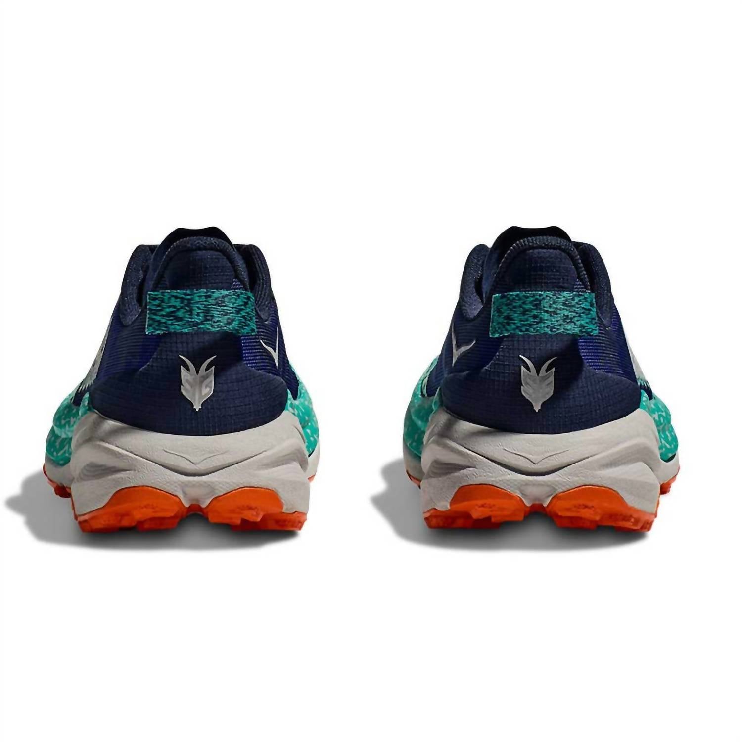 Workout in style with these adorable athletic sneakers. Introducing the Women's Speedgoat 6 Trainer Shoes by Hoka, engineered for the dedicated trail runner and hiker. With a lightweight woven upper paired with an internal support chassis and a dual-sided gusseted tongue, these trainers ensure maximum comfort and foot security. They feature a Vibram® Megagrip outsole with 5mm lugs for superior traction, complemented by a light, responsive midsole and protective toe bumper. The Varsity Navy/Meteor women's trainers are the perfect blend of style and performance, ideal for fitness, workouts, and embracing the athleisure trend during summer.