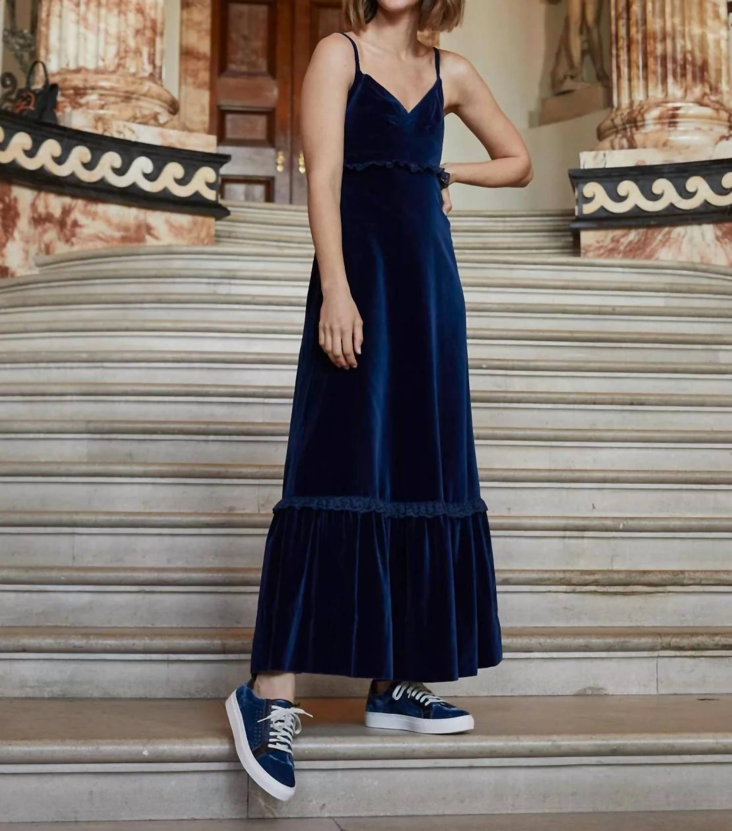 When fashion meets function. Step into luxury with the Women's Paradise Velvet Metallic Trainer by PENELOPE CHILVERS, a striking addition to your summer wardrobe. These trainers combine elegant spring silk velvet with metallic grain leather, presenting a rich indigo and ink color palette. Designed with a round toe and platform heel, these shoes effortlessly elevate any travel outfit. Crafted in Spain, they are your perfect companion for both Thanksgiving celebrations and everyday adventures.