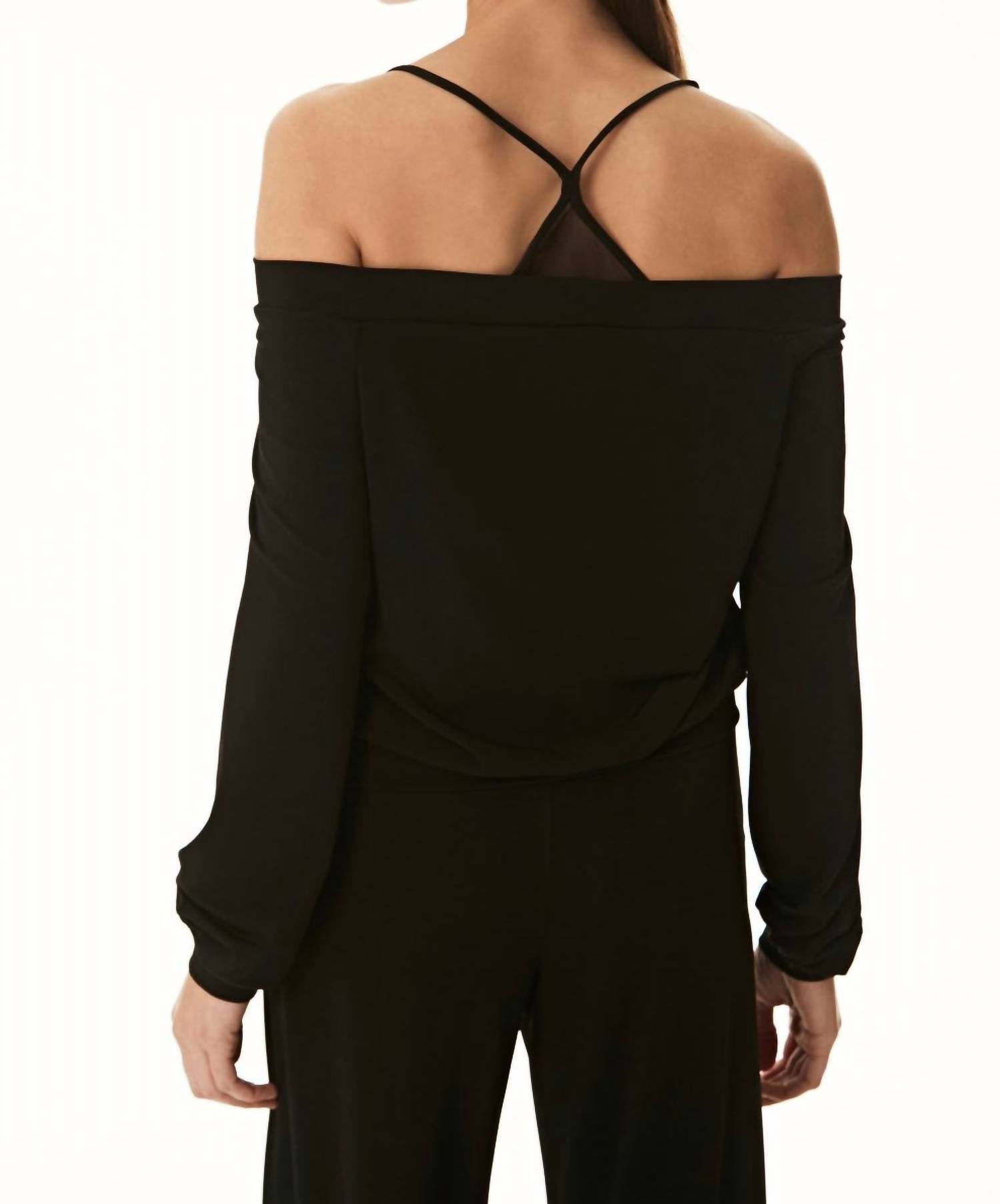 A versatile blouse that works from desk to dinner! The Lanston Off-Shoulder Top is a stylish black pullover featuring long sleeves and thin straps. Made from a soft and silky Philosophy jersey fabric, it has a composition of 94% Polyester and 6% Spandex. Originating from the USA with imported fabric, this top offers a chic look with its solid pattern and triangular mesh panels. Care instructions include machine wash cold and line dry.