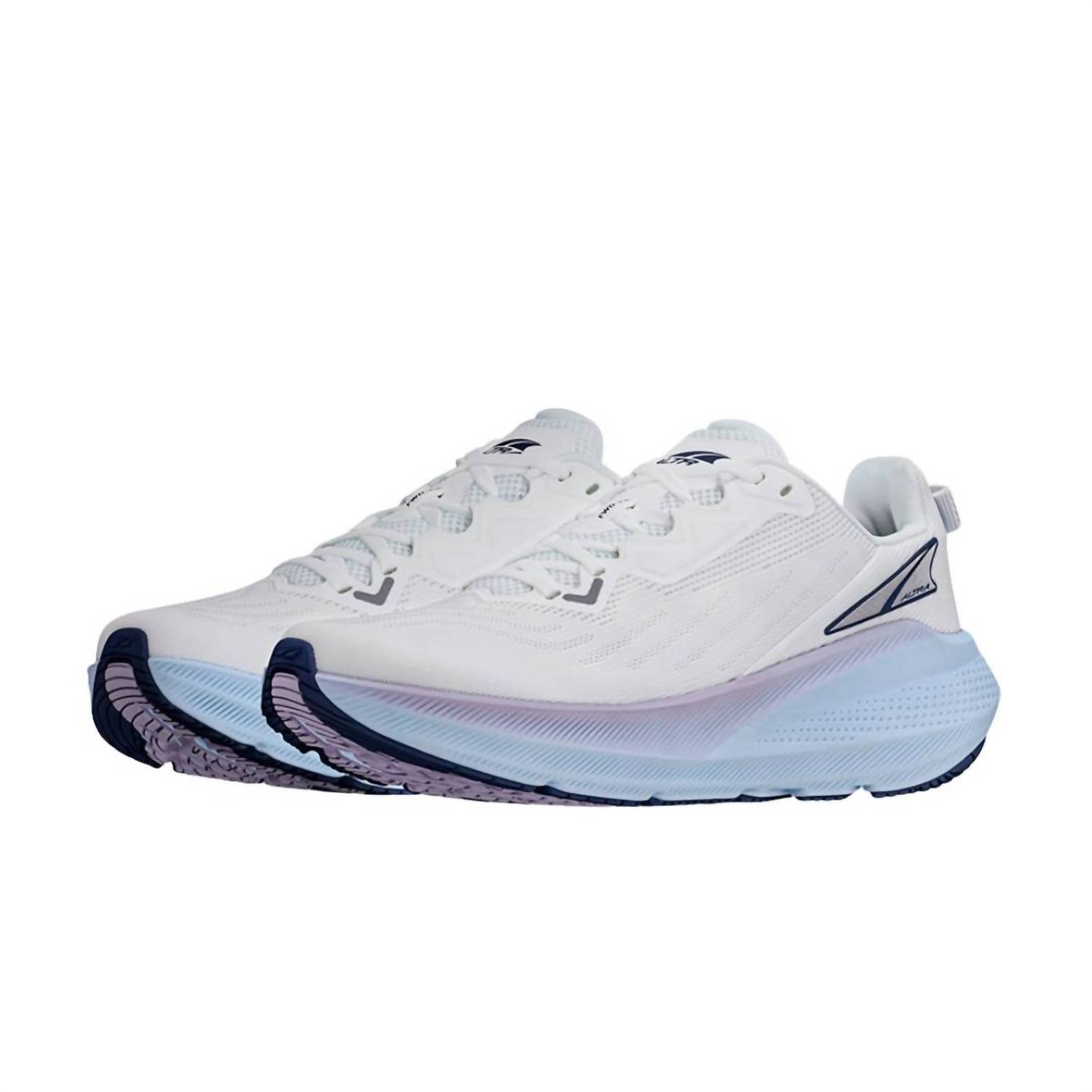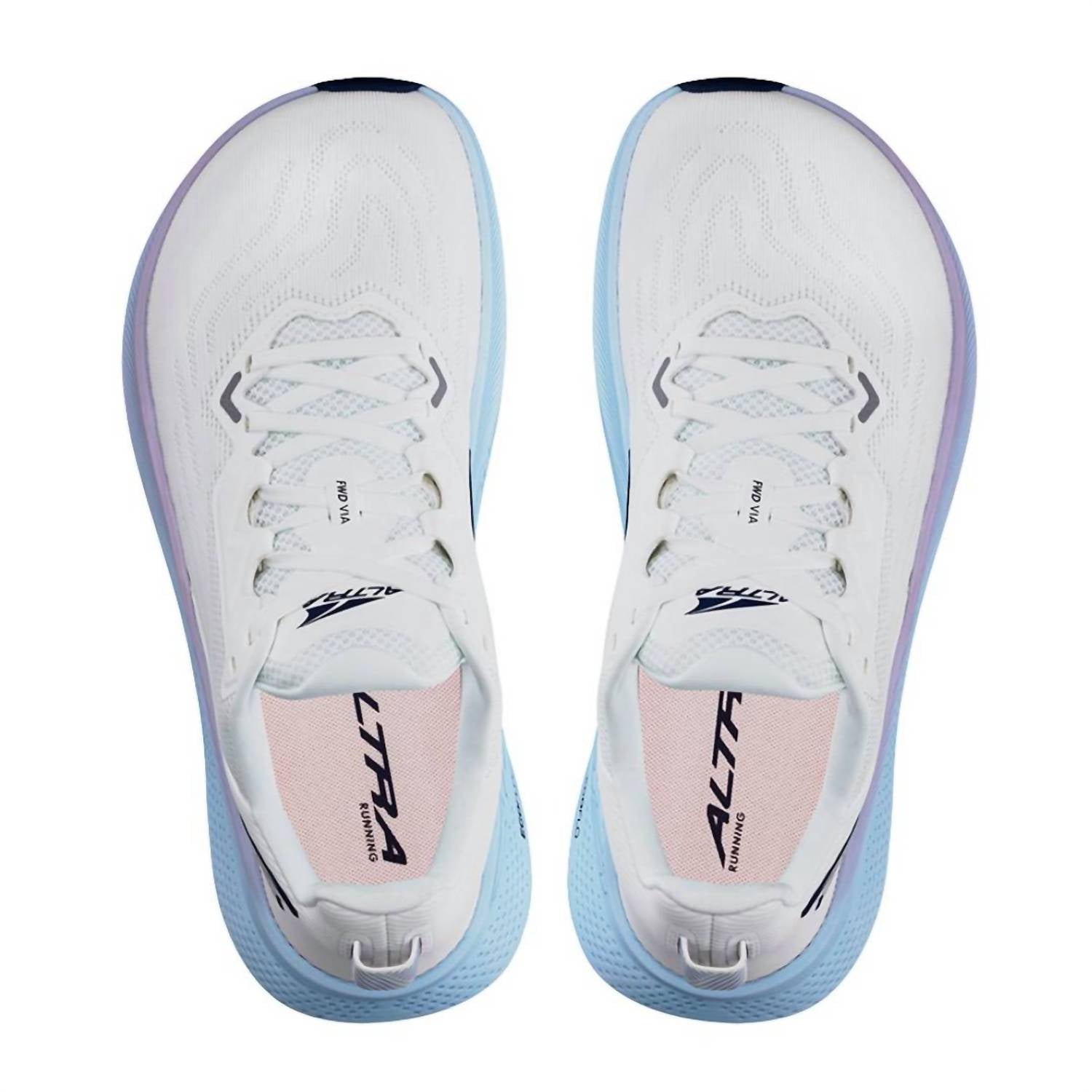 Stylish, comfortable and supportive. These athletic sneakers check all of the boxes. Elevate your running experience with the Women's FWD Via Running Shoes by ALTRA, crafted for maximum comfort and performance. These white and light blue shoes feature a flat heel, a round toe shape, and a low 4mm drop, making them perfect for asphalt surfaces. Weighing just 235 g (8.3 oz), they boast Altra's EGOâ„¢ FLO midsole technology, enriched with nitrogen for a responsive feel, ideal for long-distance training. Expertly designed for efficiency, their concave geometry enhances propulsion with each stride. Perfect for summer workouts and athleisure trends, they embody the spirit of movement.