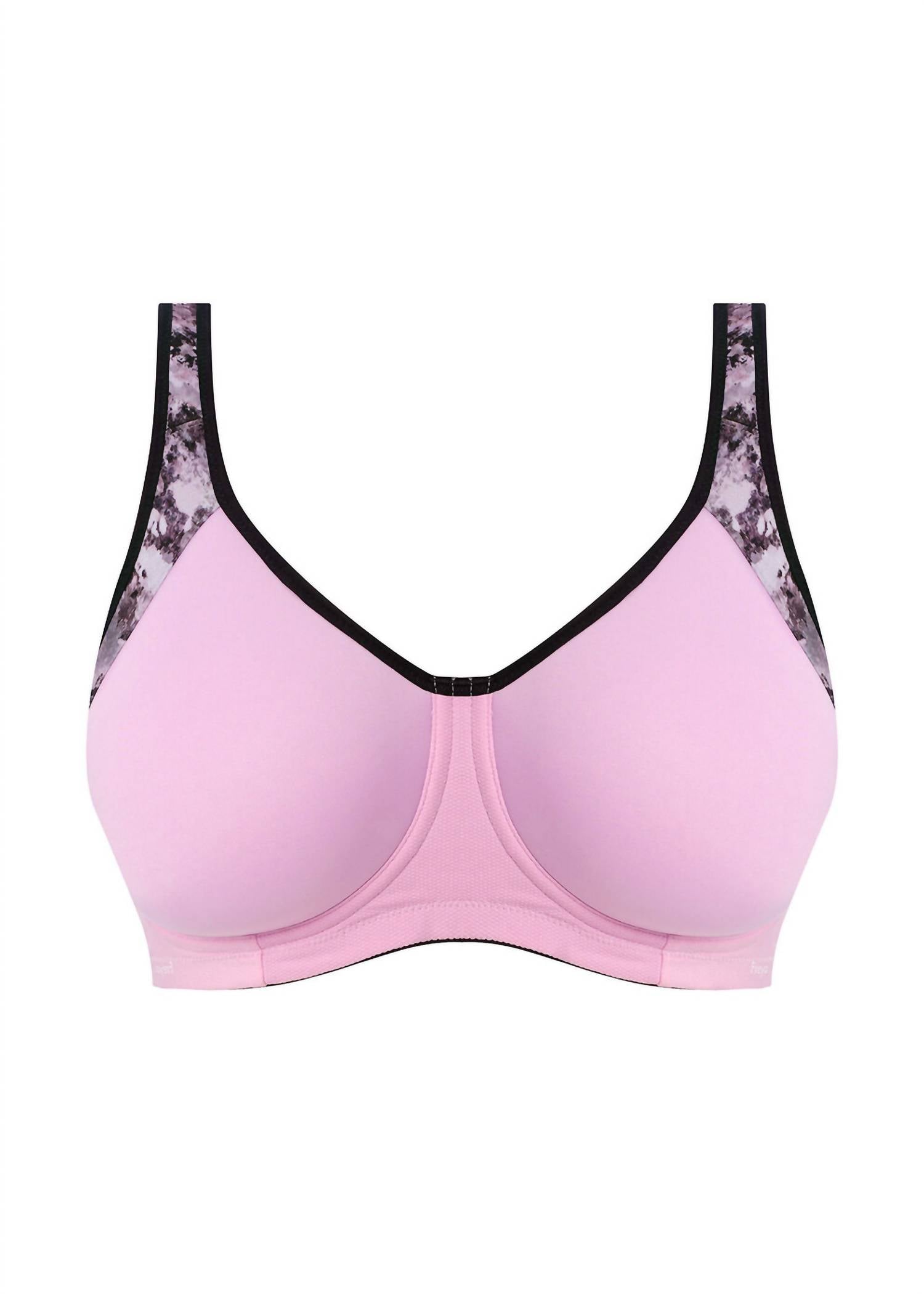 The most comfortable and supportive sports bra you'll own. Introducing the Sonic Moulded Sports Bra by Freya, an essential for any active woman's workout wardrobe. This sports bra in dusky lilac pink Haze offers mid to high intensity support with moulded cups featuring 87% polyester and 13% elastane for the cup, and 100% polyester for the cup lining and print. It features built-up padded straps, a firm flat underband, and a slide J Hook fastening that provides a racer back option for versatile comfort and support. Care is simple with a hand wash recommendation, ensuring durability through intense workouts.