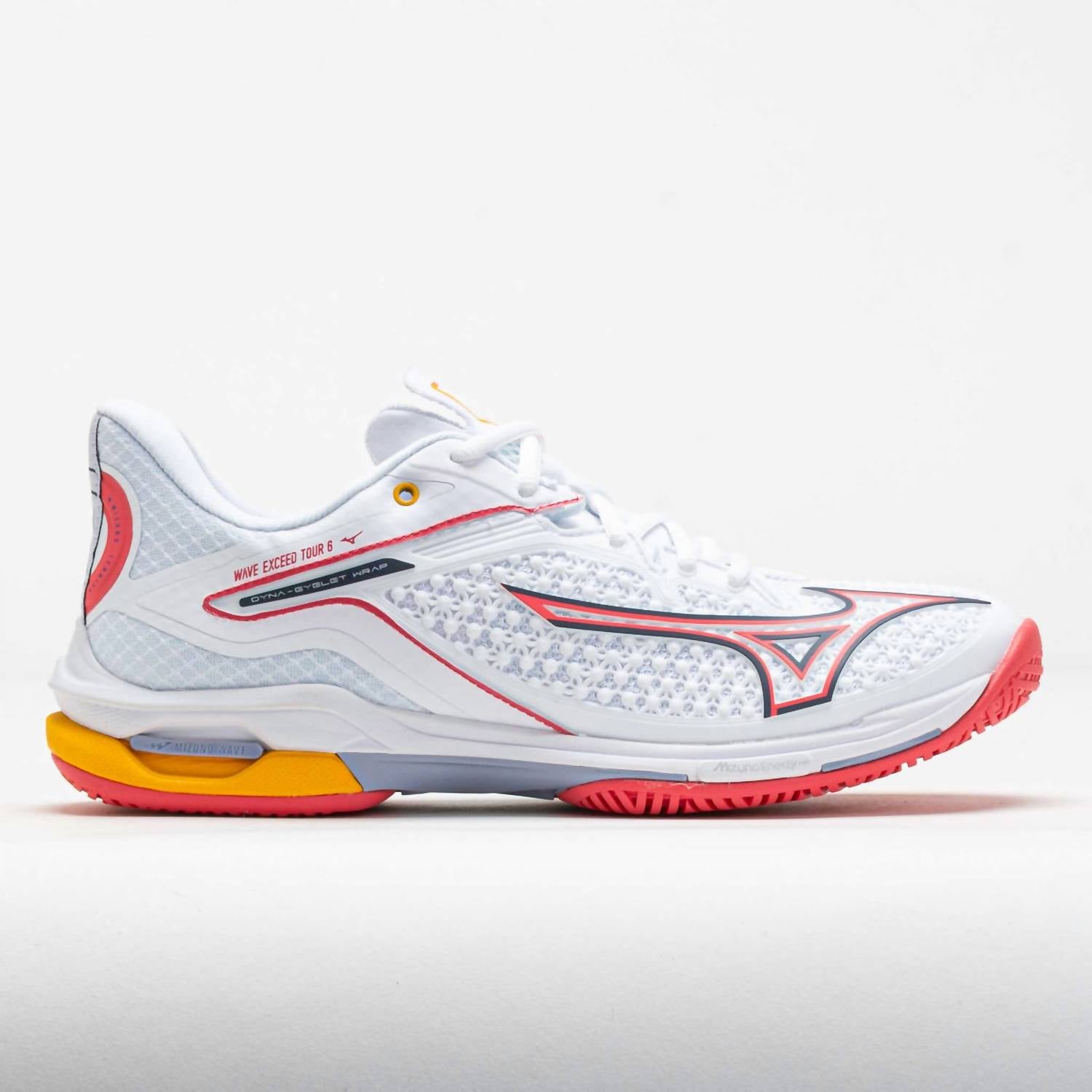 Workout in style with these adorable athletic sneakers. Step onto the court with confidence in the Women's Wave Exceed Tour 6 AC Shoes by Mizuno, crafted for speed and agility. These athletic shoes feature a redesigned 3D-Solid upper for enhanced softness and support, complemented by the MIZUNO ENERZY NXT midsole that propels you with every step. The shoes boast a durable DuRubber outsole designed for aggressive play, making them ideal for quick-footed tennis players. Toe shape: Round Toe. Heel height: Flat (1" & Under). Perfect for fitness and workouts, these shoes in White-Calypso Coral embody the athleisure trend for the summer season.