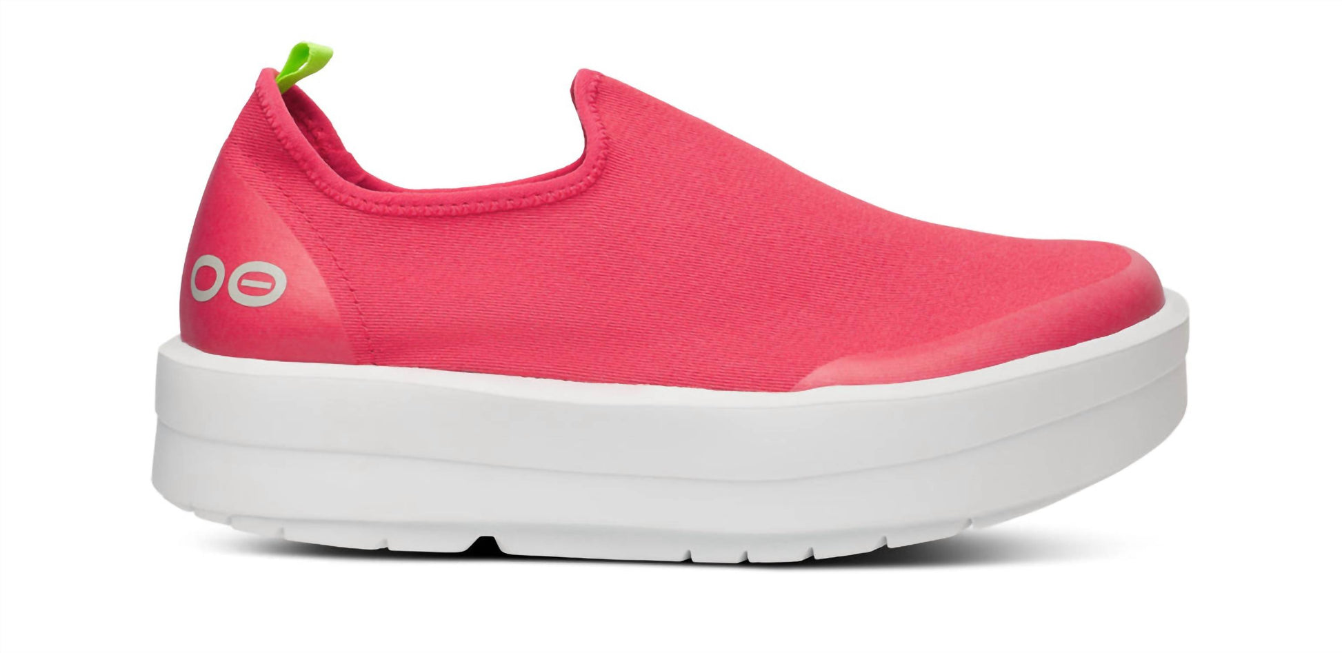 When fashion meets function. Step into style and recovery with the Women's Oomega Eezee Low Canvas Slip-on by OOFOS, now available in a striking Neon Berry. These athletic shoes combine a modern look with the traditional eeZee design, featuring a round toe and a platform heel that enhances comfort and support. Enjoy the unique craftsmanship from only OOFOS, with its additional 15mm of impact-absorbing OOfoamâ„¢ technology that ensures ultimate comfort for fitness or everyday wear. Perfect for athleisure activities and designed with summer in mind, these shoes are a must-have for trend-setting active recovery.