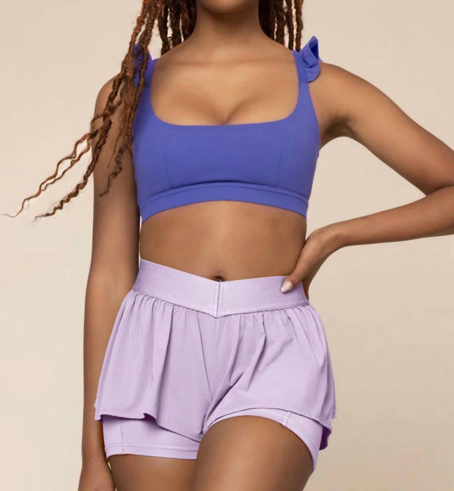 Elevate your fitness wardrobe with the Iris Romance Ruffle Bra from POPFLEX Active, a captivating addition in a solid purple hue. Featuring romantic, ruffled shoulder straps and a boxy, low cut neckline, this bra ensures both style and support. Made from 77% Polyester and 23% Spandex, it offers a flirty, deep low back design and an elastic underband with removable padding for a secure and customizable fit. Perfect for low-impact summer workouts, this piece merges feminine allure with practicality.