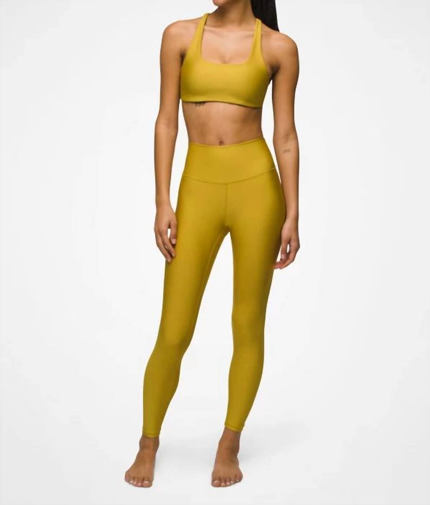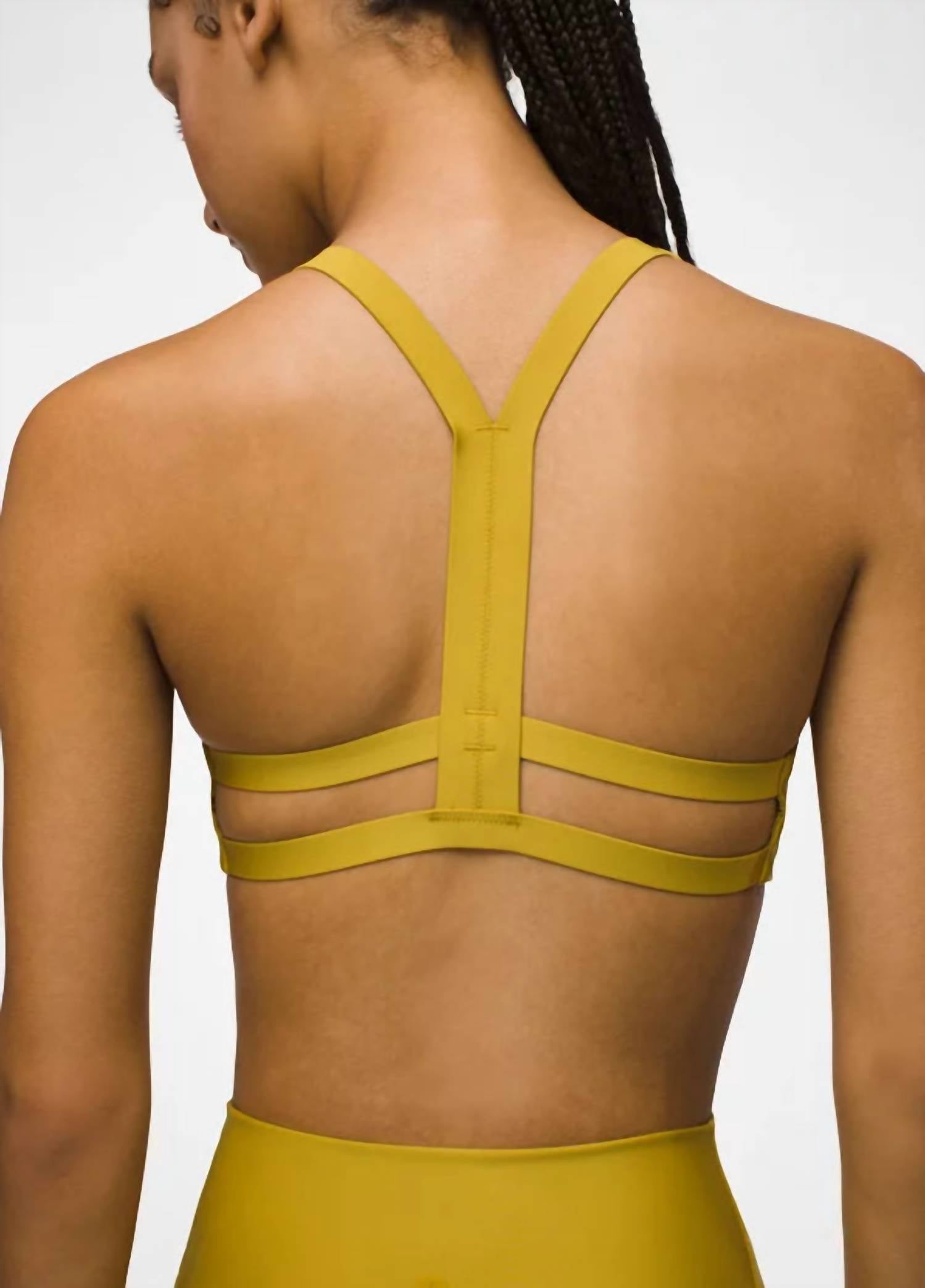 Elevate your workout with the prAna Sculpt Deep Breath Sports Bra, expertly crafted for style and performance. This Golden Leaf sports bra features a sleek scoop neck with welded strappy back details and provides light support for A-B cups. Fabricated from 84% recycled polyester and 16% elastane, it boasts moisture-wicking properties and UPF 50+ protection. Originating from imported materials, this bra is perfect for summer fitness occasions and should be hand washed for optimal care.