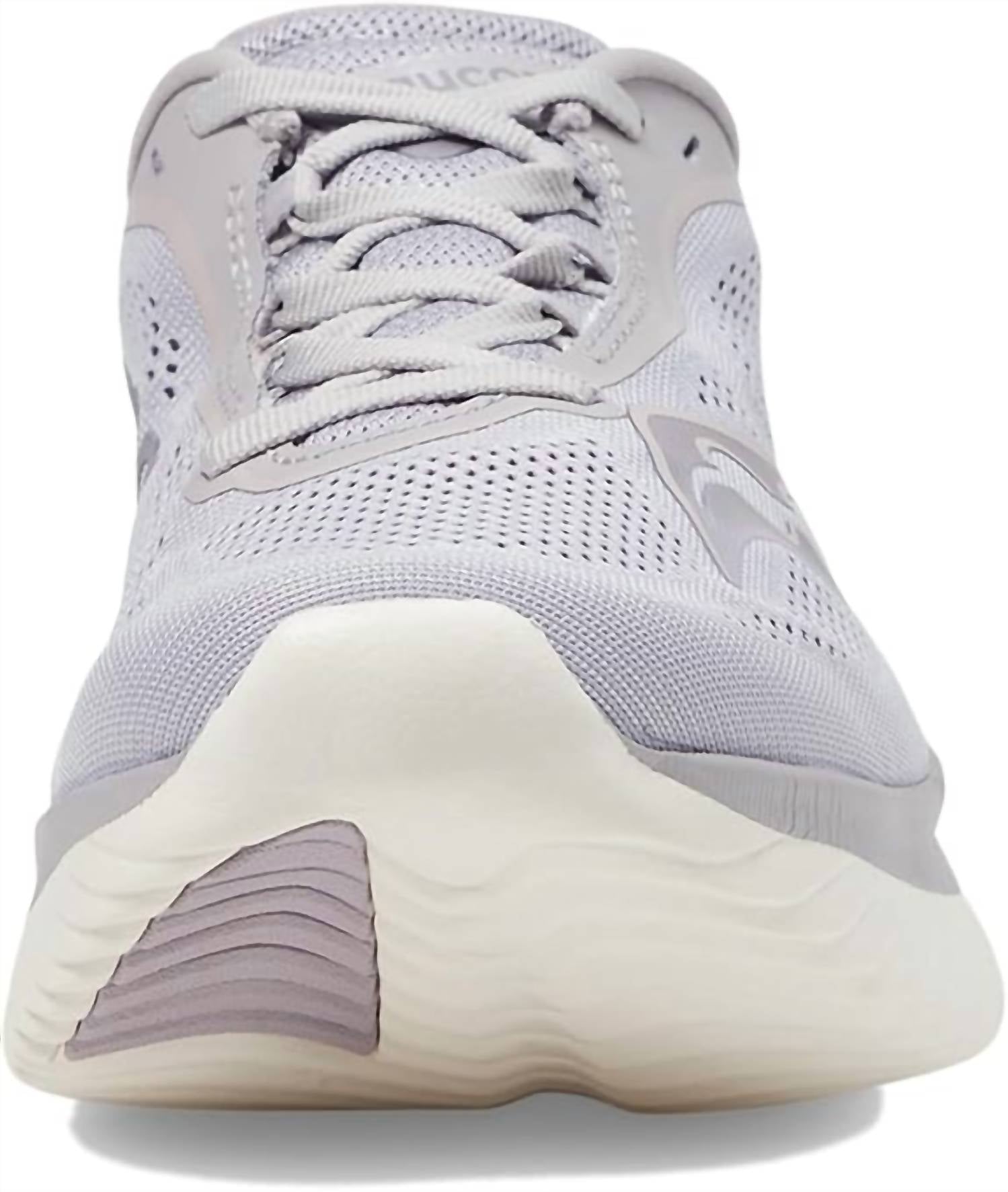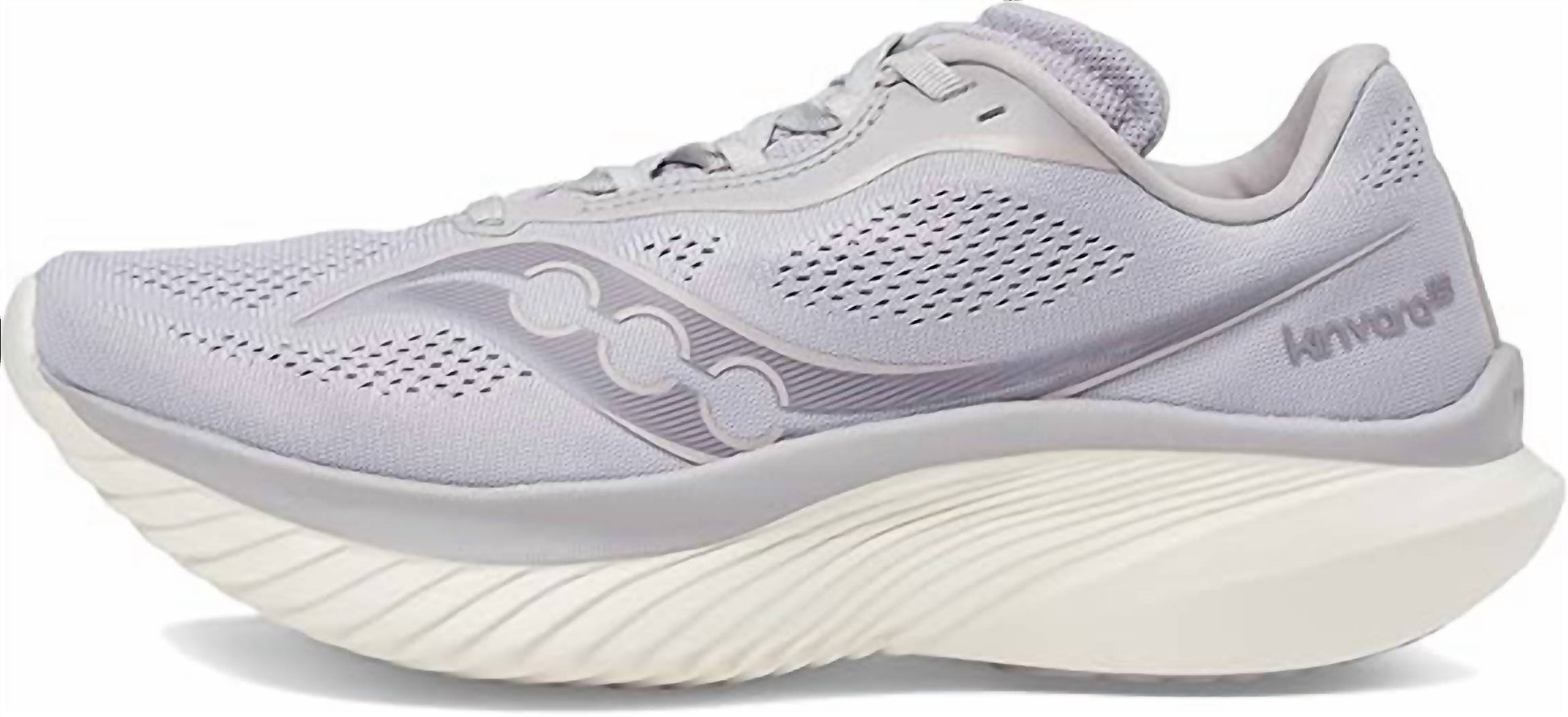 When fashion meets function. Introducing the Women's Kinvara 15 Shoes by SAUCONY, a perfect blend of style and performance for the athleisure trend. Designed with a round toe and platform heel, these heather-colored shoes provide a secure fit with an engineered mesh upper that moves effortlessly with you. The low (1 1/4"-2") heel height complements its reduced stack height, making it a budget-friendly and lightweight choice for fitness and workout occasions. Vegan and incorporating recycled materials, this model offers a responsible step forward in your athletic journey.