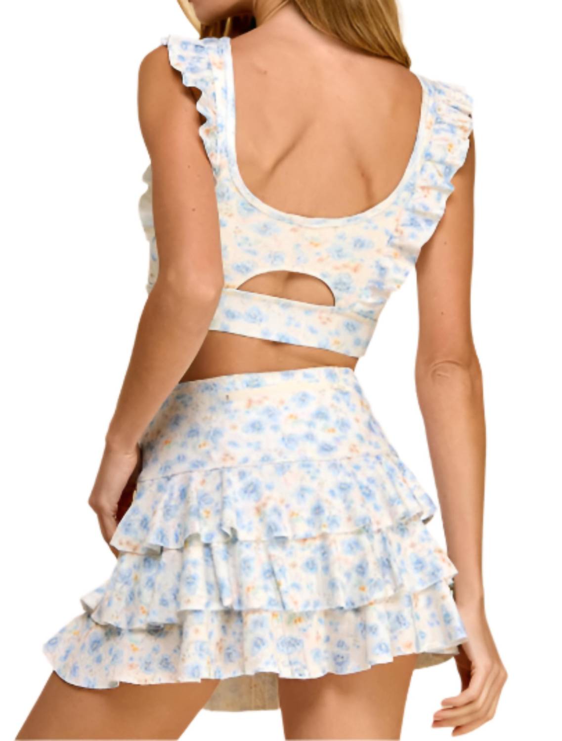 Introducing the Spring Fling Top by TCEC, a vibrant addition to any athleisure collection in blue multi floral print. Crafted from 100% polyester pointelle knit fabric, this cropped top features charming ruffle details and a daring back cutout. Perfect for spring vacations or festive occasions, its trendy design seamlessly blends style and comfort. Care: Hand wash and line dry.