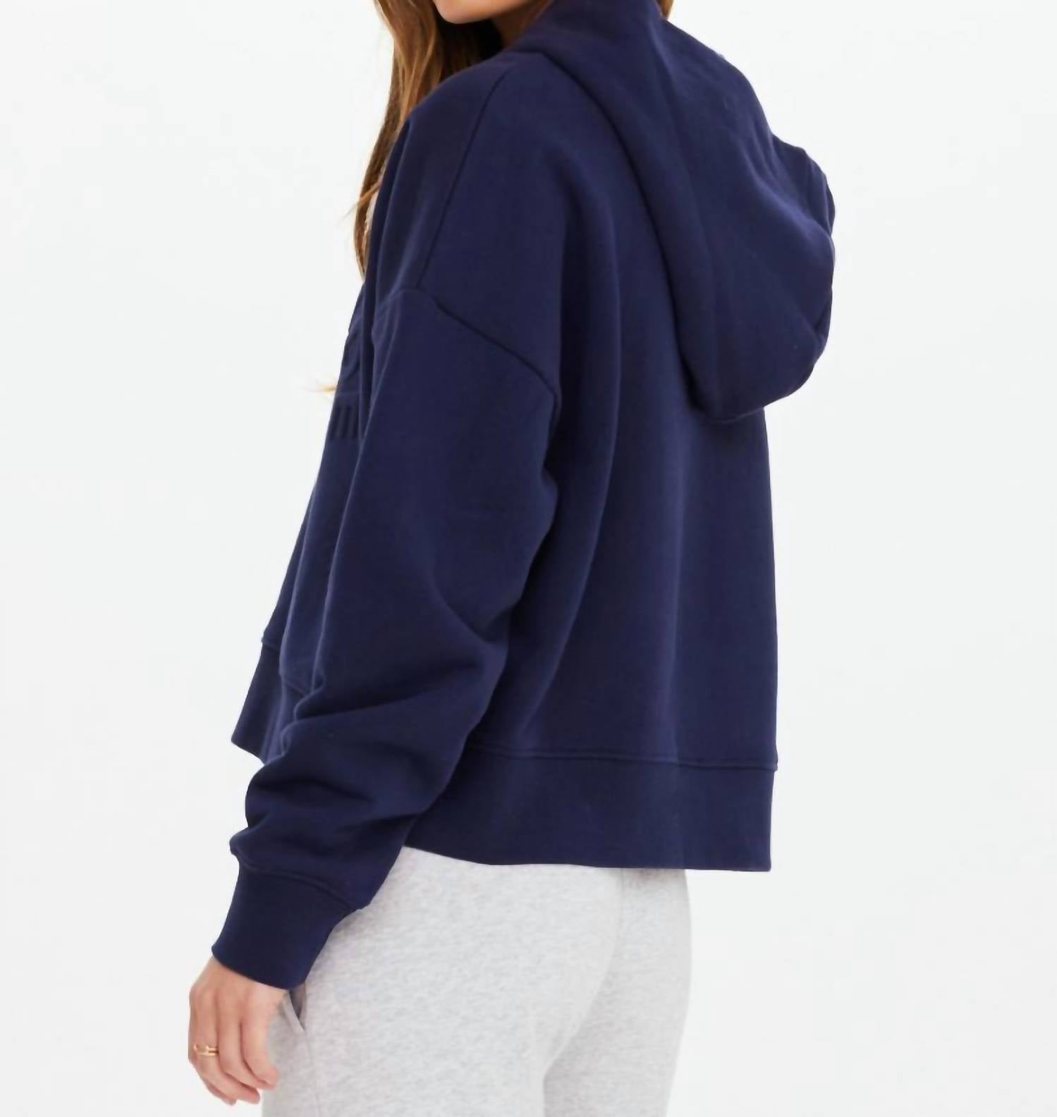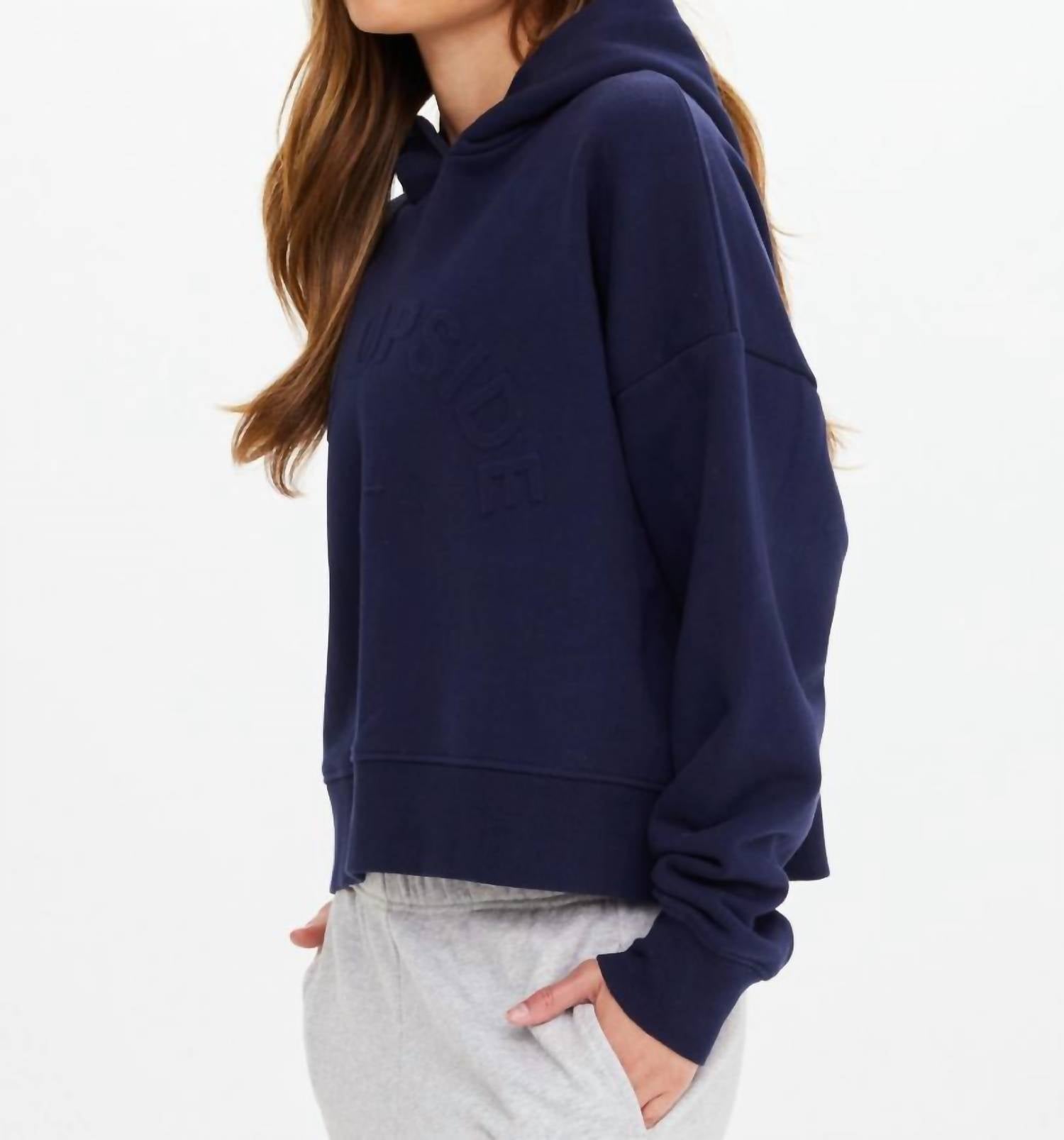 Cozy fabric, impeccable design - Meet the sweatshirt that you'll never want to take off. Elevate your casual wardrobe with the Byron Logo Long Sleeve Hoodie by THE UPSIDE. Crafted from 100% organic cotton, this relaxed, boxy hoodie in navy features a tonal embossed logo on the front chest, adding a subtle touch of branding. Designed with ribbed cuffs and hemband for a snug fit and a convenient pull-on closure, it's perfect for fall outings. Care is as easy as tossing it into the machine wash and tumble drying, making it an ideal travel companion.