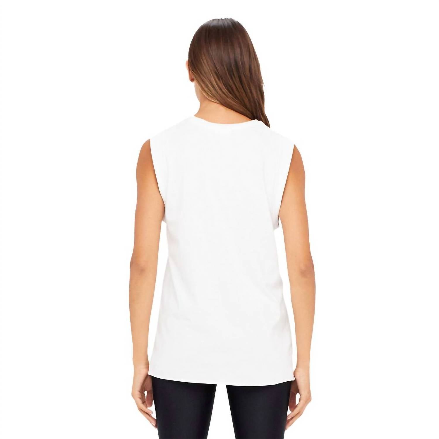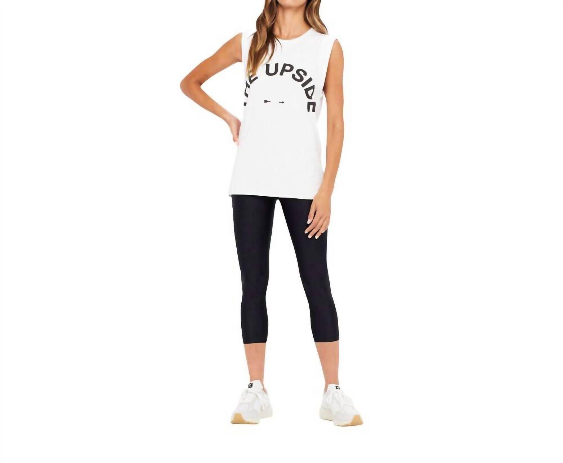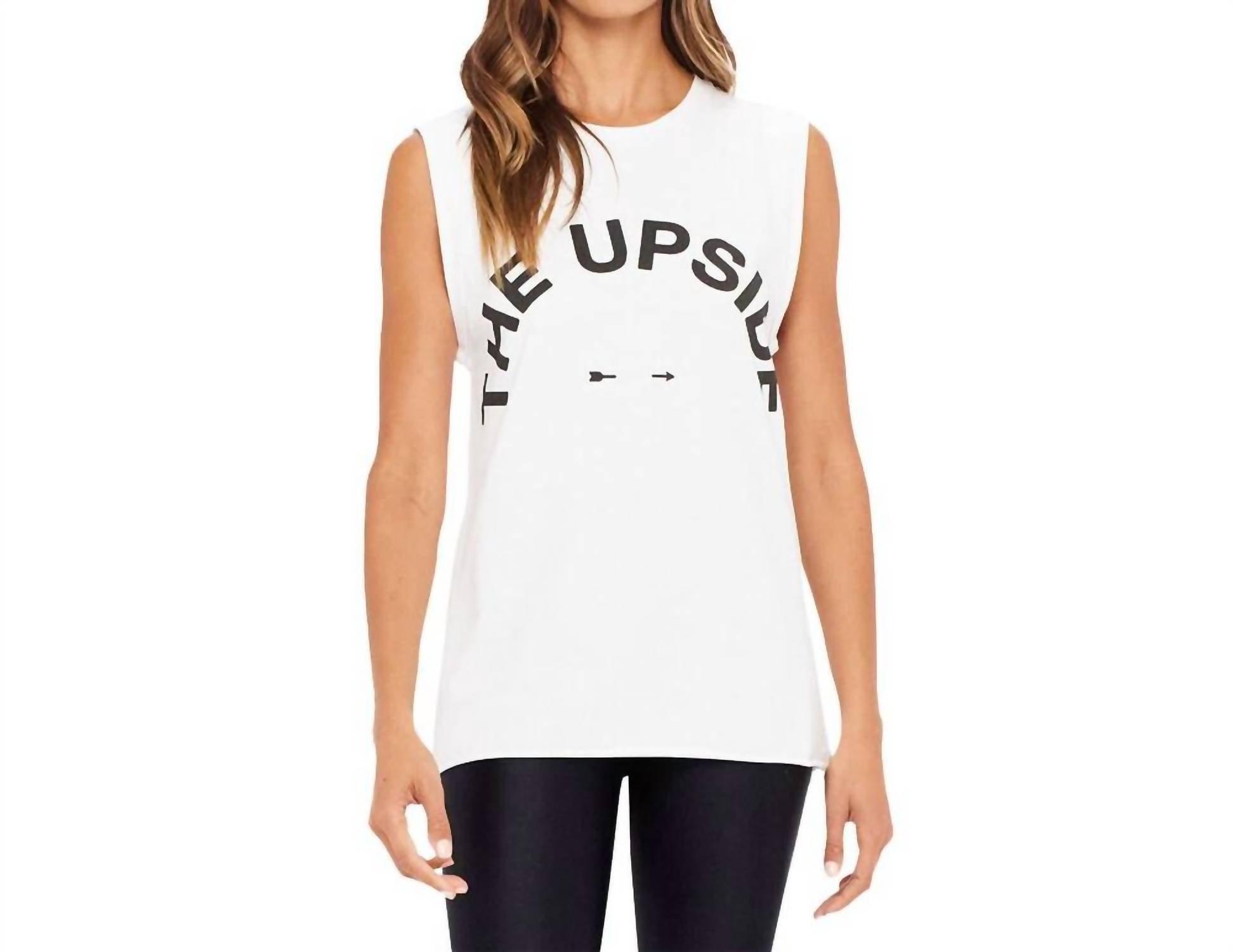 Wear this over your favorite sports bra for a more stylish and sporty look. Discover the Cropped Muscle Tank Logo by THE UPSIDE, a must-have for active women with a focus on style and performance. This sleeveless top is crafted from breathable cotton, featuring a pull-on closure and graphic pattern in a minimalist white design. Its crewneck style and bold horseshoe logo lend a sporty vibe, making it an ideal choice for vacations or everyday adventures. Embrace versatility and comfort with this easy-to-pair muscle tee that enhances your wardrobe effortlessly.