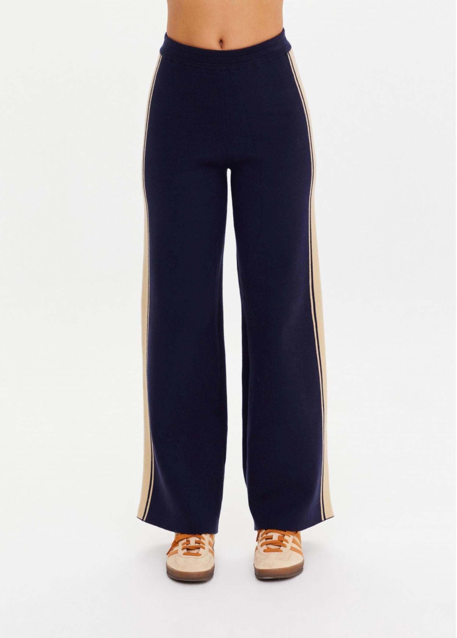 Elevate your casual wardrobe with the Women's Cosmo Freya Knit Pant by THE UPSIDE in classic navy. Crafted with 85% organic cotton, 13% nylon, and 2% elastane, these wide-leg pants feature knitted stripes along the side seams. The style is complete with an elasticated waistband and short splits at the hem for a comfortable high-rise fit. Easy to maintain, these pants can be machine washed on a cold, gentle cycle.