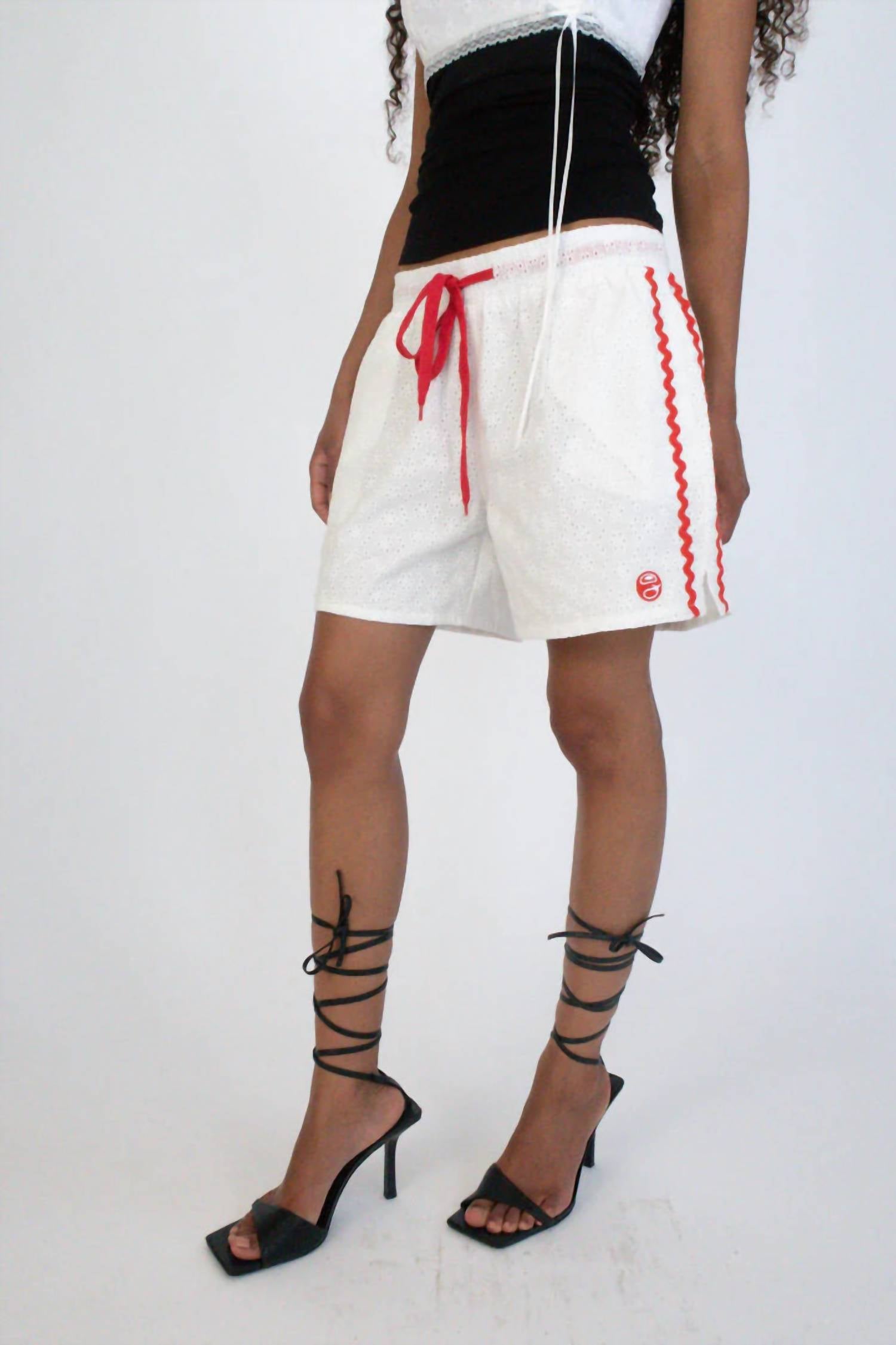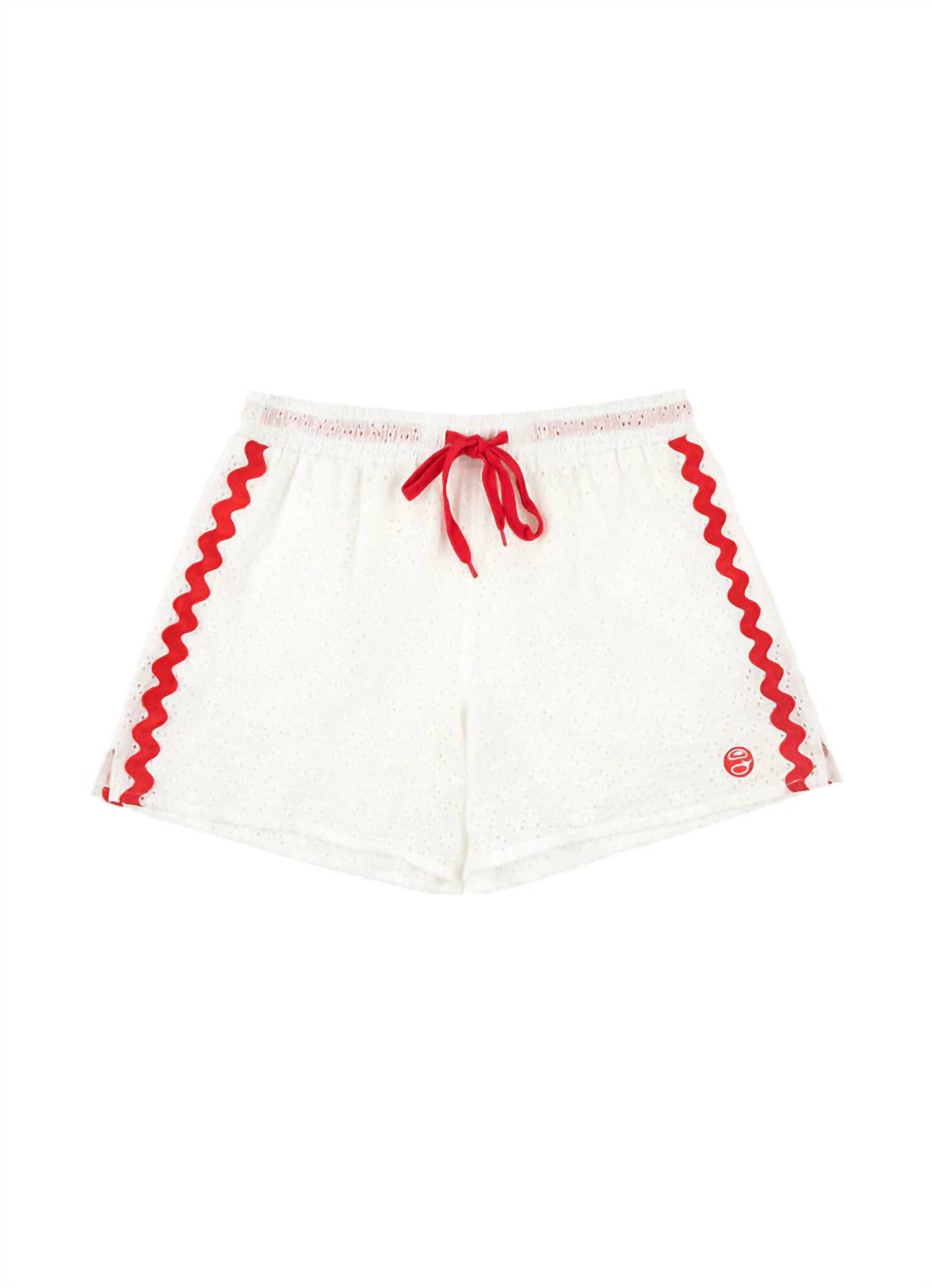 Introducing the Women's Mia Sport Short by Tyler McGillivary, your ideal spring companion for boho chic outings. Crafted from 100% cotton, these shorts boast an intricate eyelet pattern and red embellishments, adding a pop of color to any beach day or relaxed Sunday. Designed with an elastic waistband for comfort, they are perfect for vacation season. Care instructions are not provided.