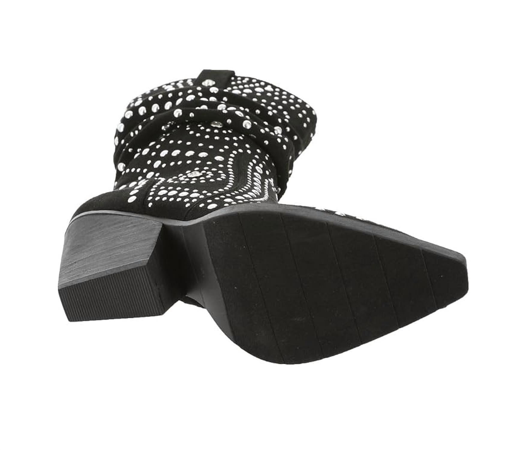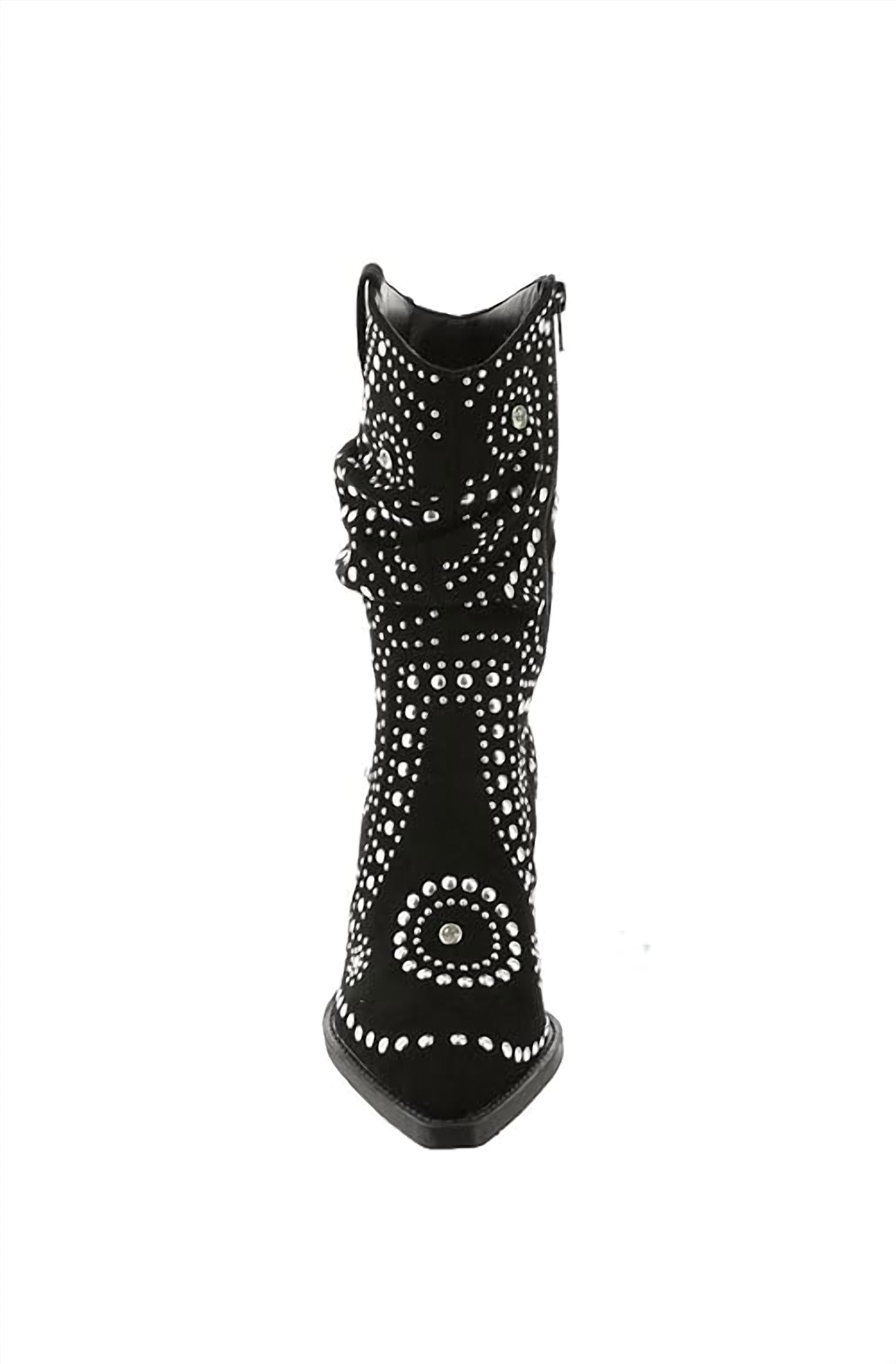 This slouch boot features an ornament detail for added style, a lightly cushioned footbed for comfort, and a 2" heel height. The pointed toe completes the sleek design.
