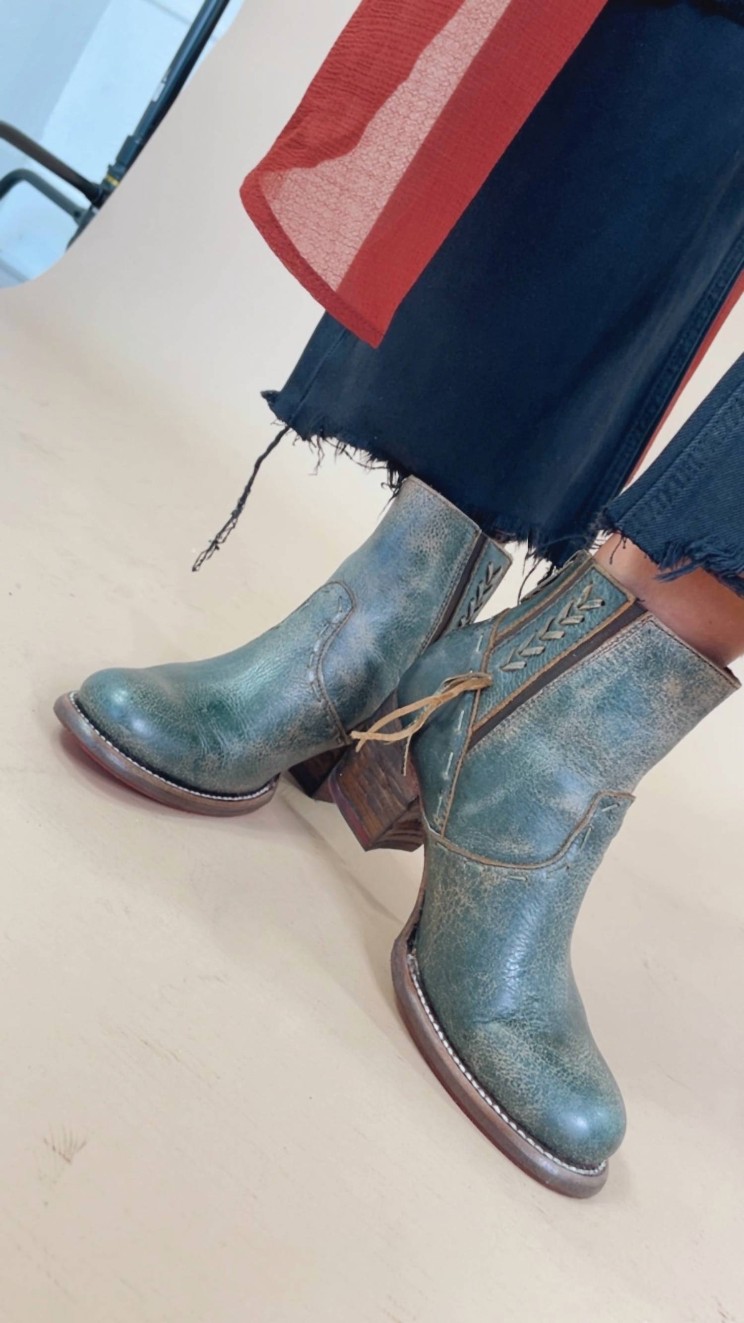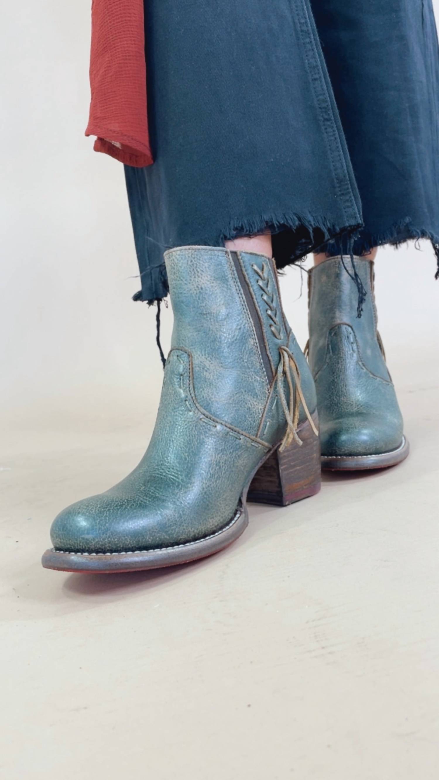 Say hello to the perfect, most versatile boot. The ankle height makes this style easily transition from day to night. Wear them with your favorite skinny jeans and tee for a more laid back look, or pair them with your favorite mini dress and jacket for a night out on the town. Introducing the Women's Celestine Leather Ankle Boots by BEDSTU, a stylish western-inspired design perfect for any concert. These boots feature a comfortable ankle fit, round toe design, and hidden goring with elegant arrow-like leather inlays and a side tassel in Dark Teal Lux. Crafted from chrome and formaldehyde-free, vegetable-tanned leather, they boast a 2.5-inch block heel and a 4.5-inch shaft. Handmade and finished in León, Mexico, these boots have a back zip closure for easy wear, ensuring comfort with a red leather lining and replaceable Goodyear Welt outsole with red Vibram panels for traction.