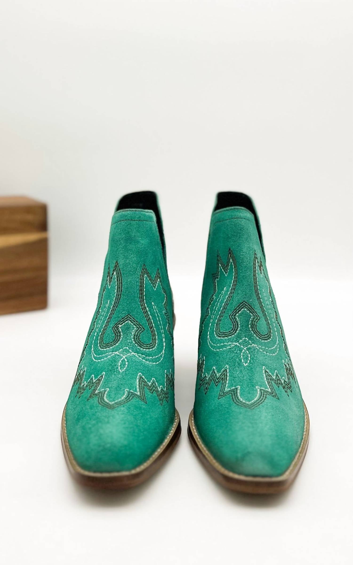 Say hello to the perfect, most versatile boot. The ankle height makes this style easily transition from day to night. Wear them with your favorite skinny jeans and tee for a more laid back look, or pair them with your favorite mini dress and jacket for a night out on the town. Elevate your footwear collection with the Women's Kickin’ Booties by Naughty Monkey, a stylish choice in vibrant turquoise. Crafted from genuine suede, these ankle booties showcase western-inspired embroidery and a roomy pointed snip toe, offering both trendiness and comfort. Featuring a versatile ankle slit design with a 2.25-inch block heel, these booties are perfect for spring vacations or any stylish outing. Note: Fits true to size, but if you're between sizes, consider sizing up by a half size for optimal fit.