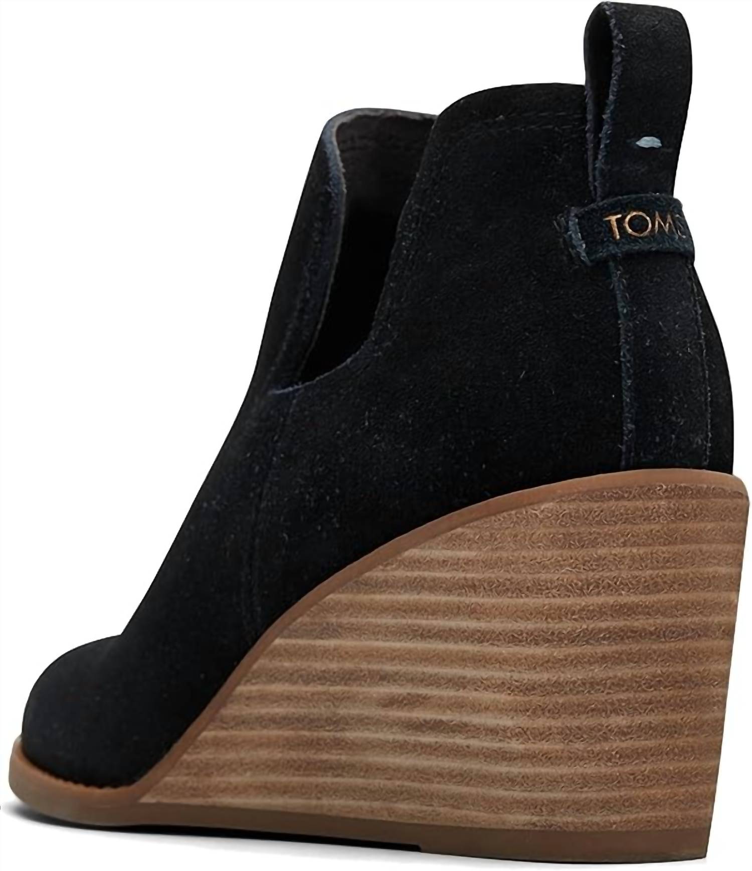 Say hello to the perfect, most versatile boot. The ankle height makes this style easily transition from day to night. Wear them with your favorite skinny jeans and tee for a more laid back look, or pair them with your favorite mini dress and jacket for a night out on the town. Step up your shoe game with the Women's Kallie Pull-up Ankle Boot by TOMS, featuring luxurious suede uppers in classic black. These stylish boots boast a leather-wrapped stack wedge heel with a height of approximately 2.75 inches, offering a modern take on the Scandi style trend. Easy to slip on, they promise all-day comfort with high-rebound OrthoLite Eco X40 Hybrid insoles, composed of 32% eco-friendly materials. The resilient rubber outsole and round toe shape complete this chic and sustainable look.