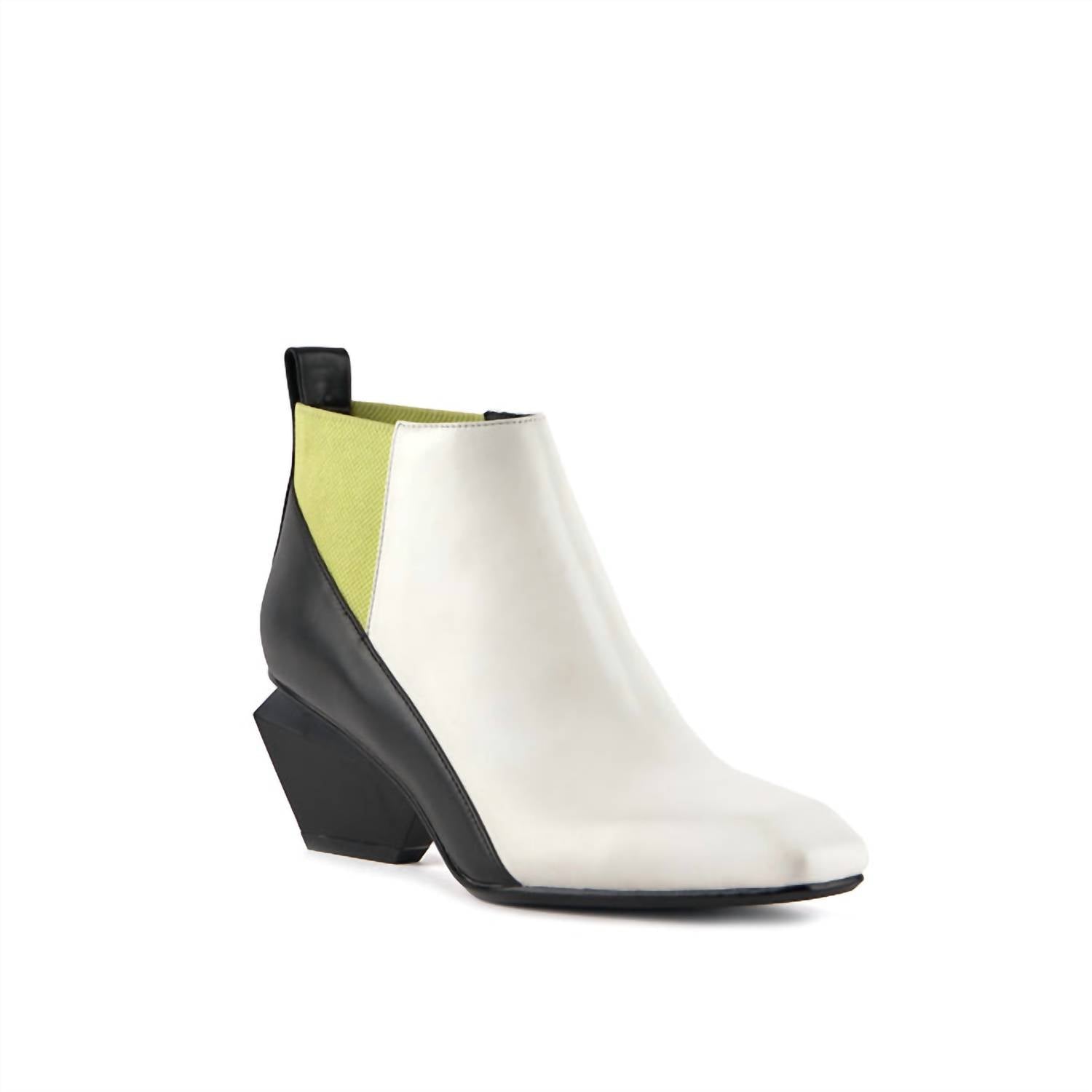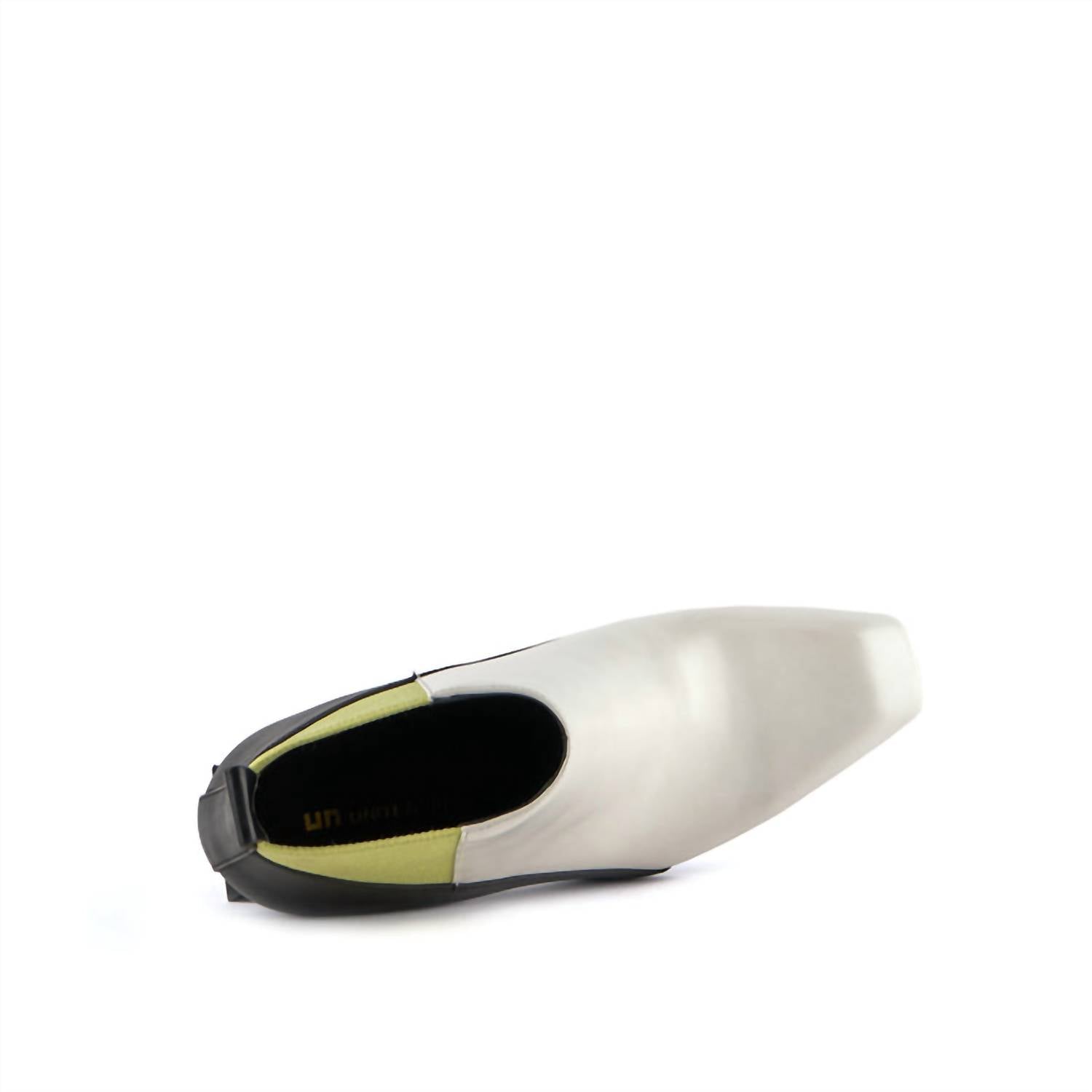 Say hello to the perfect, most versatile boot. The ankle height makes this style easily transition from day to night. Wear them with your favorite skinny jeans and tee for a more laid back look, or pair them with your favorite mini dress and jacket for a night out on the town. Step into style with the Women's Jacky X Bootie by United Nude, an eye-catching piece in Cool Matcha that's perfect for your travel adventures. These slip-on booties feature a squared toe and are crafted from a combination of nappa, embossed leather, or metallic TPU with an elastic fabric upper. Highlighted by a geometric statement block heel, it captures the essence of 90s fashion. Lined with leather and set on a durable rubber outsole, this bootie is ideal for the fall season, ensuring both comfort and style for your Thanksgiving outings.