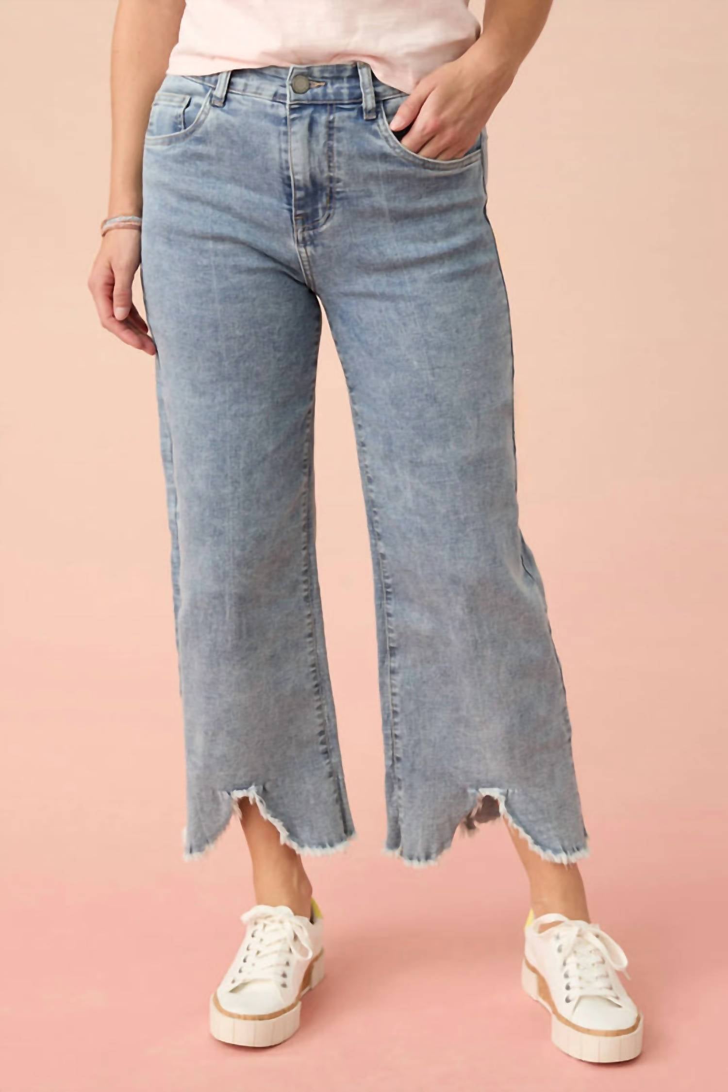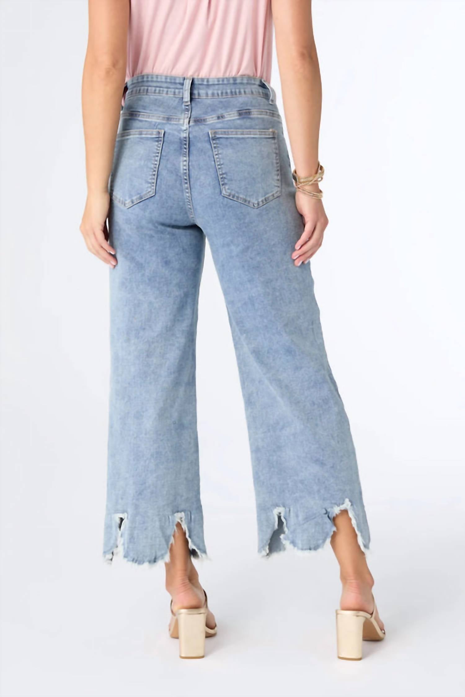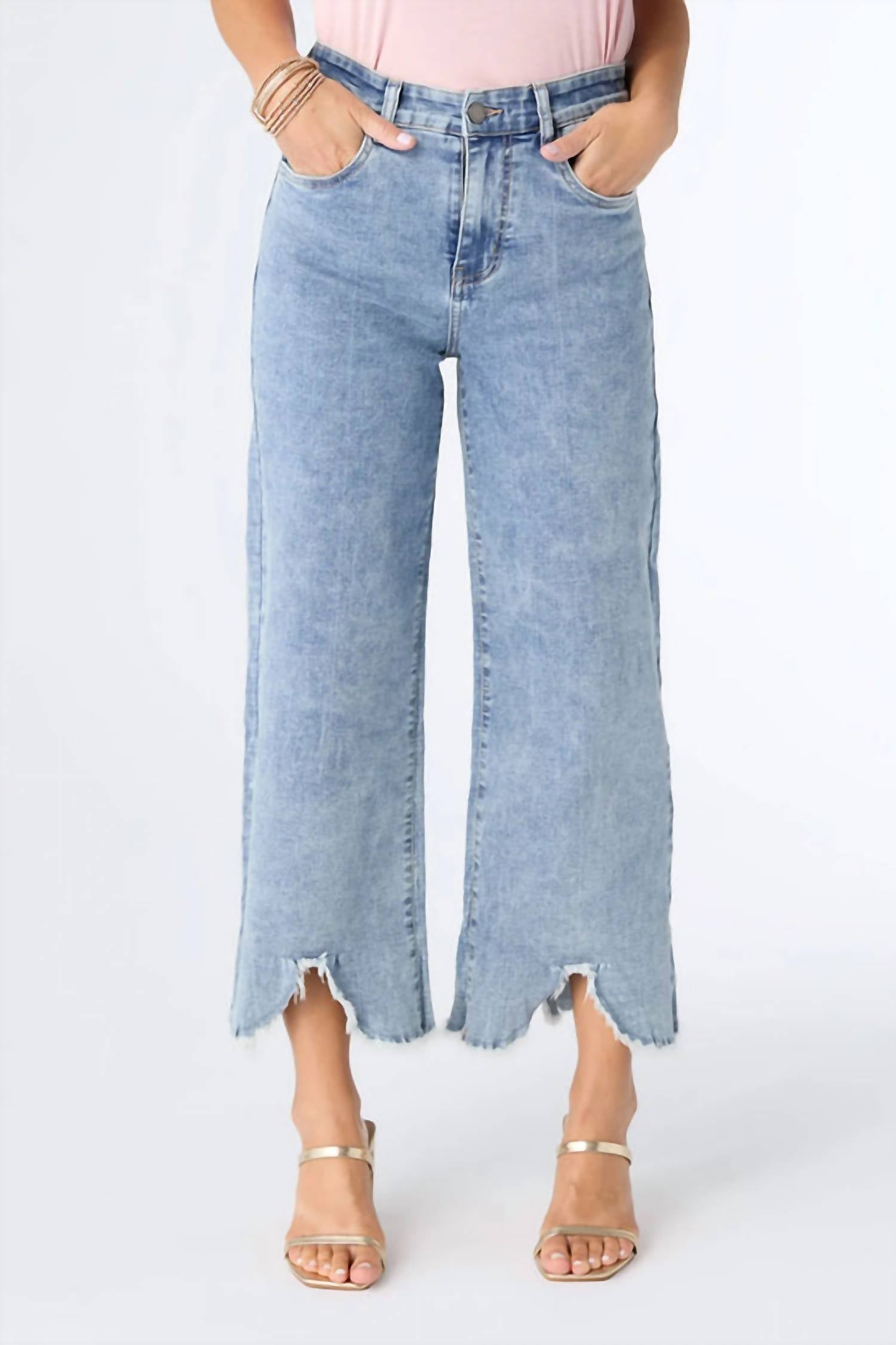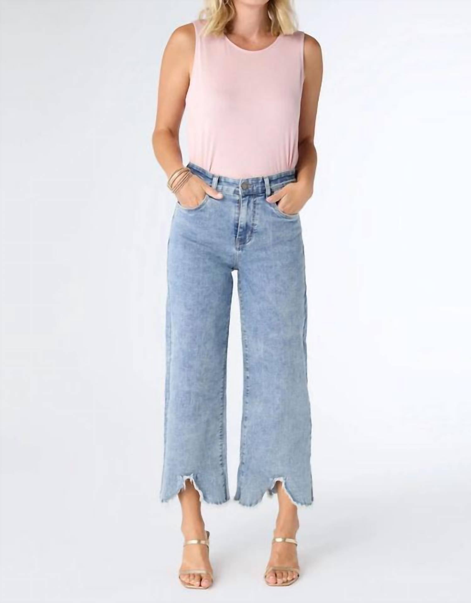 The perfect cropped jean for those transitional seasons. Meet the EverStretch Cropped Scalloped Fringe Jeans by COCO + CARMEN, a streetwear essential designed for the modern woman. These blue, wide-leg jeans offer a regular fit and are crafted from a special cotton blend, providing unparalleled comfort and a textured look. Featuring a button closure and pockets, they offer a convenient and stylish option for any summer occasion, including holiday parties. With a 26-inch inseam, these jeans are perfect for effortless style and comfort.
