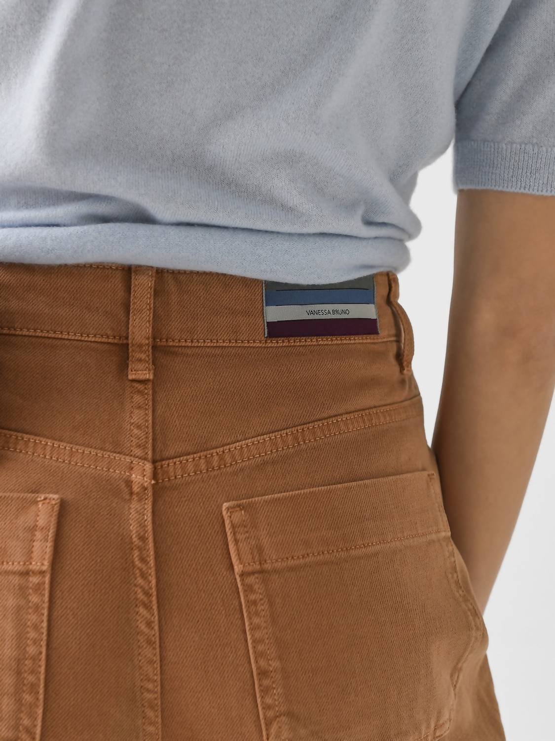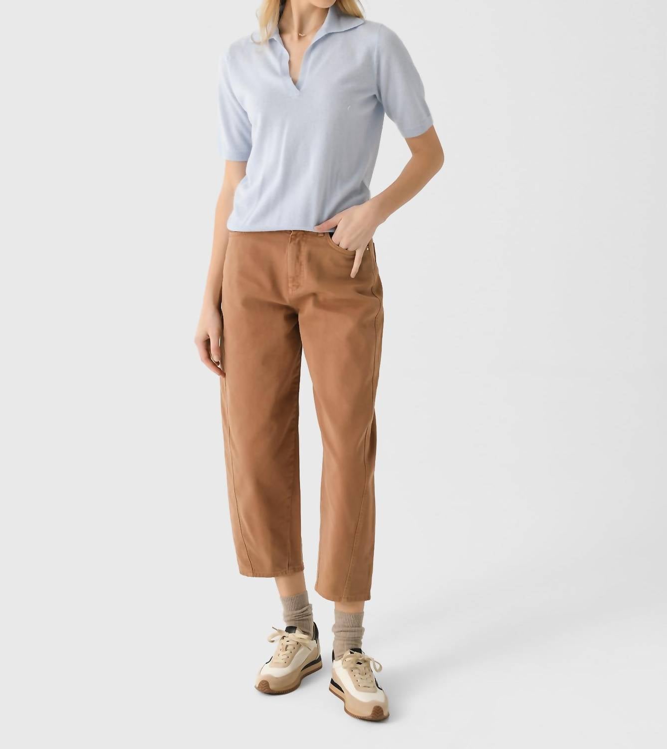 We especially love this cropped jean with a cute pair of slides or sandals. Introducing the Women's Caleb Jean by vanessabruno, a stunning boyfriend-style pair crafted from a blend of 99% cotton and 1% elastane for comfort and flexibility. Designed in a chic marron hue, these jeans feature a high rise with a wide leg silhouette and a cropped length for a flattering fit. The denim fabrication is enhanced with stitched details, a zip-fly closure, and 5-pocket styling with belt loops for added functionality. This classic fit is ideal for those seeking both style and comfort in their everyday wardrobe. Model is wearing size 36.
