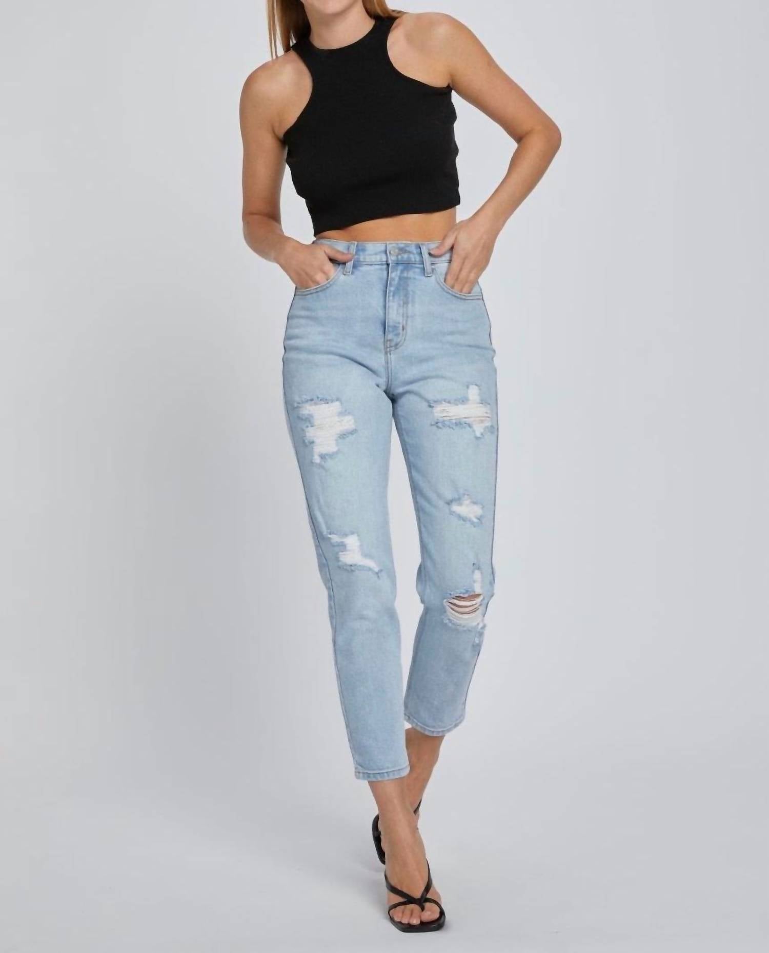 The perfect cropped jean for those transitional seasons. Elevate your denim collection with the High Rise Ankle Length Mom Jeans by CELLO, beautifully crafted in a Light Denim hue. Featuring a relaxed fit with a stylish tapered leg, these jeans boast a high rise with an 11.5" rise and a 28" inseam, perfectly complementing cropped tops. Made predominantly from a cotton blend (99% Cotton, 1% Spandex), they promise both quality and comfort. They come with a convenient button closure and are machine washable for easy care.