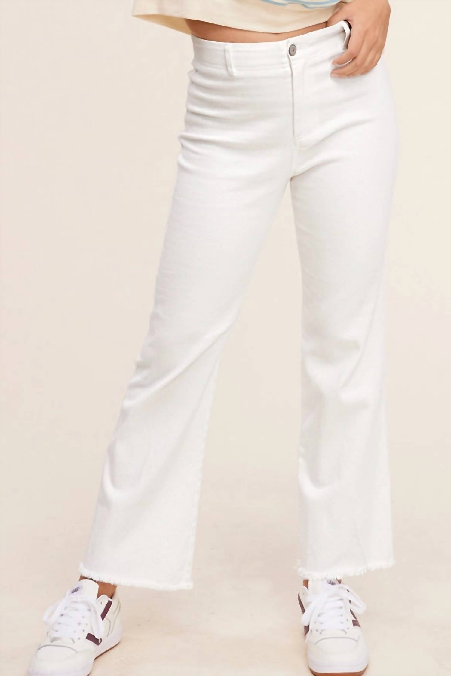 We especially love this cropped jean with a cute pair of slides or sandals. Step into style with the Frayed Hem Stretch Denim Jeans by LA MIEL, perfect for your spring travels or Thanksgiving outings. These women's jeans feature a high-rise fit and wide, flared legs with a relaxed fit that elegantly flatters a variety of silhouettes. Made from a soft, stretchy blend of 97% cotton and 3% spandex, they boast a solid white color with a trendy raw edge hem, while a button closure secures the fit. Care instructions include machine washing cold and line drying, ensuring they're easy to maintain and always ready for your next adventure.