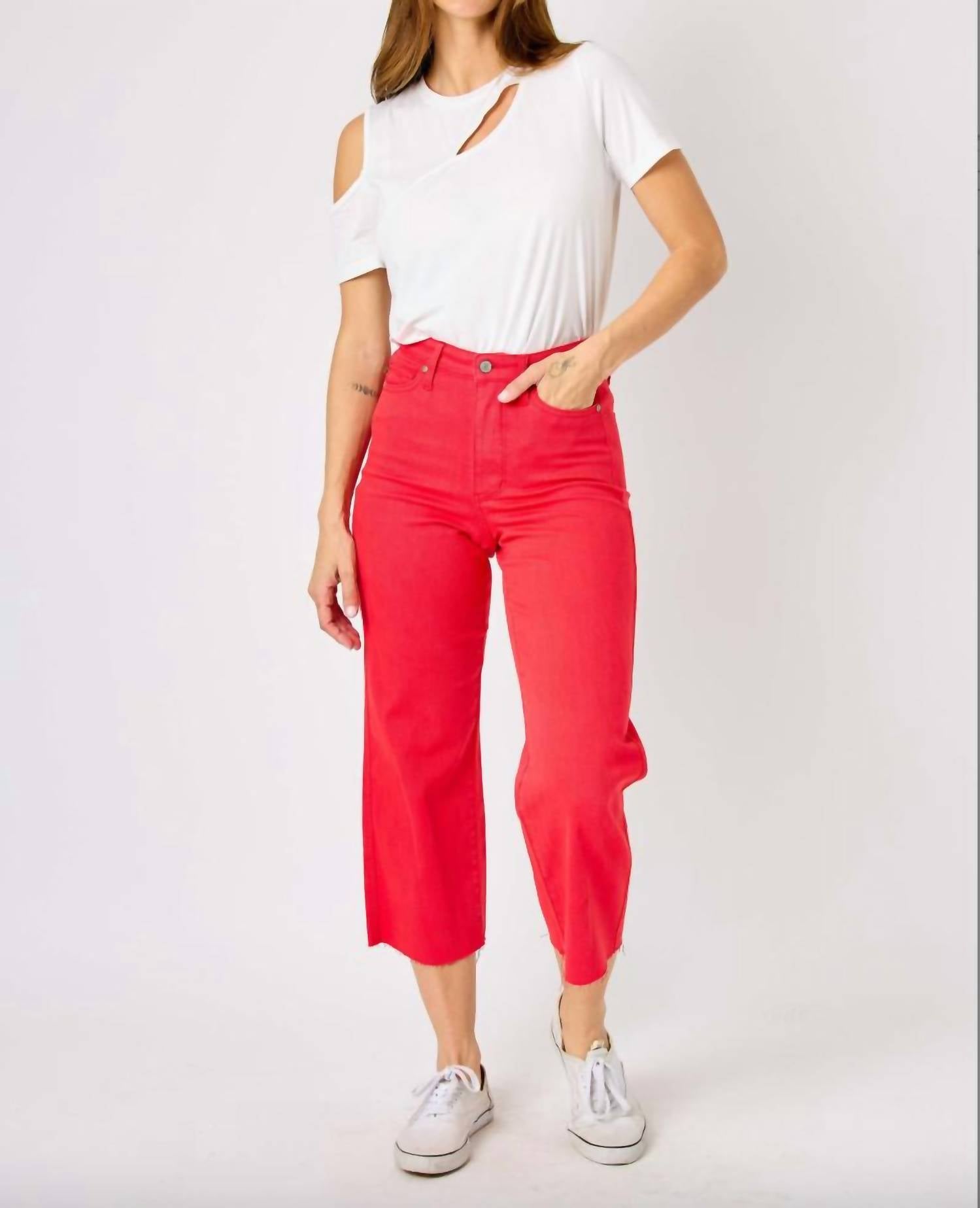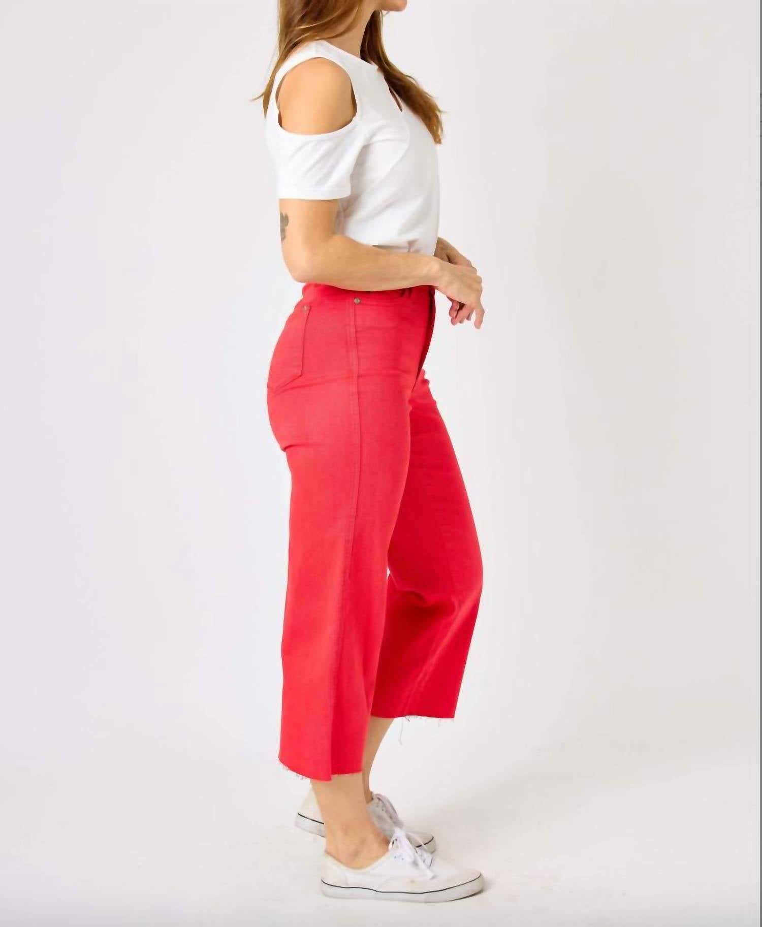 The perfect cropped jean for those transitional seasons. Meet the Judy Blue Tummy Control Wide Leg Crop Jeans, crafted in a vibrant red that exudes confidence. These ankle and cropped pants boast a high-rise waist with a button closure, providing a flattering tummy control fit. The wide leg and raw hem lend a modern twist to this solid-patterned, cotton blend garment, featuring a composition of 93% Cotton, 6% Polyester, and 1% Spandex. Care is easy with a machine wash and line dry routine. The jeans measure a rise of 11" and an inseam of 24.75", perfect for women seeking style and comfort in a regular fit.