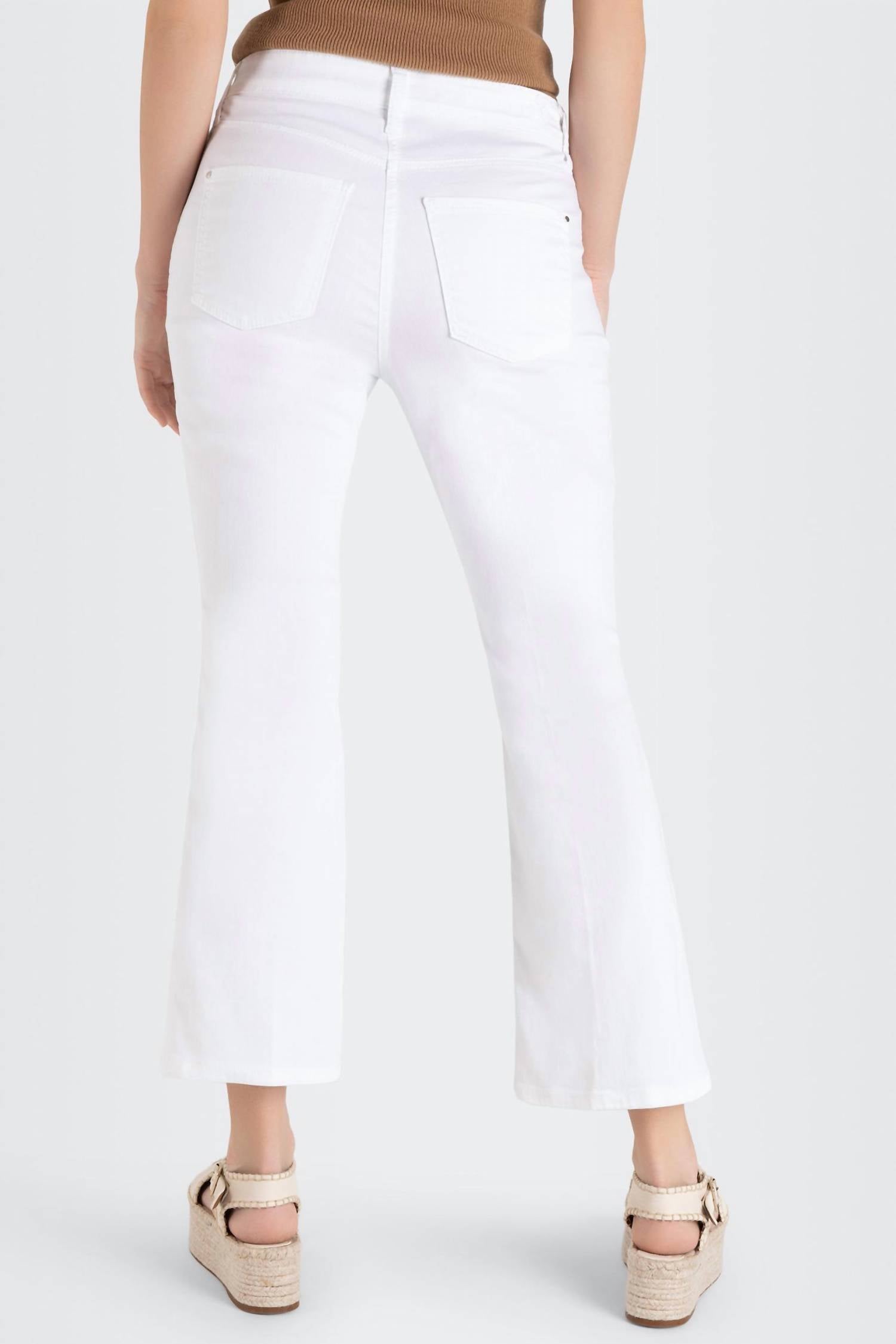 The perfect cropped jean for those transitional seasons. Meet the Dream Kick Authentic Jeans by MAC Jeans, an essential for any wardrobe with their stylish and versatile design. These women's ankle and cropped jeans are crafted from a cotton blend in a crisp white shade, featuring a textured pattern and offering a mid-rise fit. The jeans boast a straight leg with a slight flare at the hem, providing a contemporary touch, and are equipped with classic five-pocket styling for practicality. Closure: Button closure. For care, a machine wash is recommended, and they pair effortlessly with neutral-toned tops and platform sandals for a chic look.