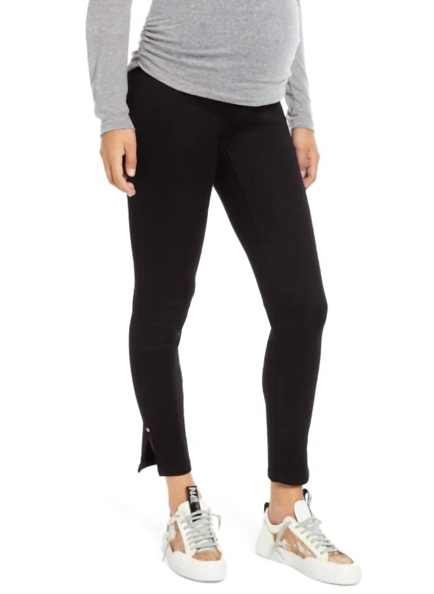 Elevate your maternity wardrobe with the Butter Ankle Slit Maternity Jeans by 1822 Denim. These stylish black skinny jeans, crafted from 79% cotton, 20% polyester, and 1% spandex, ensure comfort and flair for expectant mothers. With a high-rise stretch waist panel for a snug fit and a 27.5" inseam, they feature a pull-on closure and convenient back patch pockets. Designed with rivet-topped ankle slits, these jeans are a perfect blend of ease, elegance, and edge, easily cared for with a simple machine wash and tumble dry.
