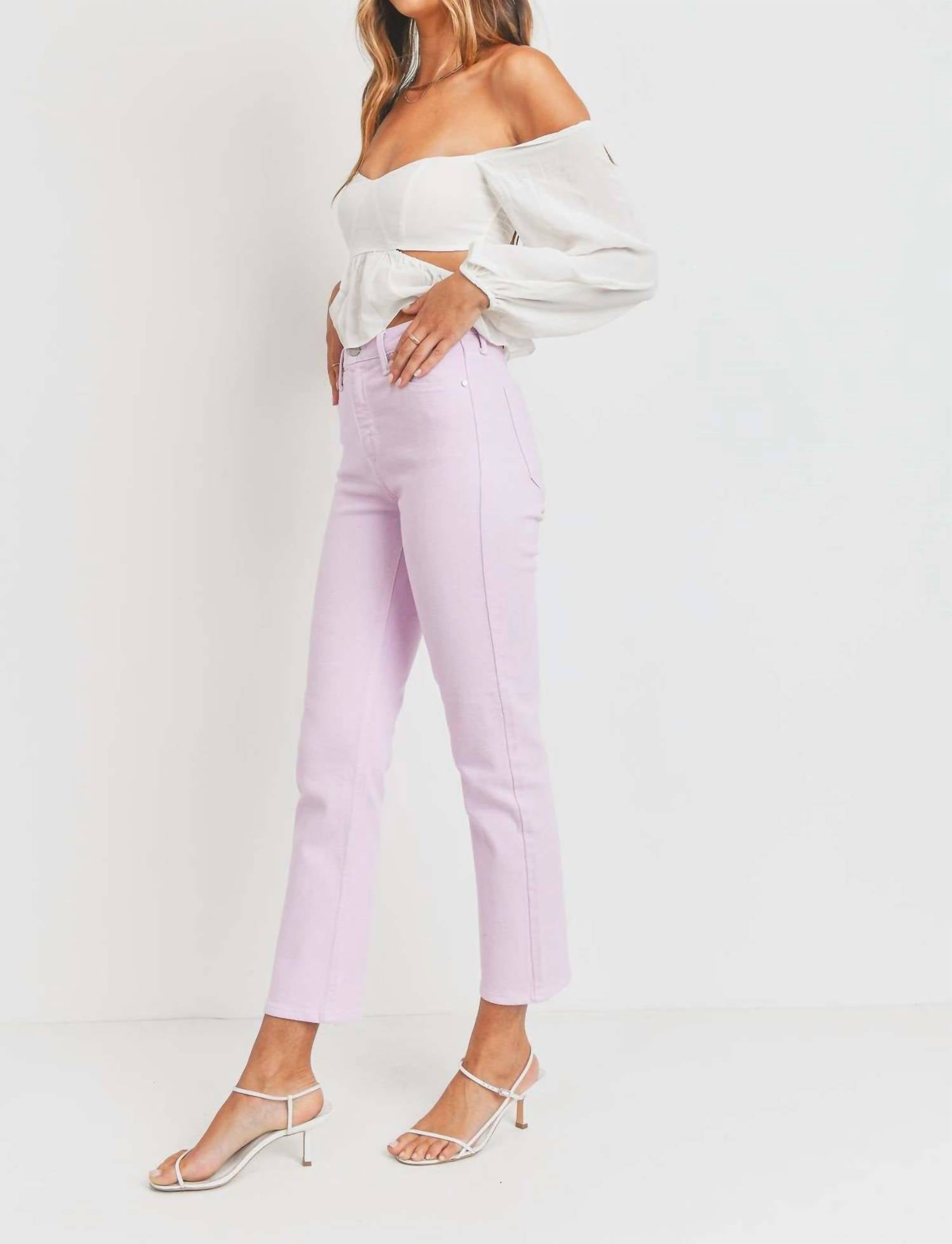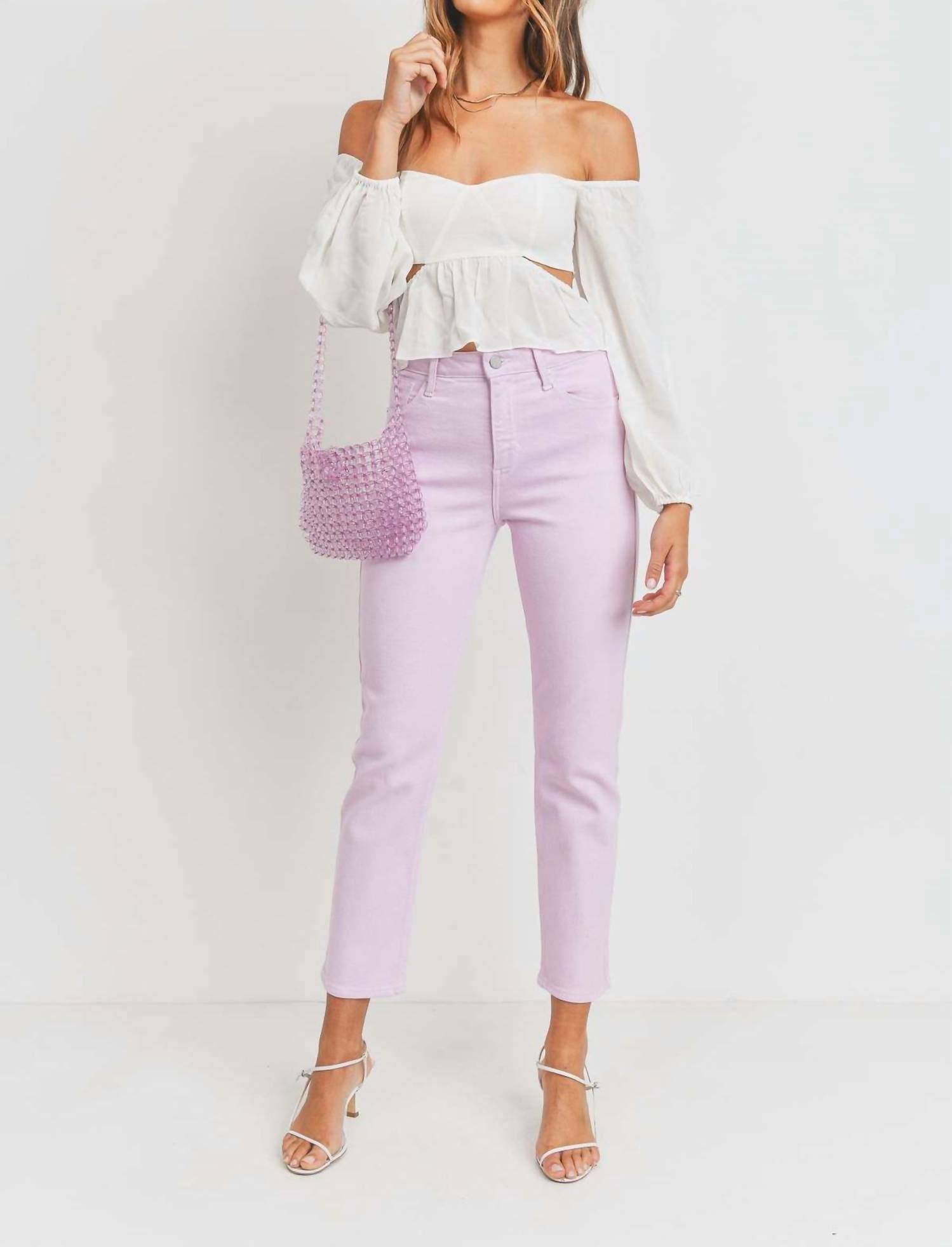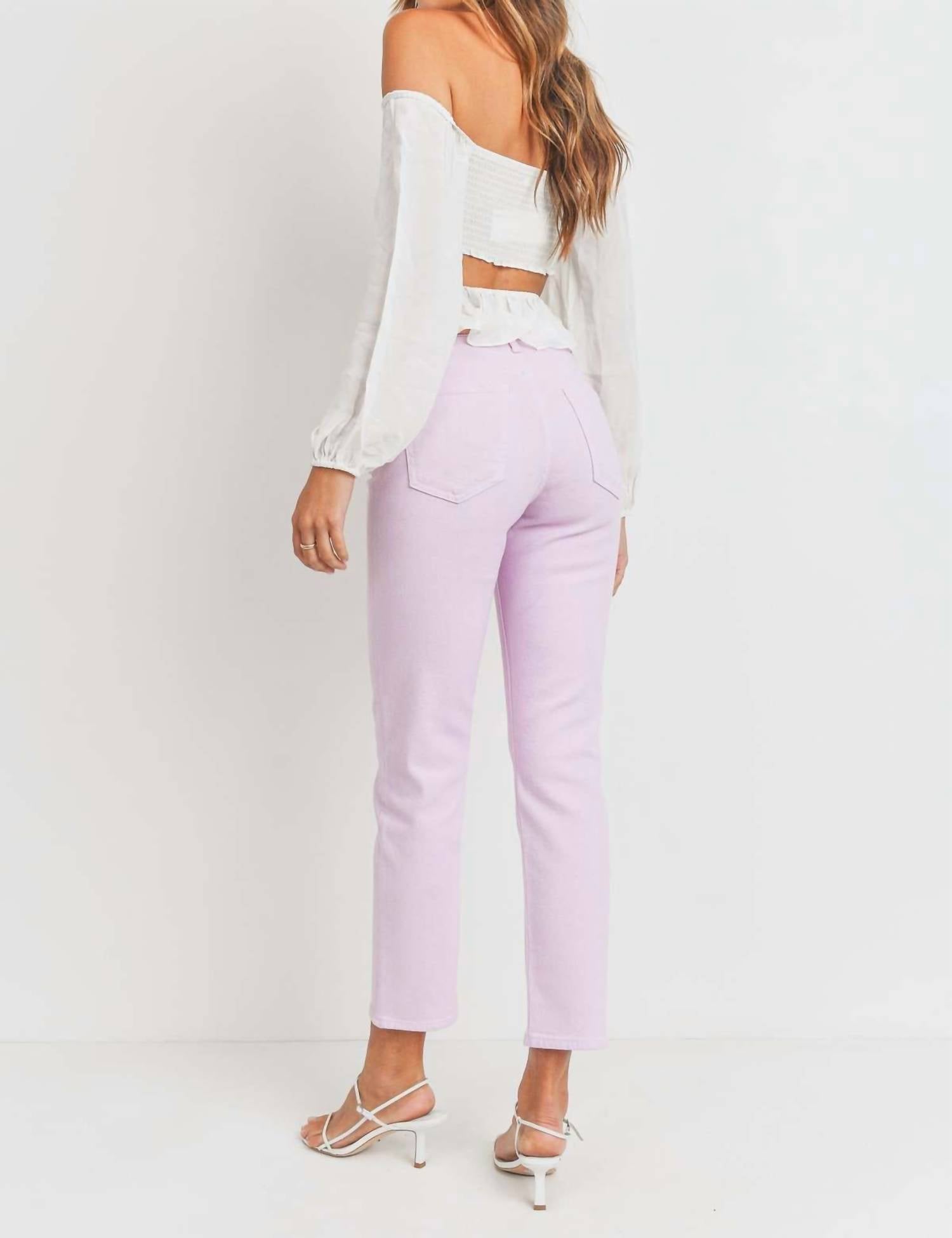 Introducing the Cigarette Jean by JUST BLACK DENIM, a classic high-rise jean in a stylish lavender hue. Crafted from a stretch denim blend of 98% Cotton and 2% Spandex, these jeans feature a contoured waist that slims and sculpts. With a straight leg and a rise of 10.5 inches, they offer a perfect classic fit and a solid pattern design. Made in the USA, these women's jeans have a zip closure and include pockets, while care is easy with machine wash and tumble dry instructions.