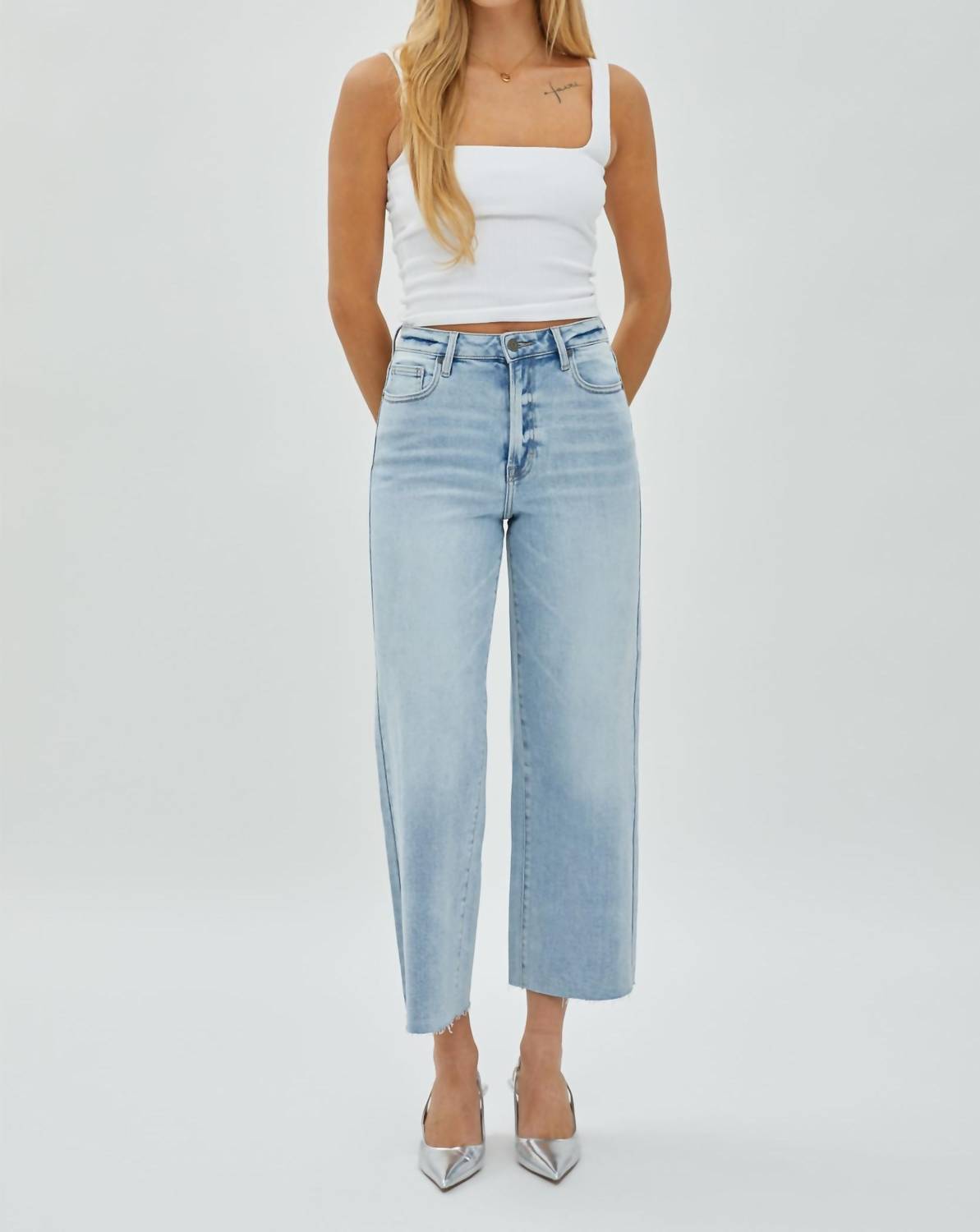 We especially love this cropped jean with a cute pair of slides or sandals. Introducing the Nori High Waist Cropped Wide Pants by HIDDEN, your go-to piece for a stylish, casual look. These light blue high-waisted jeans feature a relaxed fit with a playful cropped length of 27 inches, perfect for summer dinners. Crafted from clean stretch denim, they come with a zip closure, wide leg design, and practical pockets. Care: Machine wash and tumble dry, making them a hassle-free addition to your wardrobe.