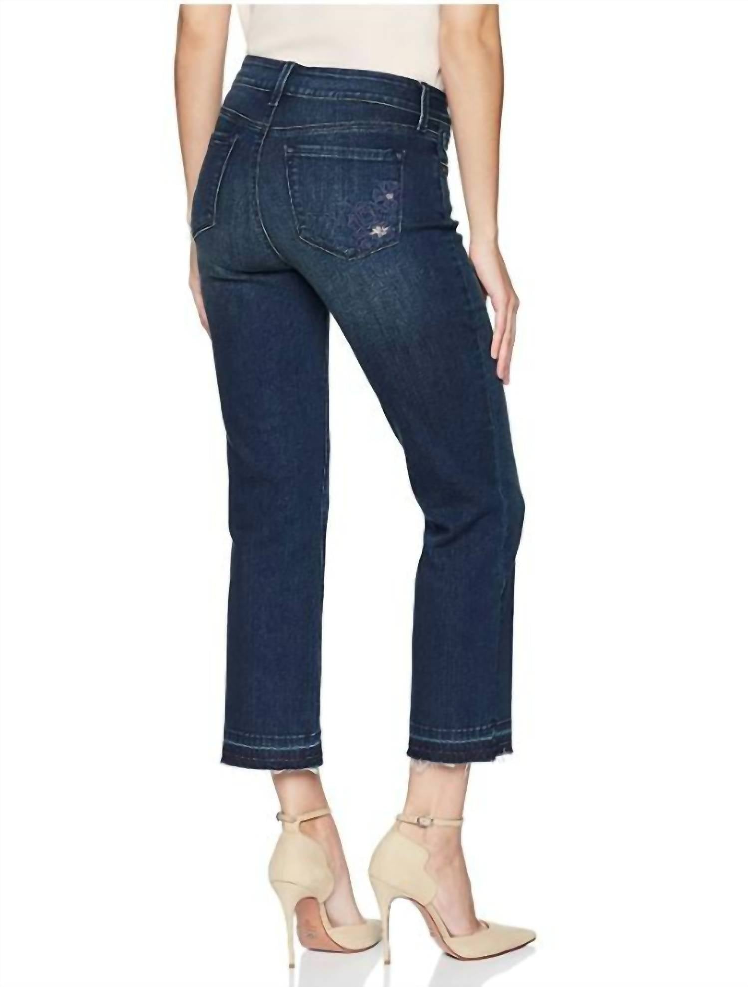 Introducing the NYDJ Marilyn Released Hem Embroidered Crop Jeans in Clean Beze. These women’s jeans feature a straight leg style and cropped length, perfect for showcasing sneakers or ankle boots. Crafted with a blend of 91% cotton, 7% polyester, and 2% elastane, they offer supersoft comfort and NYDJ's lift-tuck technology for a flattering fit. Design highlights include embroidered back pockets and a zip fly with button closure. Inseam measures 27", with a front rise of 10" and a back rise of 16". Leg opening at the hip is 11.25" and waist measures 15.5". Pockets: Five. Machine wash for easy care.
